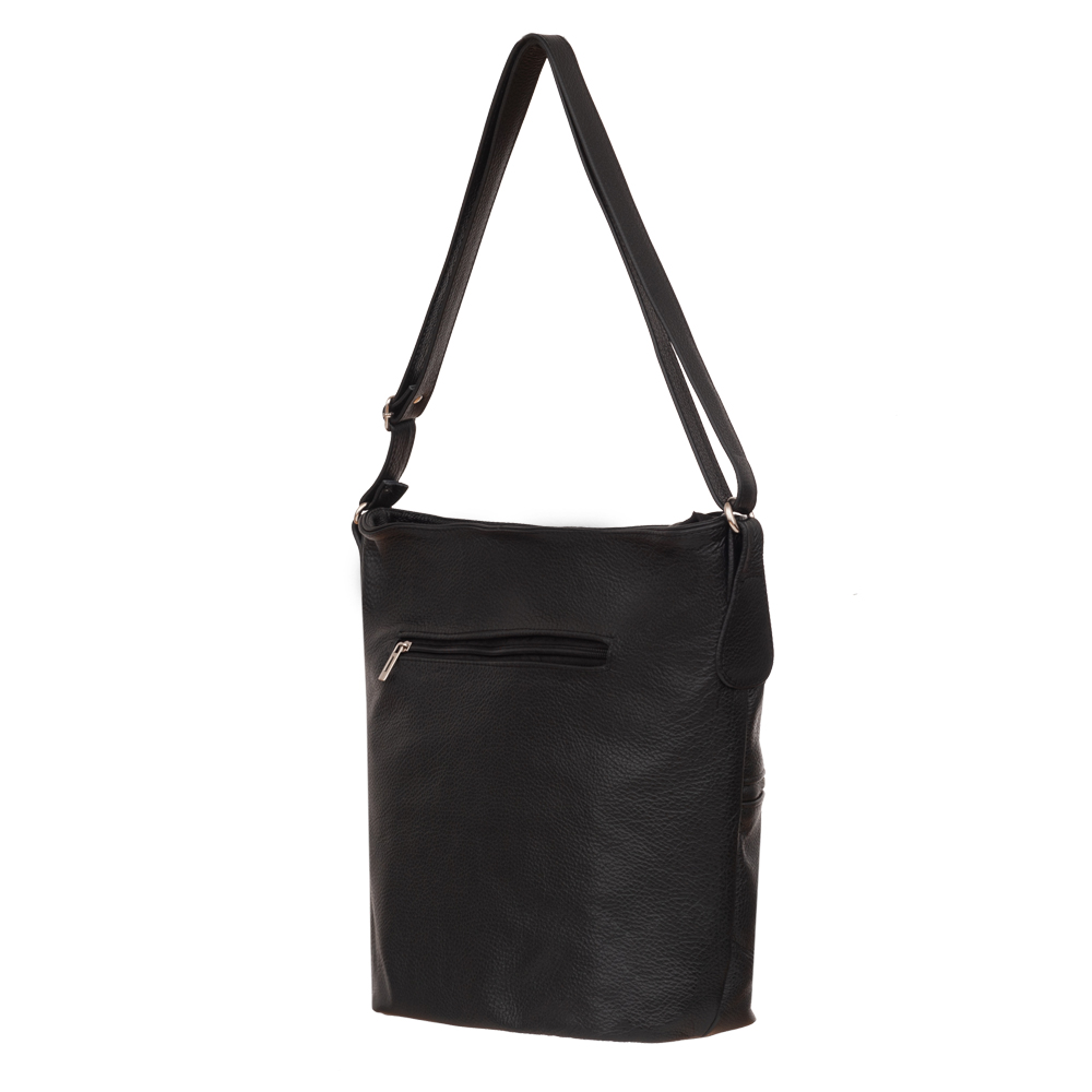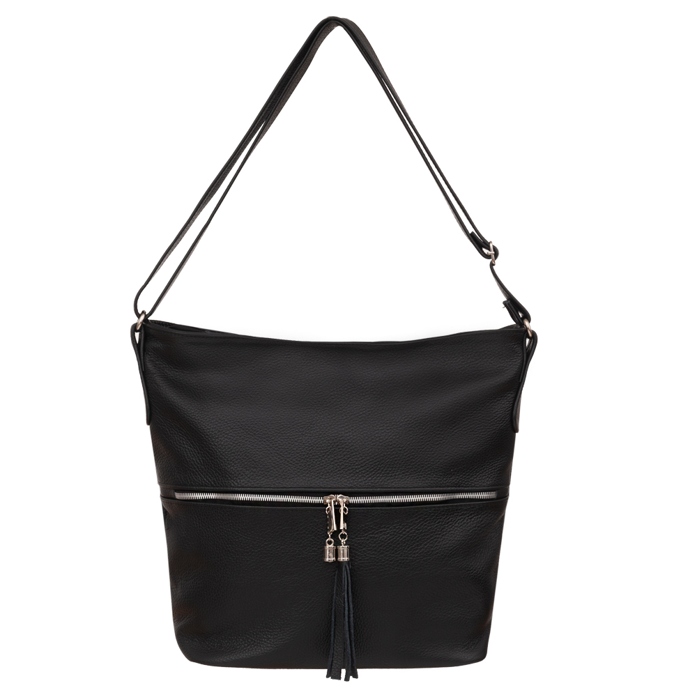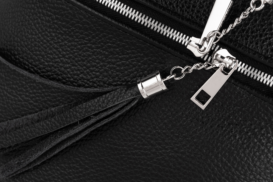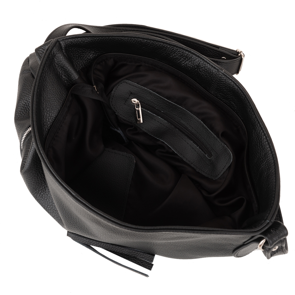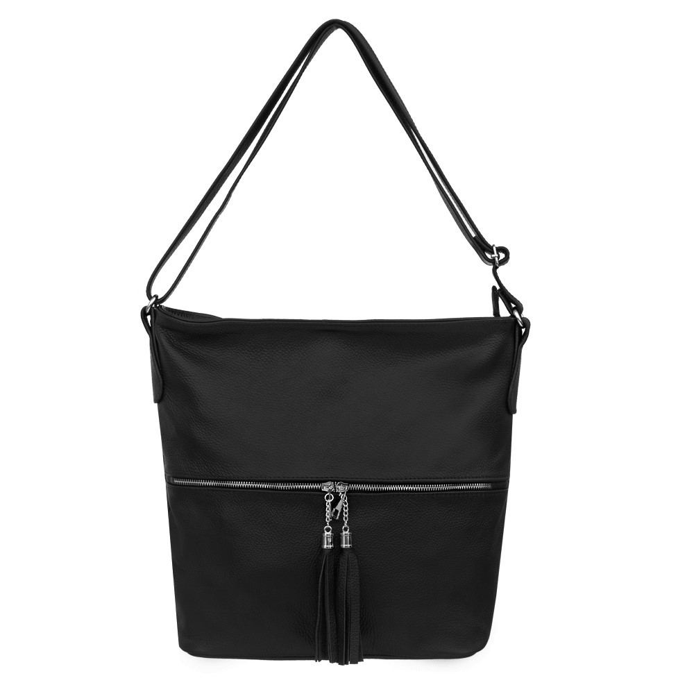 Skórzana A4 torebka wykonana w całości z miękkiej skóry naturalnej. Zamykana z góry na zamek na całej szerokości. Z przodu modne frędzle. Torebka jednokomorowa + wewnątrz dwie kieszonki na zamek, jedna na telefon + dodatkowa kieszeń na drobiazgi, klucze. Dodatkowo z tyłu kieszonka na suwak + kieszeń z przodu. Wnętrze wykończone trwałą, materiałową podszewką. Pasek z możliwością regulacji długości do 130 cm. Metalowe elementy w kolorze srebrnym. Dno torebki usztywnione.