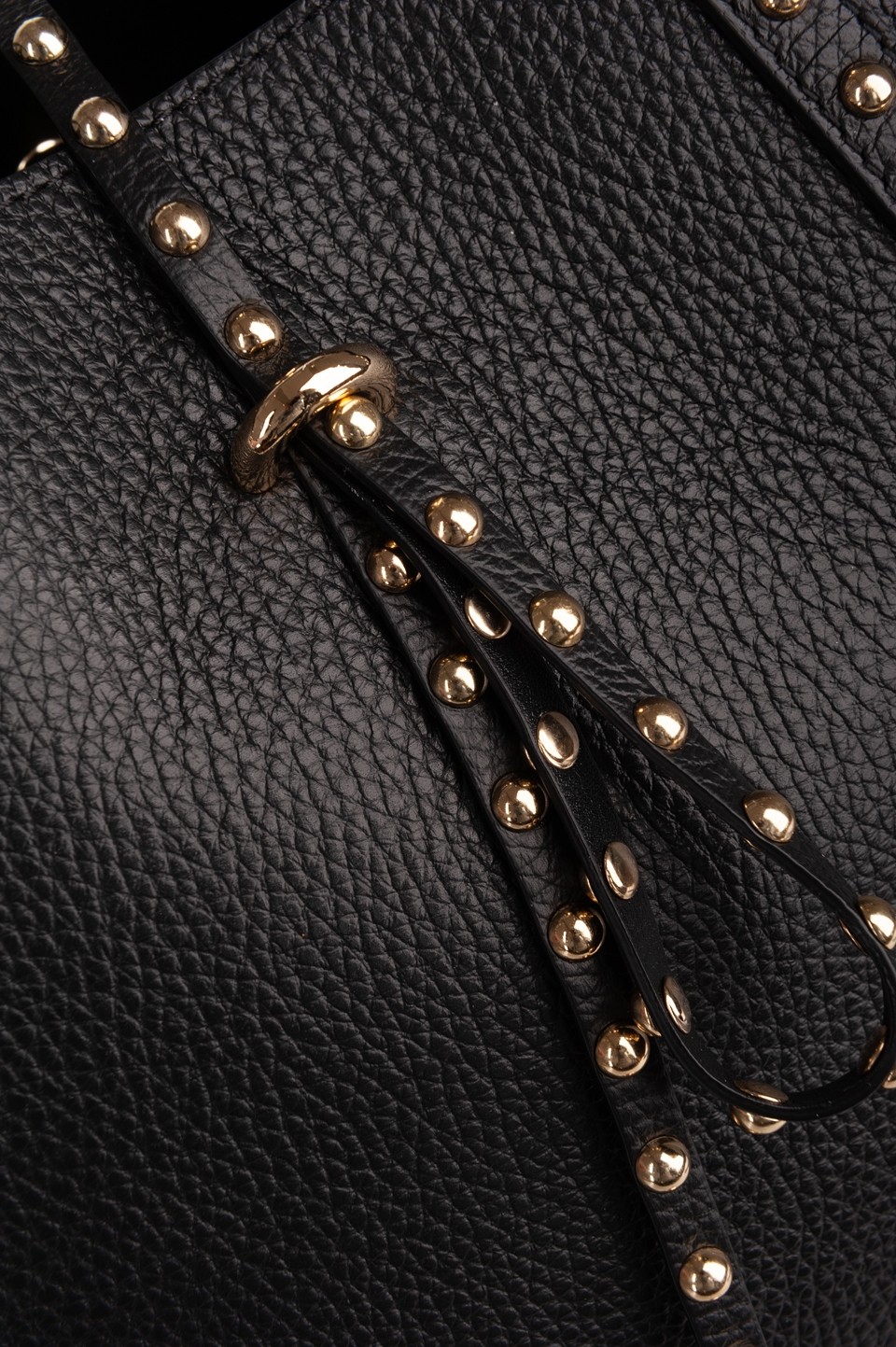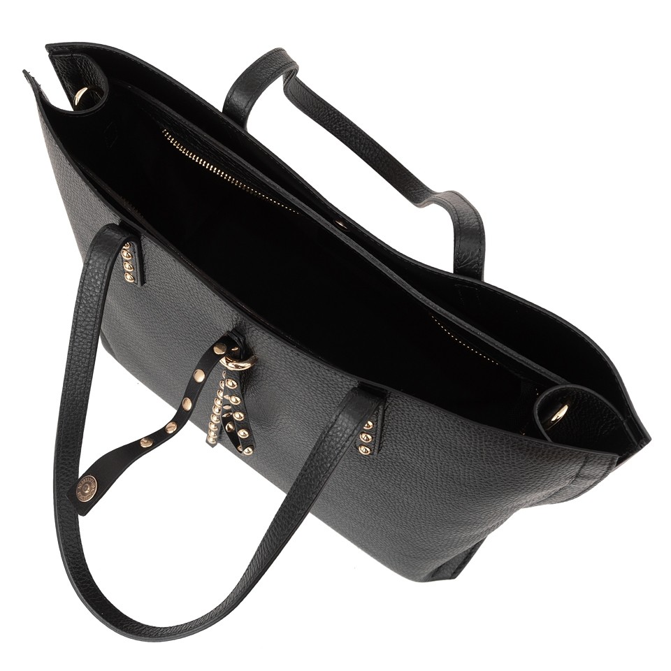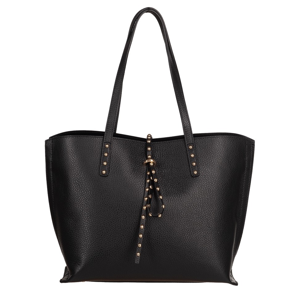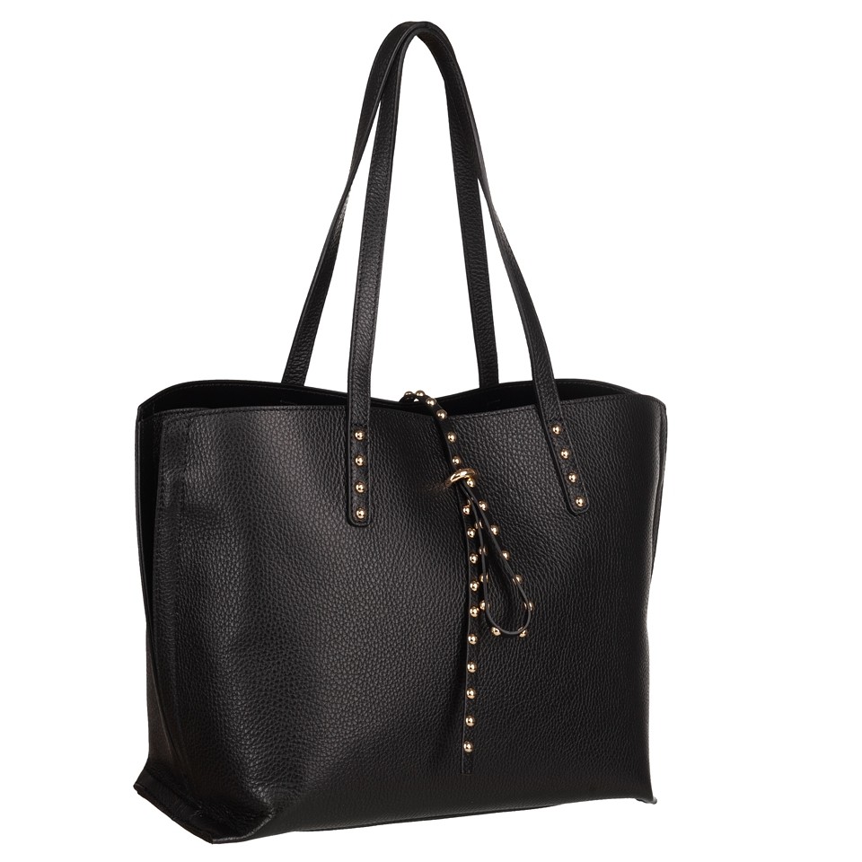 VERA PELLE włoska modna skórzana A4 torebka w kształcie zaokrąglonego trapezu z ozdobnymi dżetami wykonana z wysokogatunkowej naturalnej skóry. Wygodny dostęp do środka, łatwe zapięcie na magnes. Torebka jednokomorowa, od góry zamykana na zamek. Wewnątrz duża komora na zamek. Torebka od środka wykończona mocną podszewką. Metalowe elementy w kolorze złotym. Dno usztywnione i podbite metalowymi nóżkami chroniącymi spód przed zabrudzeniem i uszkodzeniami. Torebką swobodnie można nosić na ramieniu, a w komplecie mamy dodatkowy długi pasek z możliwością regulowania długości.