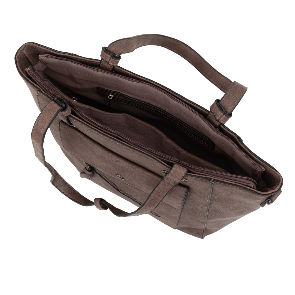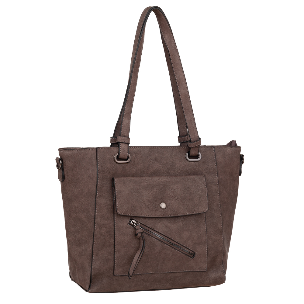 Modna, klasyczna A4 torebka wykonana z wysokogatunkowej gładkiej skóry ekologicznej wysokiej jakości. Zamykana z góry na zamek na całej szerokości. Torebka jednokomorowa, zorganizowana w środku i przedzielona dużą kieszenią na zamek. Wewnątrz 2 kieszonki na zamek, jedna na telefon + dodatkowa kieszeń na drobiazgi. Wnętrze wykończone trwałą, materiałową podszewką. Dodatkowo z tyłu torebki kieszonka na suwak + z przodu kieszeń na zamek i pod klapą na magnes. Torebka od spodu usztywniona. Elementy wykończenia w kolorze srebrnym (inox). W komplecie długi regulowany pasek na ramię o długości max. 115 cm.