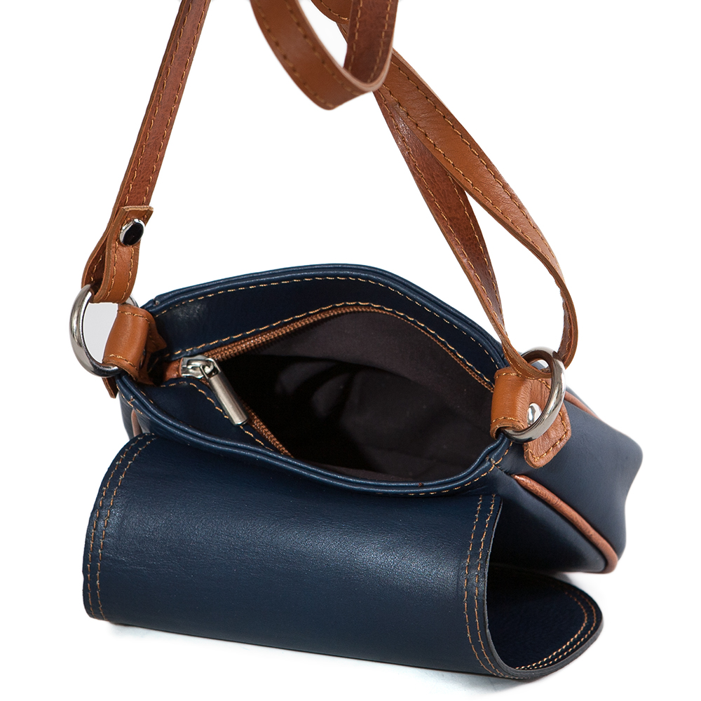 Włoska skórzana listonoszka wykonana z wysokogatunkowej naturalnej gładkiej skóry cielęcej. Zamykana na dużą klapę na magnes + suwak. Torebka jednokomorowa, wewnątrz jedna kieszonka na zamek. Wnętrze wykończone trwałą podszewką. Długi, regulowany pasek umożliwia wygodne noszenie na ramieniu.