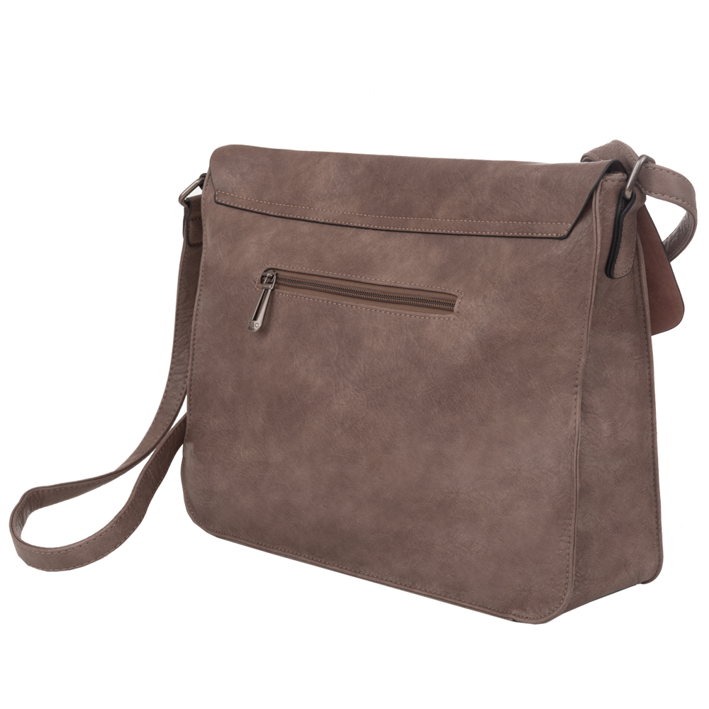 Modna torebka A4 wykonana z wysokogatunkowej miękkiej skóry ekologicznej najwyższej jakości. Zamykana na zamek na całej szerokości + klapa na dwa magnesy. Torba jednokomorowa + w środku kieszonka na zamek oraz jedna na telefon + kieszonka wsuwna na klucze, drobiazgi. Wnętrze wykończone trwałą, materiałową podszewką kolorystycznie dopasowaną do skóry. Szerokie wygodne, regulowane ucho do noszenia na ramieniu. Dodatkowa pojemna kieszonka na zamek z tyłu. Srebrne metalowe dodatki.