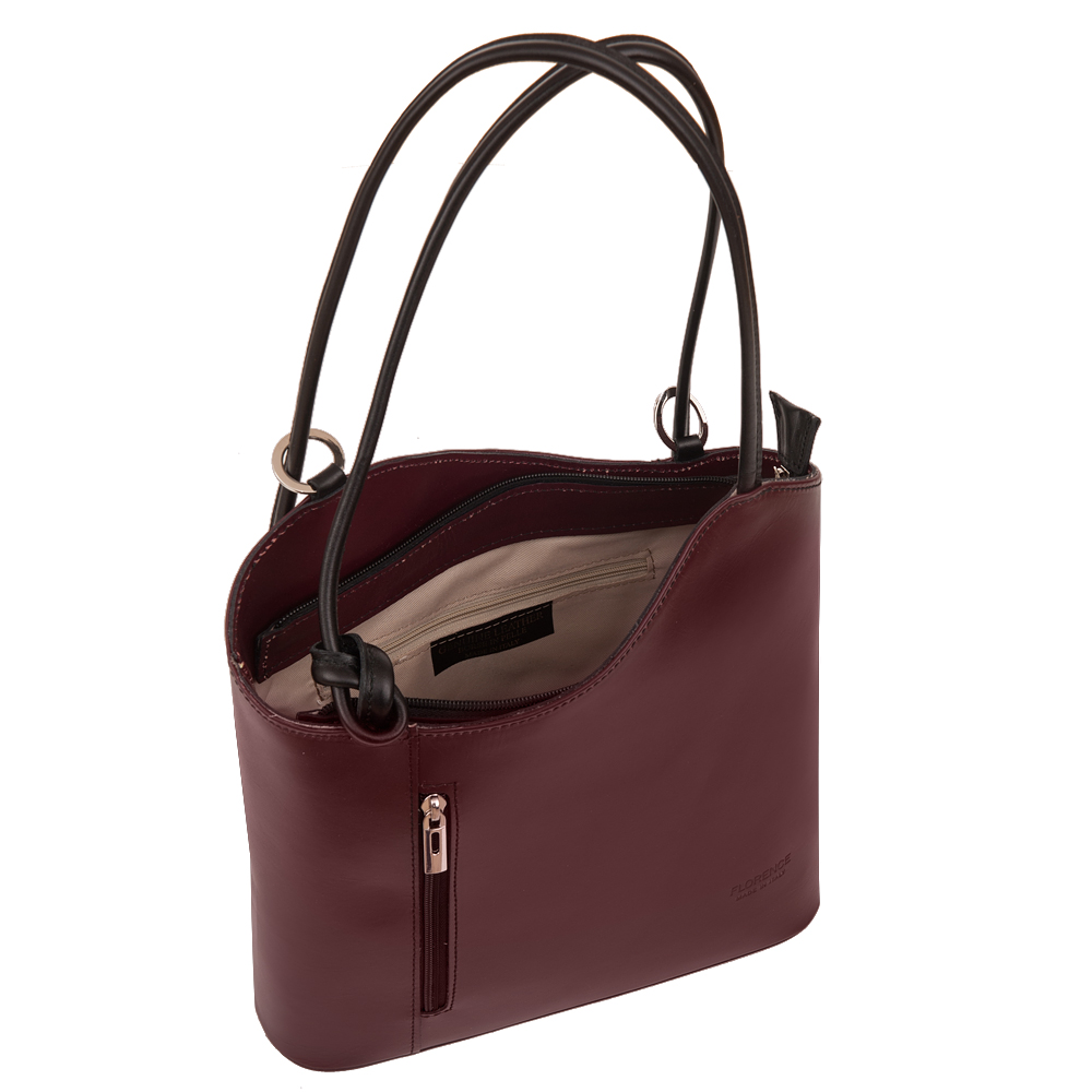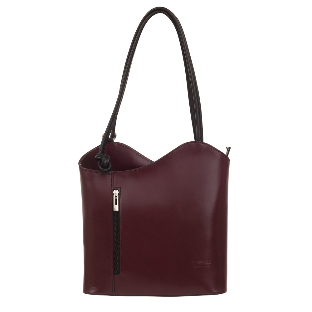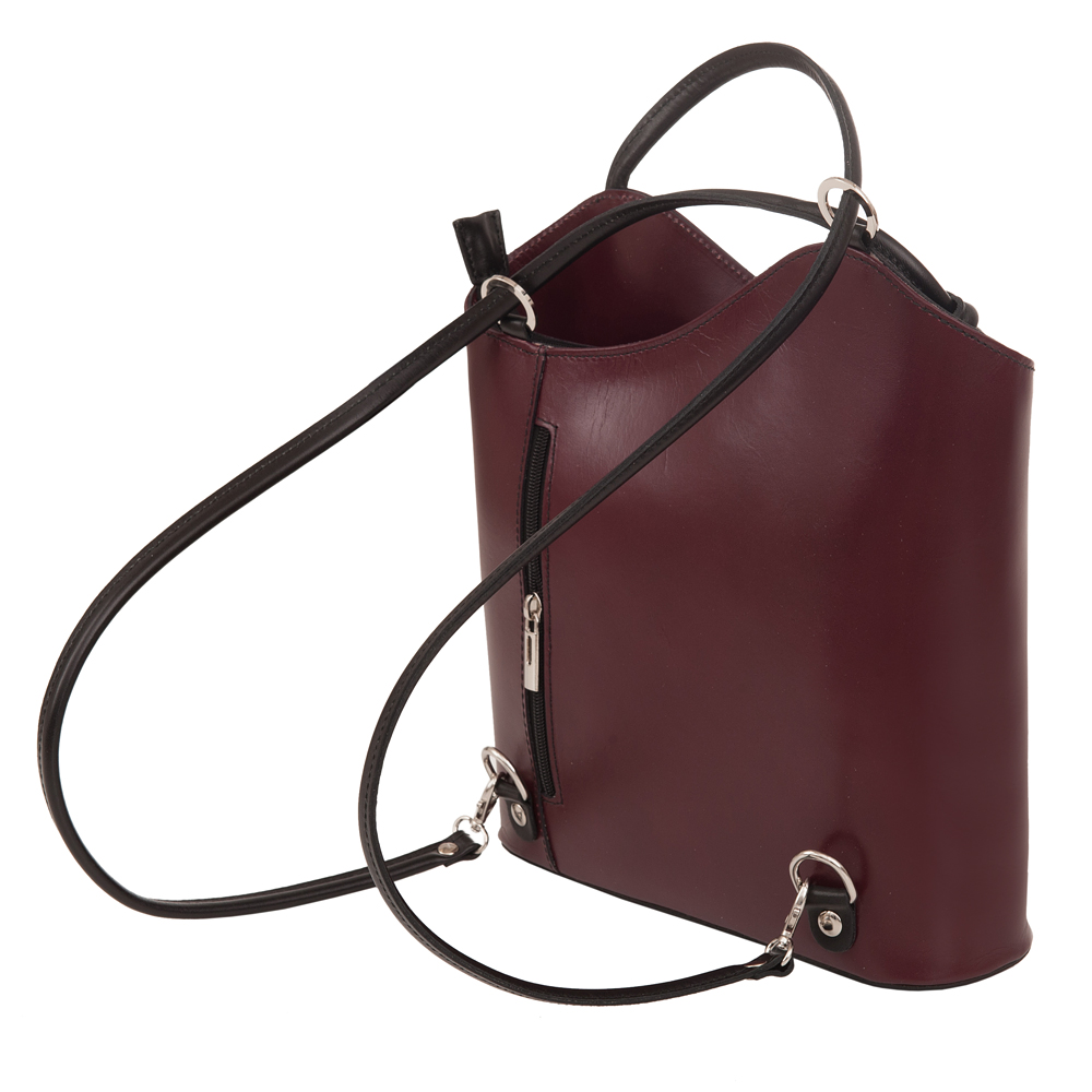 Vera Pelle - Włoska asymetryczna skórzana torebka wykonana z wysokogatunkowej naturalnej gładkiej skóry licowej. Zamykana z góry na suwak. Torebka jednokomorowa przedzieloną dużą kieszenią na suwak. Wewnątrz jedna kieszonka na zamek oraz jedna na telefon. Wnętrze wykończone trwałą podszewką. Dodatkowo z przodu i z tyłu torebki pionowa kieszonka na suwak. Torebka od spodu usztywniona. Elementy wykończenia w kolorze srebrnym. Po zaciągnięciu długich uszu można nosić torebkę jako plecak. Uszy można regulować na długość 56 - 80 cm.