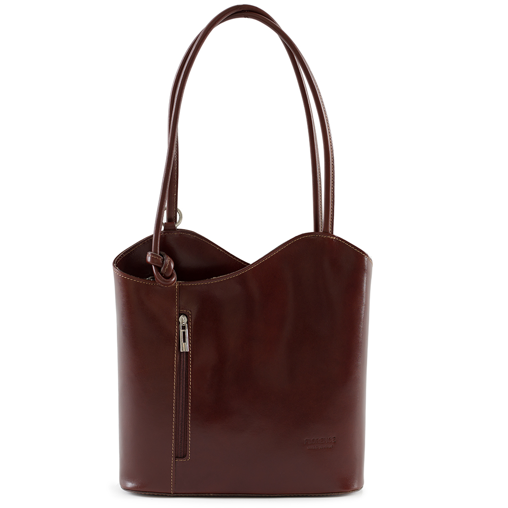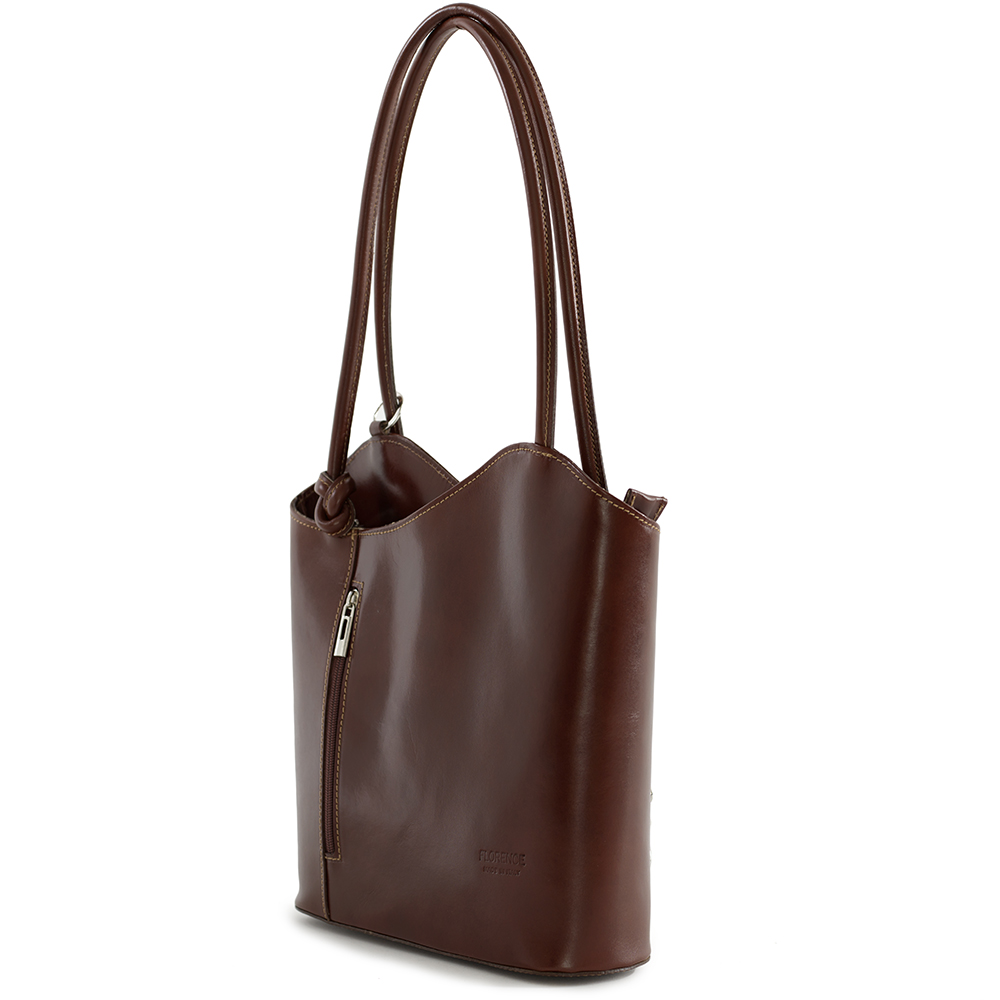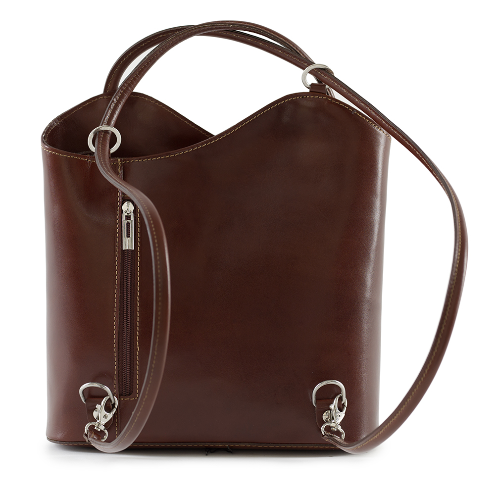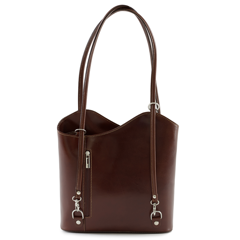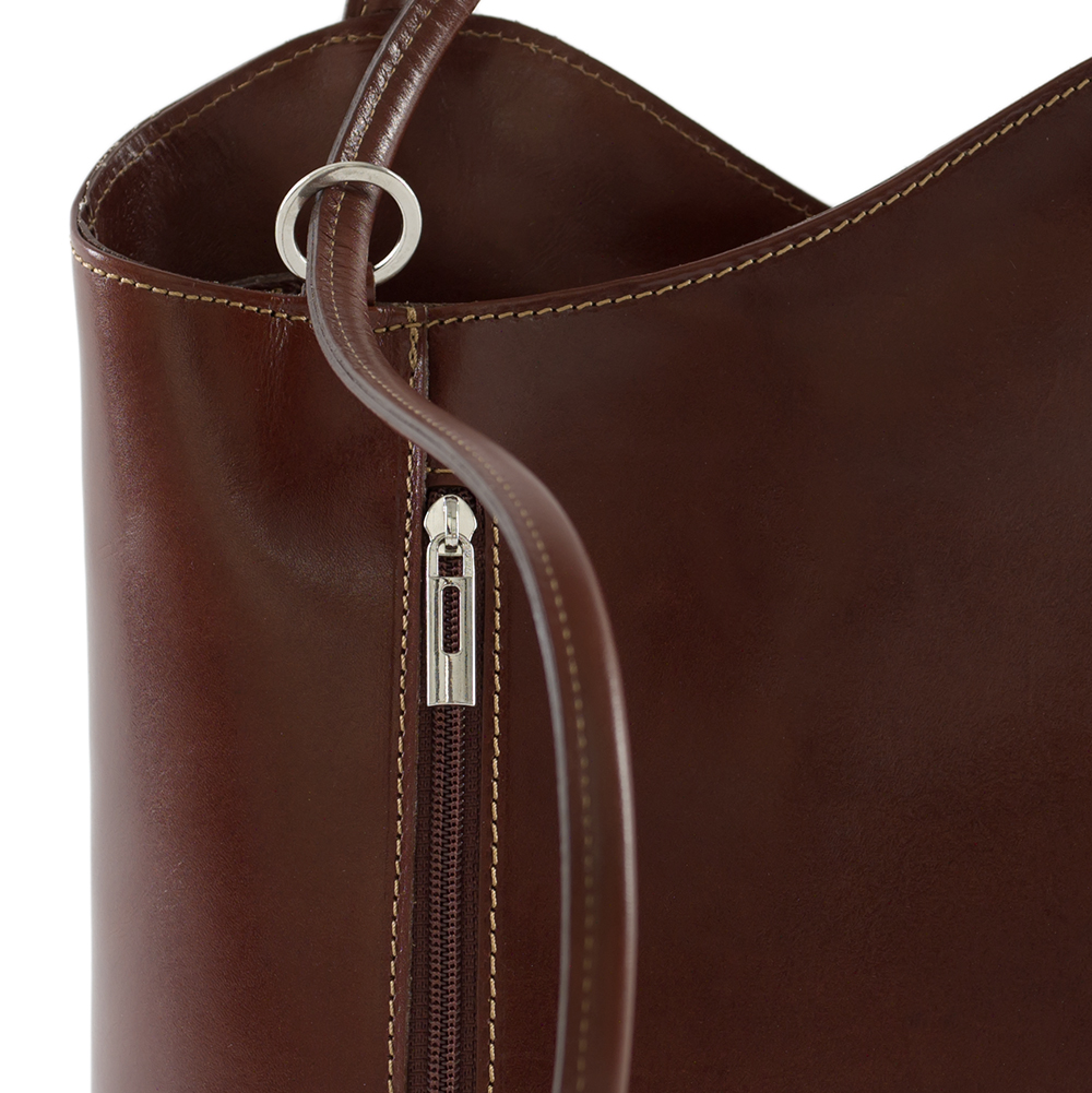 Vera Pelle - Włoska asymetryczna skórzana torebka wykonana z wysokogatunkowej naturalnej gładkiej skóry licowej. Zamykana z góry na suwak. Torebka jednokomorowa przedzieloną dużą kieszenią na suwak. Wewnątrz jedna kieszonka na zamek oraz jedna na telefon. Wnętrze wykończone trwałą podszewką. Dodatkowo z przodu i z tyłu torebki pionowa kieszonka na suwak. Torebka od spodu usztywniona. Elementy wykończenia w kolorze srebrnym. Po zaciągnięciu długich uszu można nosić torebkę jako plecak. Uszy można regulować na długość 56 - 80 cm.