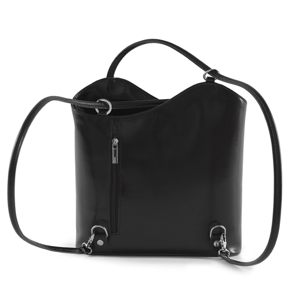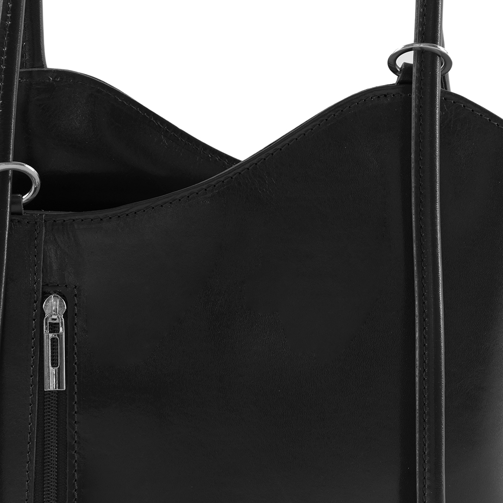 Vera Pelle - Włoska asymetryczna skórzana torebka wykonana z wysokogatunkowej naturalnej gładkiej skóry licowej. Zamykana z góry na suwak. Torebka jednokomorowa przedzieloną dużą kieszenią na suwak. Wewnątrz jedna kieszonka na zamek oraz jedna na telefon. Wnętrze wykończone trwałą podszewką. Dodatkowo z przodu i z tyłu torebki pionowa kieszonka na suwak. Torebka od spodu usztywniona. Elementy wykończenia w kolorze srebrnym. Po zaciągnięciu długich uszu można nosić torebkę jako plecak. Uszy można regulować na długość 56 - 80 cm.