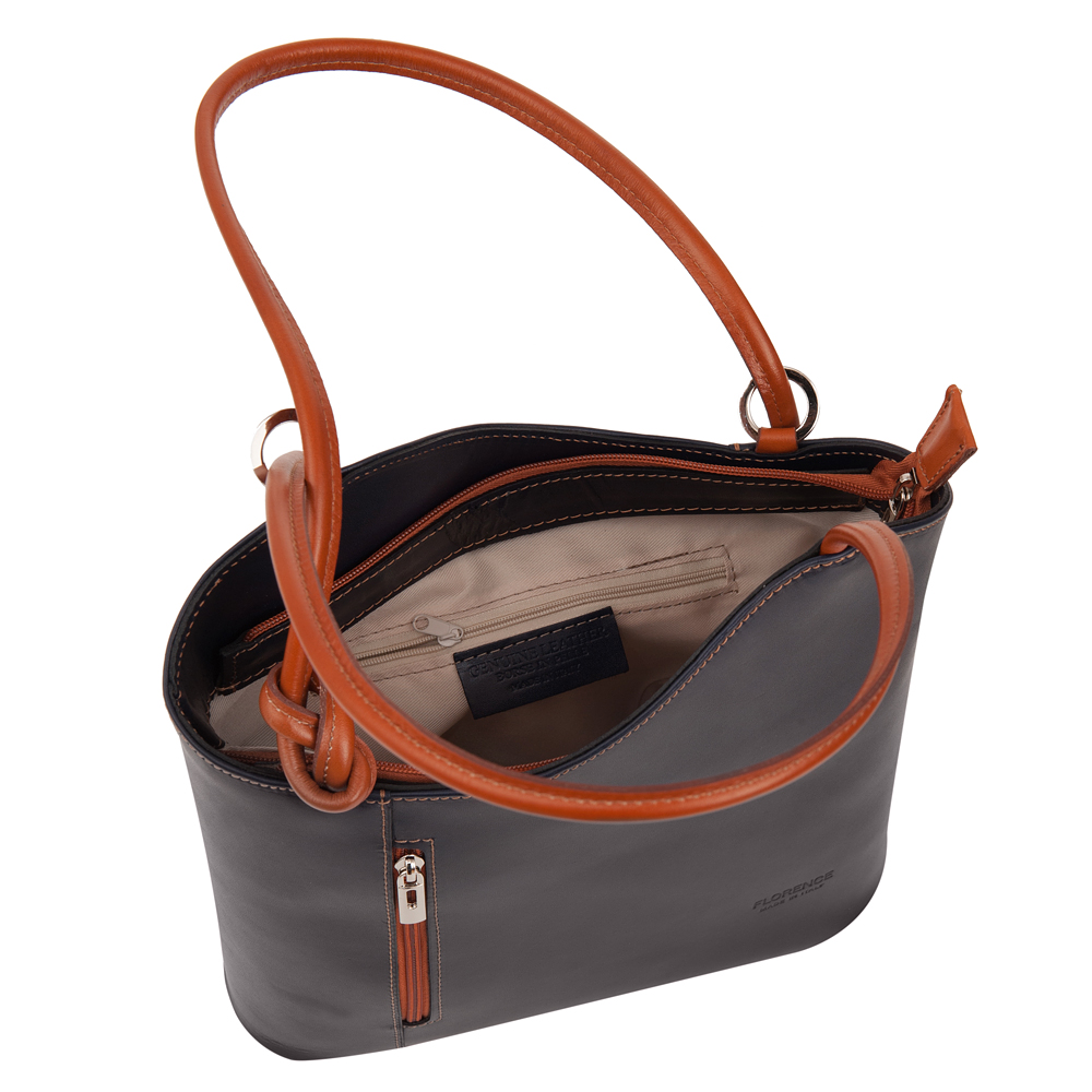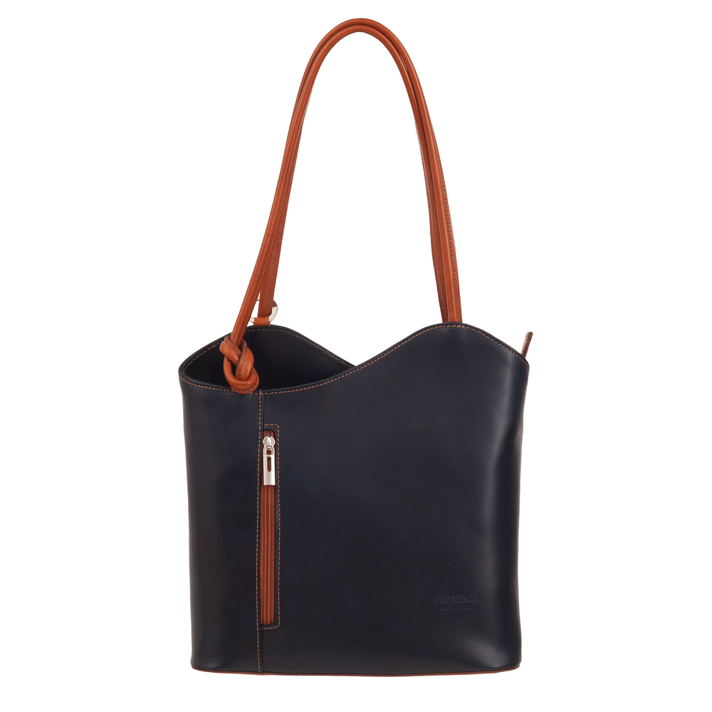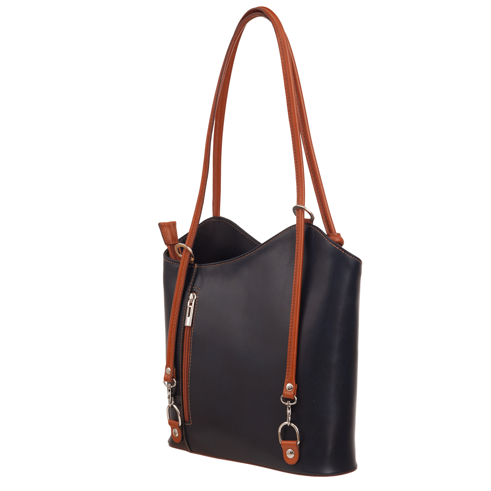 Włoska asymetryczna skórzana torebka wykonana z wysokogatunkowej naturalnej gładkiej skóry licowej. Zamykana z góry na suwak. Torebka jednokomorowa przedzieloną dużą kieszenią na suwak. Wewnątrz jedna kieszonka na zamek oraz jedna na telefon. Wnętrze wykończone trwałą podszewką. Dodatkowo z przodu i z tyłu torebki pionowa kieszonka na suwak. Torebka od spodu usztywniona. Elementy wykończenia w kolorze srebrnym. Po zaciągnięciu długich uszu można nosić torebkę jako plecak. Uszy można regulować na długość 56 - 80 cm.