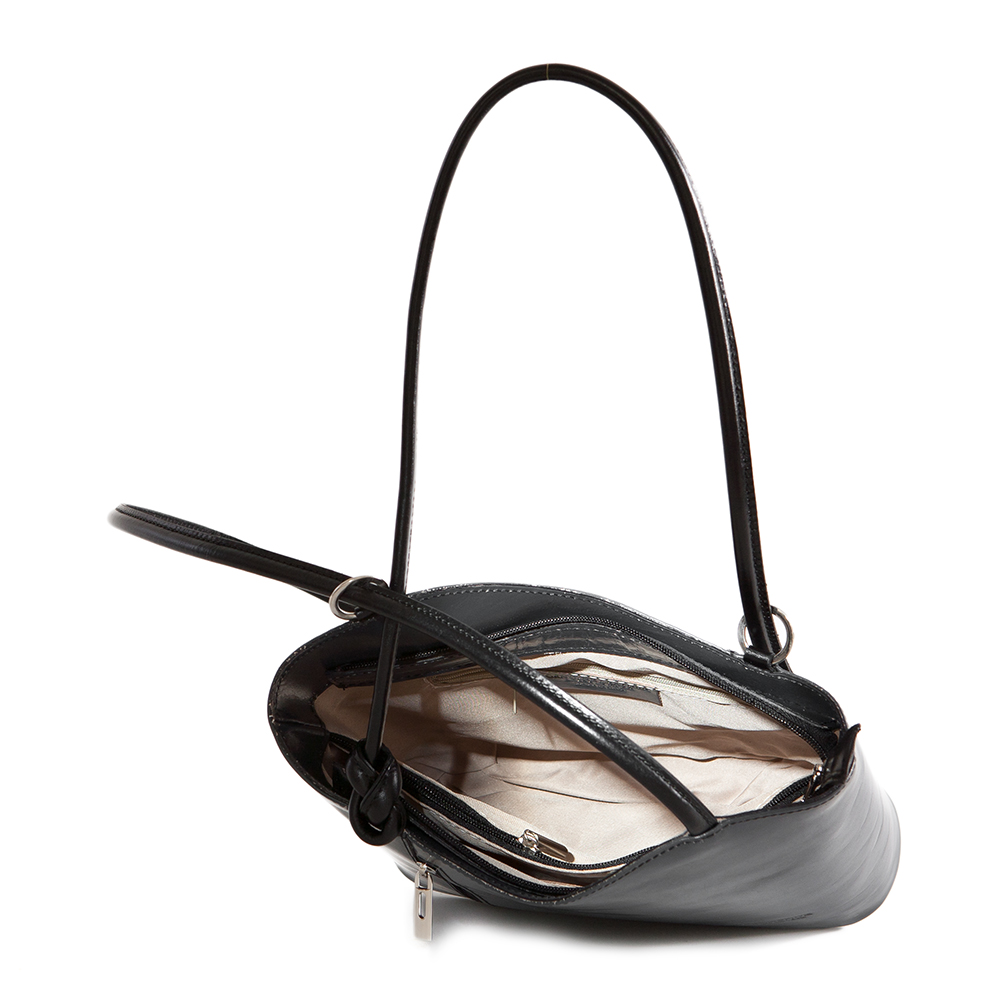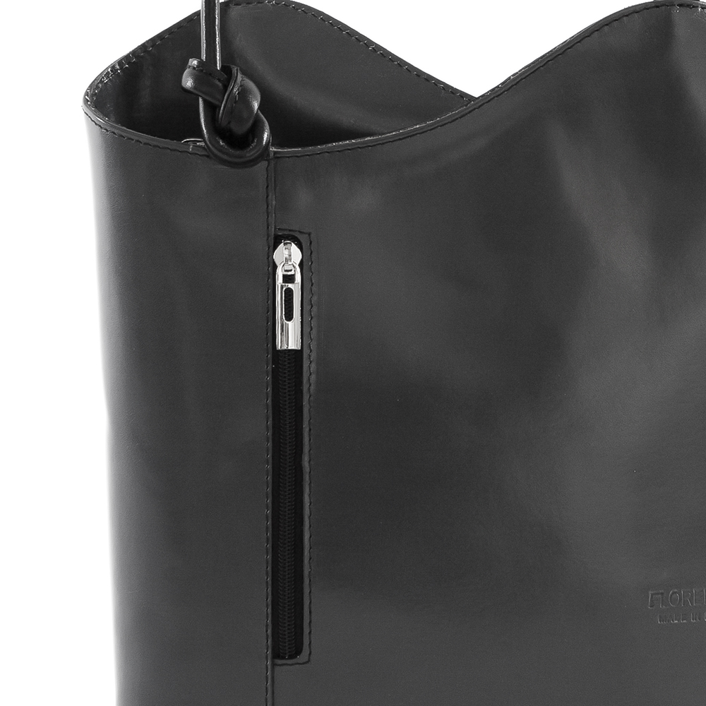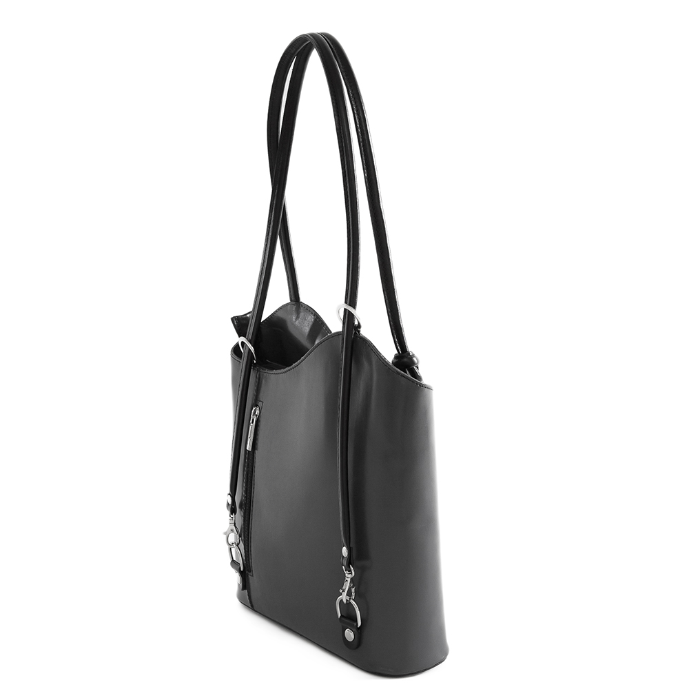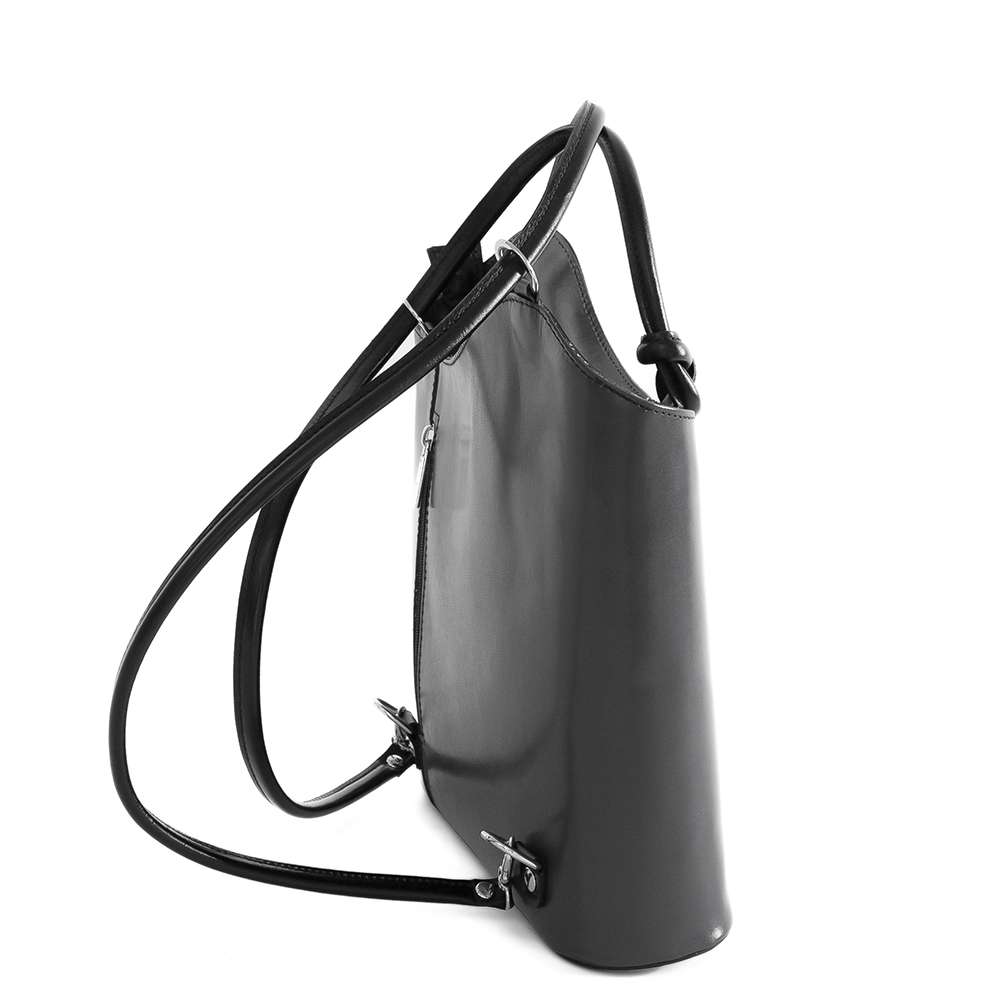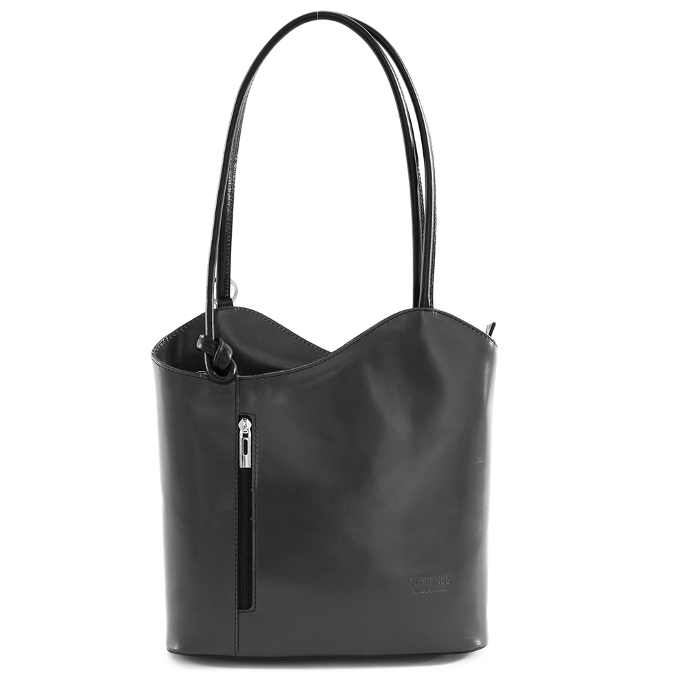 Vera Pelle - Włoska asymetryczna skórzana torebka wykonana z wysokogatunkowej naturalnej gładkiej skóry licowej. Zamykana z góry na suwak. Torebka jednokomorowa przedzieloną dużą kieszenią na suwak. Wewnątrz jedna kieszonka na zamek oraz jedna na telefon. Wnętrze wykończone trwałą podszewką. Dodatkowo z przodu i z tyłu torebki pionowa kieszonka na suwak. Torebka od spodu usztywniona. Elementy wykończenia w kolorze srebrnym. Po zaciągnięciu długich uszu można nosić torebkę jako plecak. Uszy można regulować na długość 56 - 80 cm.