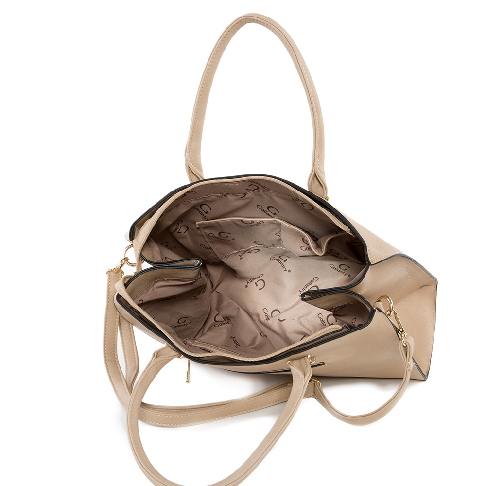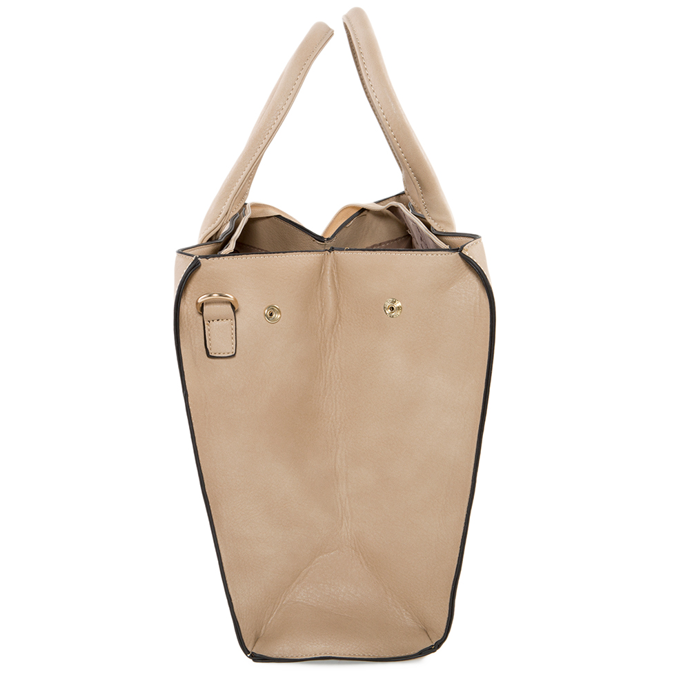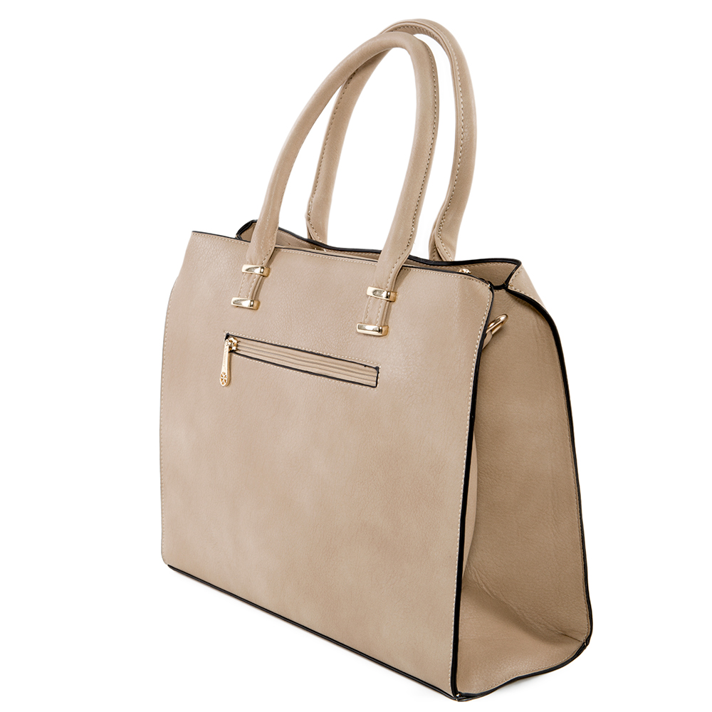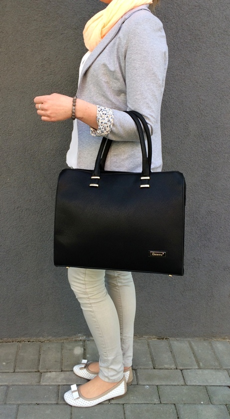 Modna, klasyczna skórzana torebka wykonana z wysokogatunkowej gładkiej skóry ekologicznej wysokiej jakości. Zamykana z góry na suwak na całej szerokości. Torebka jednokomorowa. Wewnątrz trzy kieszonki na zamek, jedna na telefon + dodatkowa kieszeń na drobiazgi. Wnętrze wykończone trwałą, ciemną podszewką. Dodatkowo z tyłu torebki kieszonka na suwak. Torebka od spodu usztywniona oraz podbita nóżkami, co chroni ją przeciw uszkodzeniom i zadrapaniom. Elementy wykończenia w kolorze złotym.