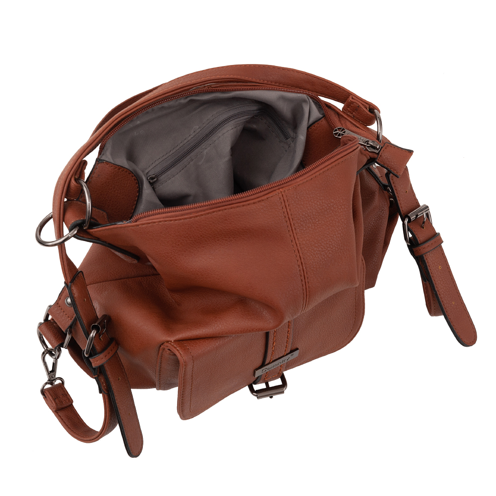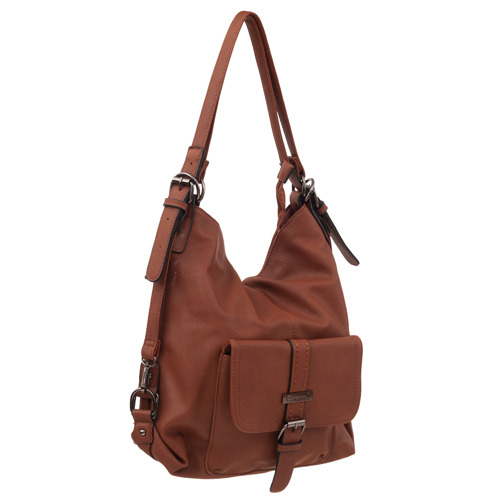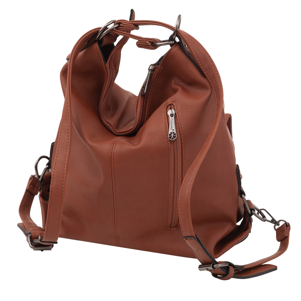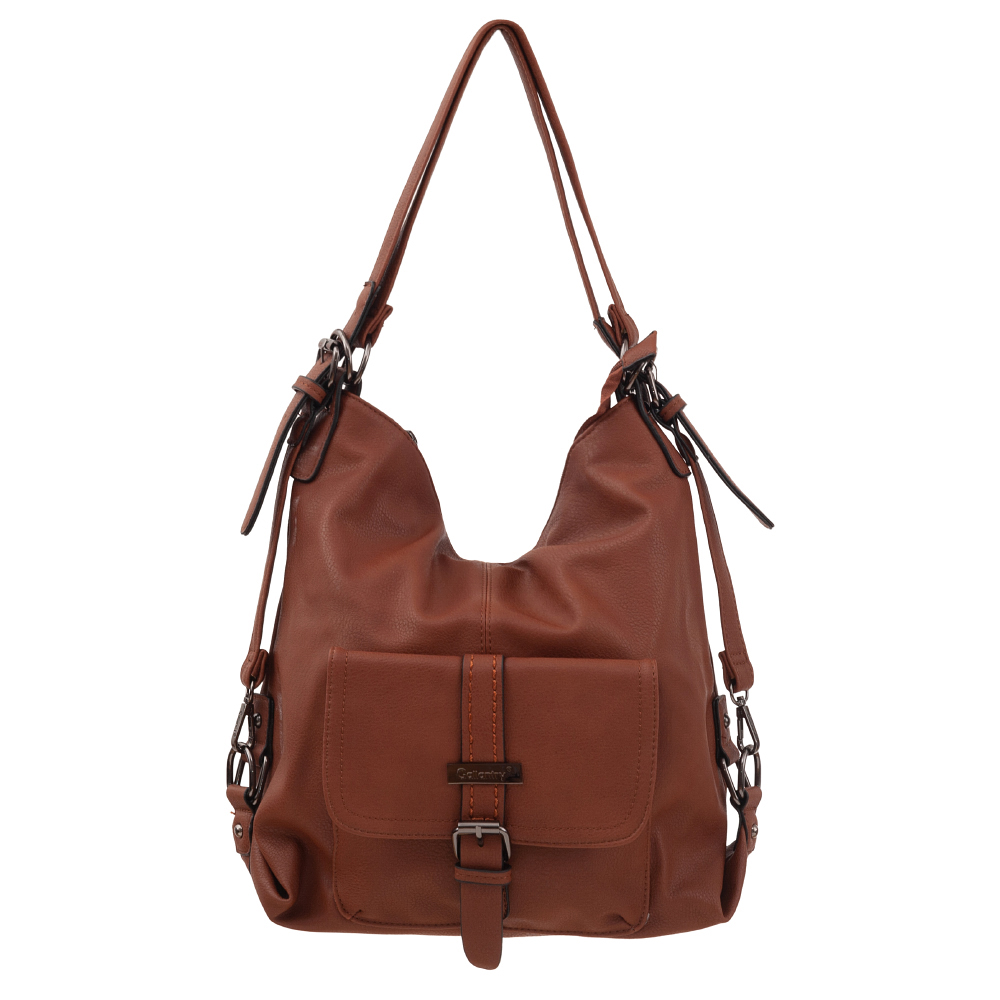 torebka / torba plecak wykonana w całości z miękkiej skóry ekologicznej najwyższej jakości. Zamykana z góry na zamek. Torebka jednokomorowa. Wewnątrz jedna kieszonka na zamek oraz jedna na telefon + dodatkowa kieszonka na drobiazgi. Z przodu kieszonka pod klapą na magnes. Dodatkowo z tyłu pionowa kieszonka na zamek. Wnętrze wykończone trwałą, materiałową podszewką. Po zaciągnięciu pasków torebkę można nosić jako plecak. Duża możliwość regulacji długości pasków dzięki przepinanym karabińczykom od 40 cm do nawet 82 cm.
