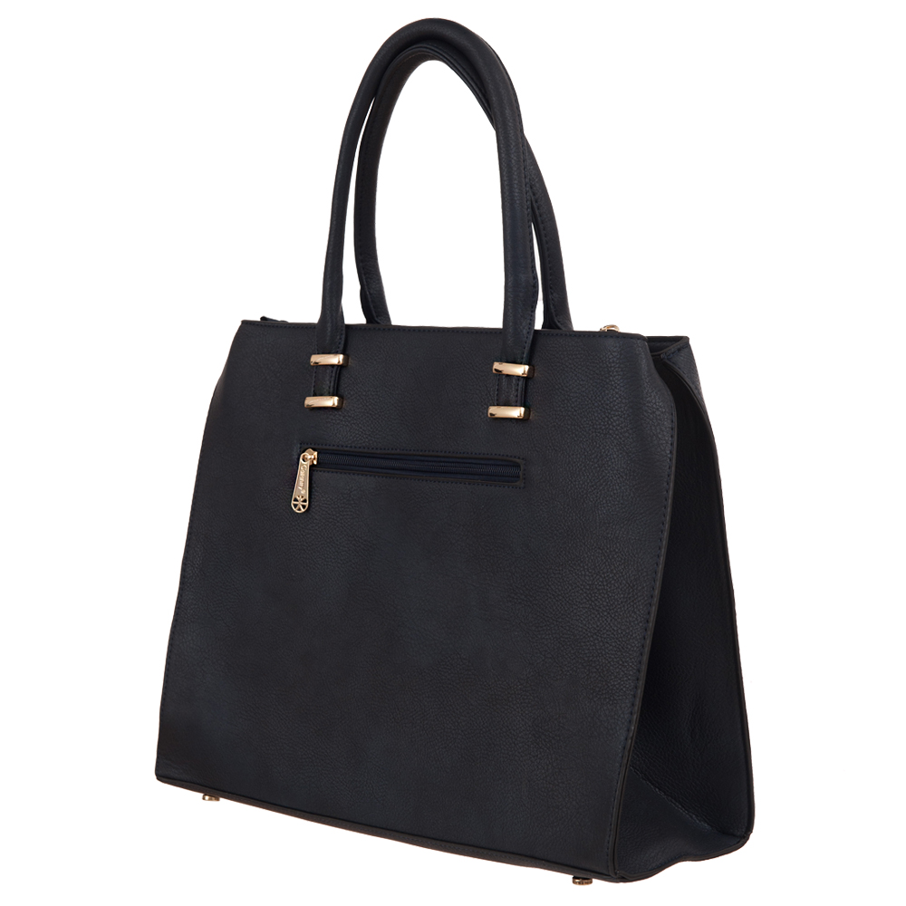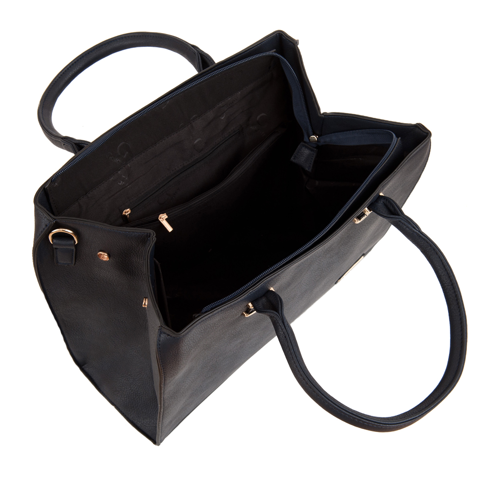 Modna, klasyczna skórzana torebka wykonana z wysokogatunkowej gładkiej skóry ekologicznej wysokiej jakości. Zamykana z góry na suwak na całej szerokości. Torebka jednokomorowa. Wewnątrz trzy kieszonki na zamek, jedna na telefon + dodatkowa kieszeń na drobiazgi. Wnętrze wykończone trwałą, ciemną podszewką. Dodatkowo z tyłu torebki kieszonka na suwak. Torebka od spodu usztywniona oraz podbita nóżkami, co chroni ją przeciw uszkodzeniom i zadrapaniom. Elementy wykończenia w kolorze złotym.
