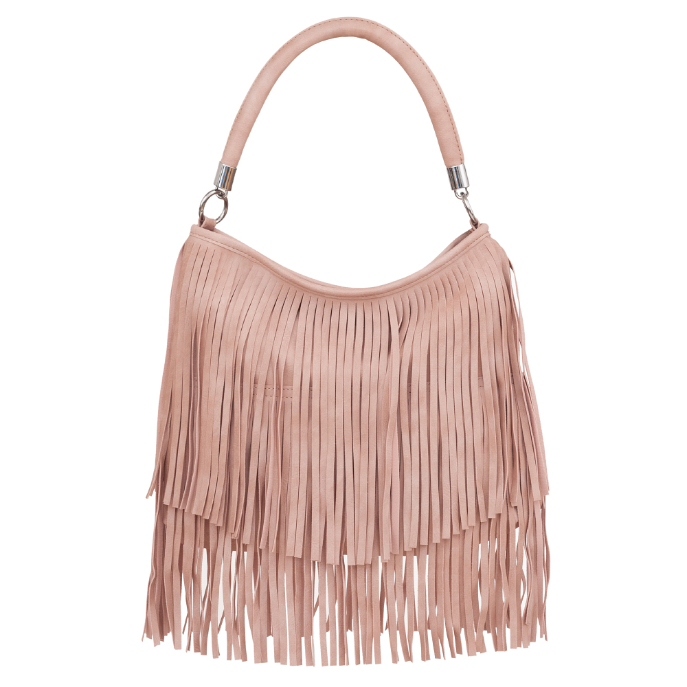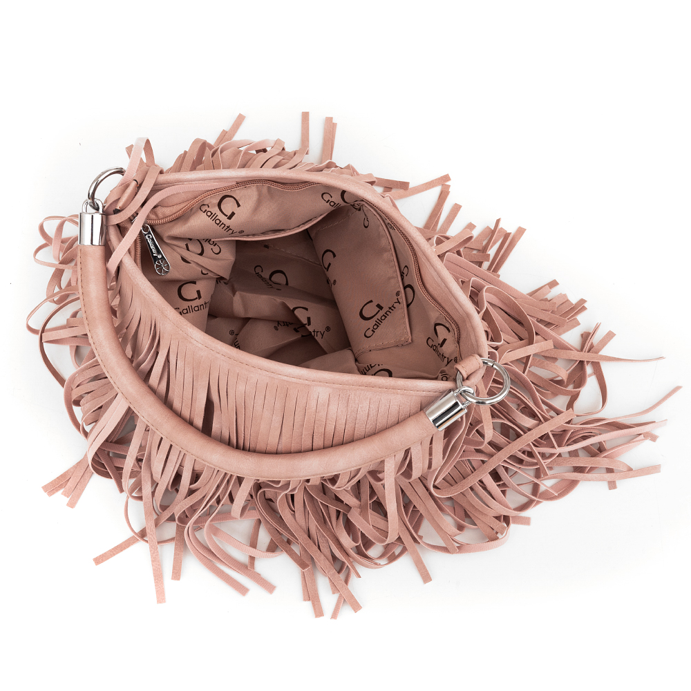 Torebka wykonana z wysokogatunkowej miękkiej skóry ekologicznej z frędzlami w stylu boho. Zamykana na suwak. Torebka jednokomorowa. W środku jedna kieszonka na zamek, jedna na telefon + dodatkowa kieszeń. Wnętrze wykończone trwałą, czarną podszewką. Dodatkowy długi regulowany pasek umożliwia wygodne noszenie na ramieniu lub przez ramię jak listonoszkę. Elementy wykończenia w kolorze srebrnym.