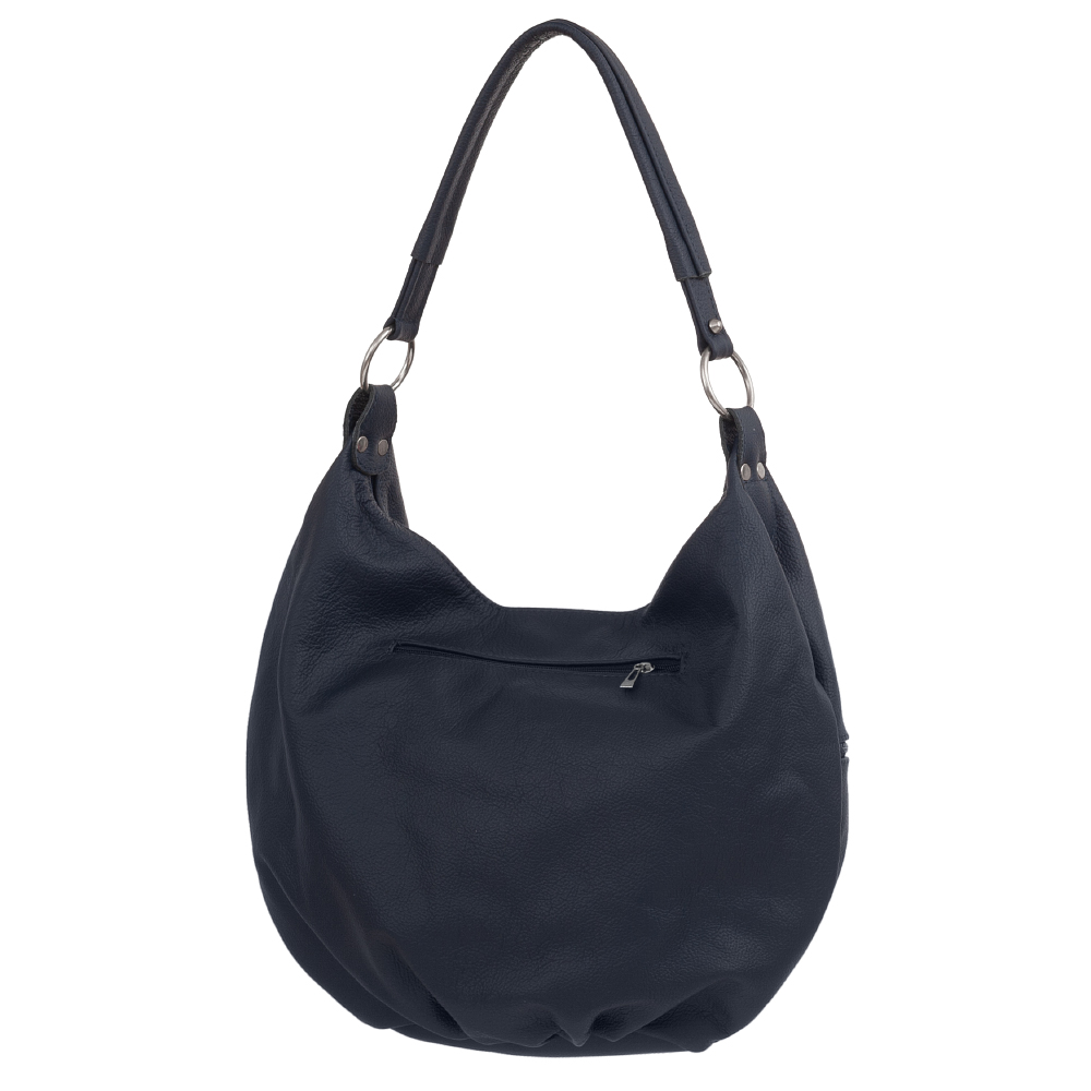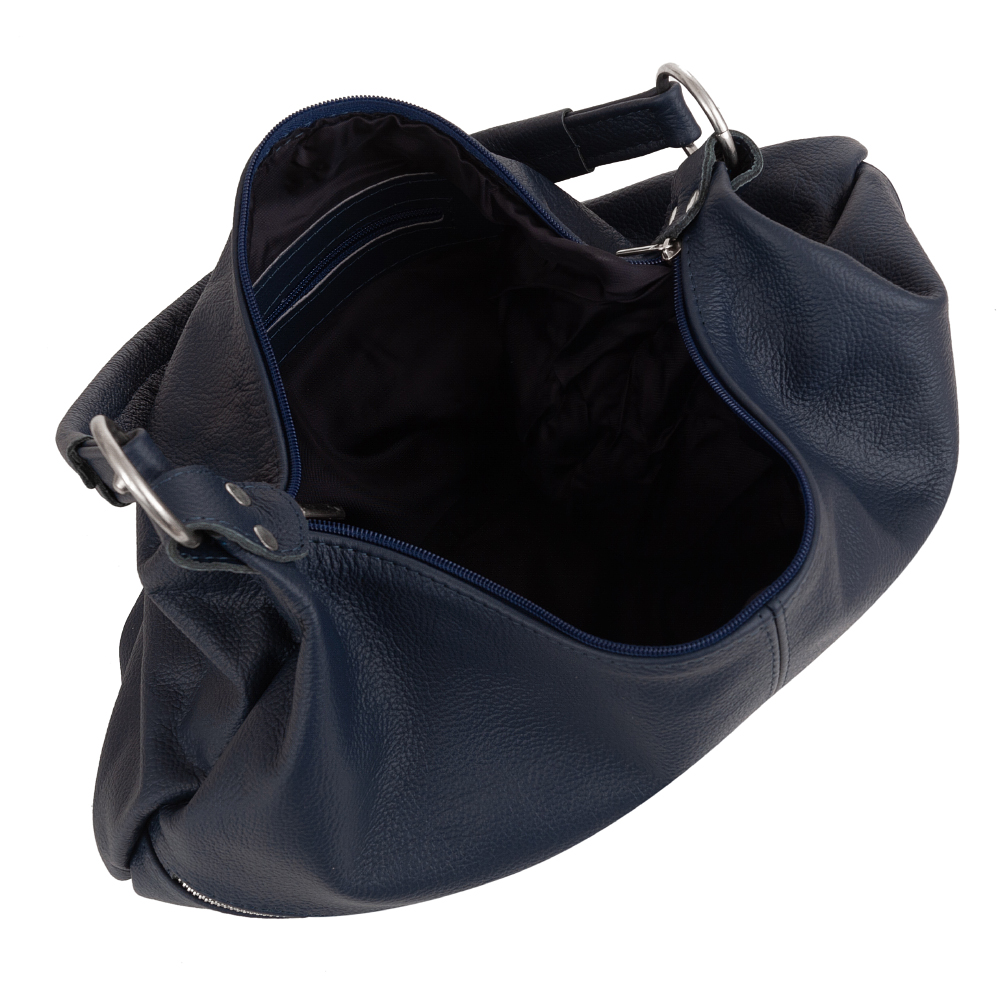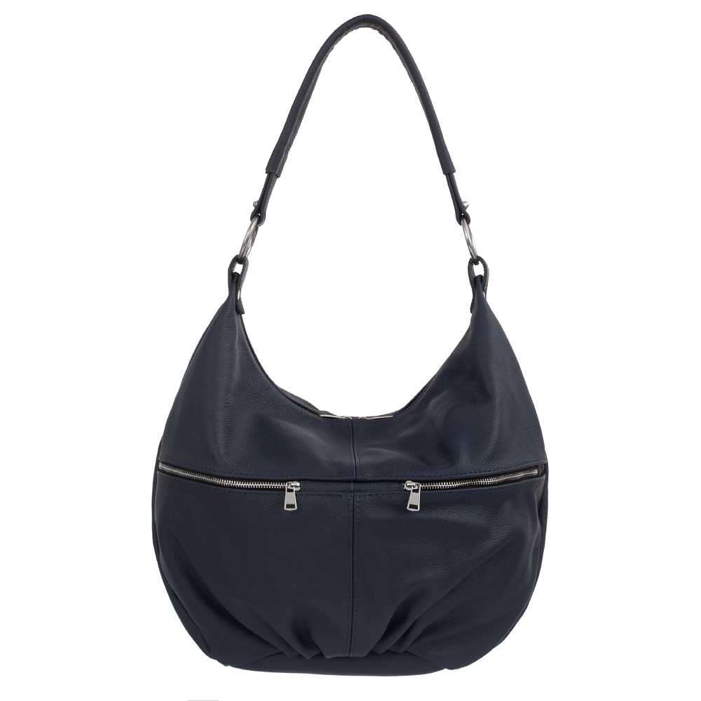 Skórzana torebka / worek wykonana w 100% z miękkiej naturalnej skóry. Zamykana od góry na zamek na całej szerokości. Torebka jednokomorowa. Dodatkowo wewnątrz jedna kieszonka na zamek, jedna na telefon + dodatkowa kieszeń. Z tyłu i z przodu kieszonki na zamek. Wnętrze wykończone trwałą podszewką. Elementy wykończenia w kolorze srebrnym. W komplecie długi pasek na ramię z możliwością regulacji długości max. 125 cm