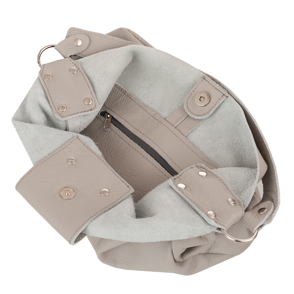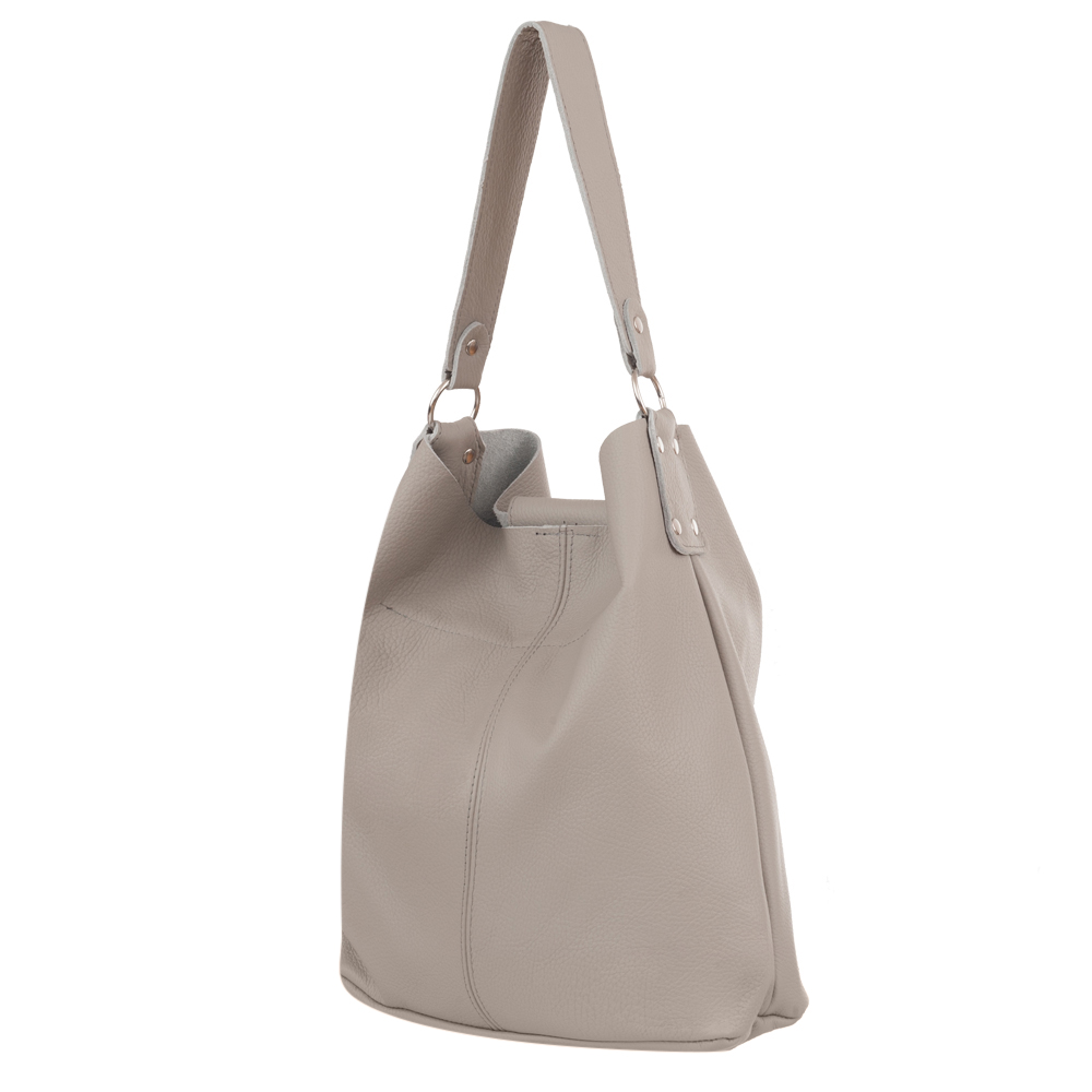 Modna pojemna torebka worek wykonana z najwyższej jakości miękkiej skóry naturalnej. Worek jest praktyczny, pojemny, bez problemu mieści format A4 oraz inne niezbędne rzeczy. Idealnie pasuje do stylizacji w miejskim stylu. Torebkę można nosić na kilka różnych sposobów, gdyż posiada dwa paski o różnej długości. Dłuższy jest odpinany. Torebka jednokomorowa, w środku duża kieszeń na zamek. Torba wykończona na surowo skórą naturalną. Dłuższy pasek skórzany z możliwością regulacji długości do max 130 cm