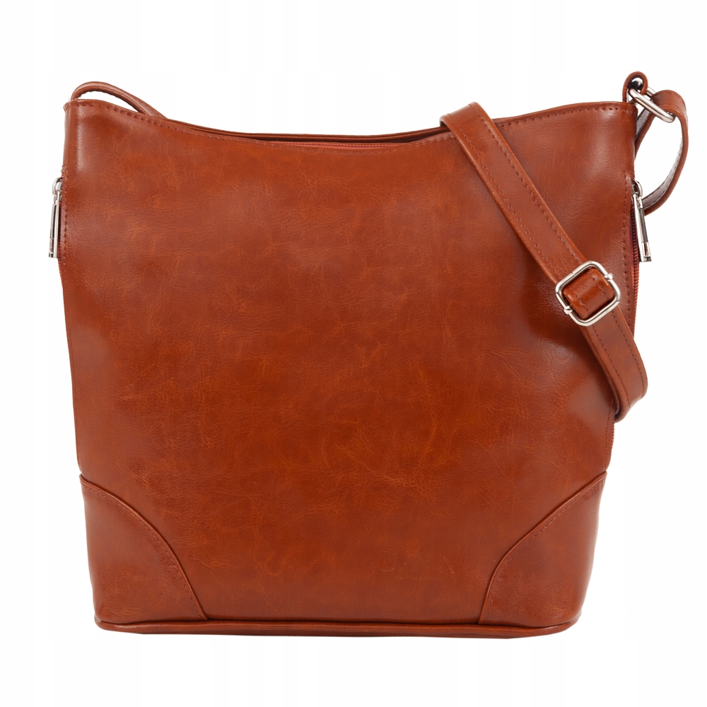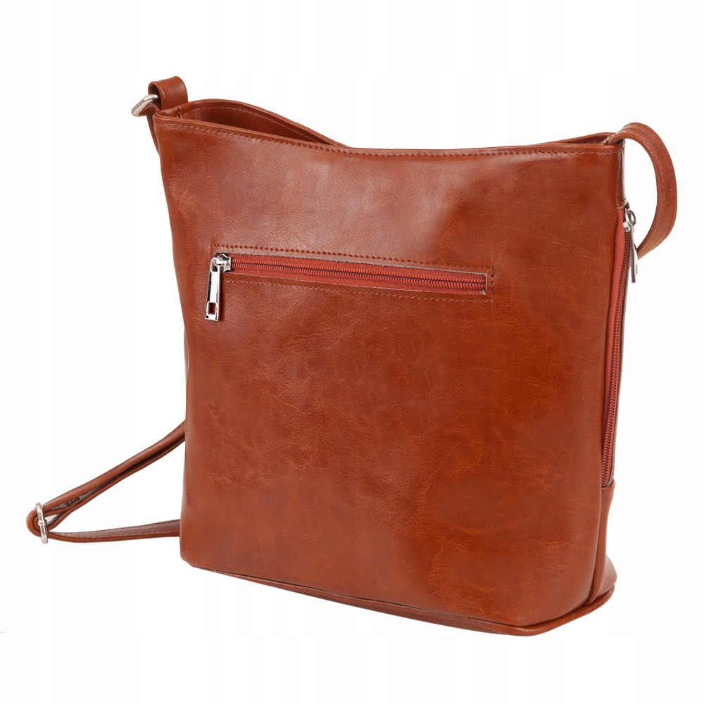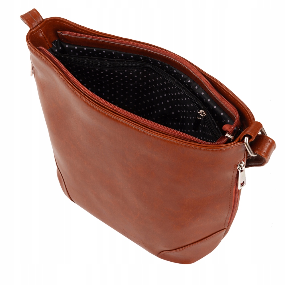Polska klasyczna, skórzana torebka wykonana z wysokogatunkowej naturalnej miękkiej skóry licowej. Zamykana od góry na zamek. Torebka dwukomorowa, bardzo pojemna, w środku przedzielona dużą kieszenią na suwak na całej szerokości, dzielącą ją na dwie komory. Wewnątrz jedna kieszonka na zamek + kieszonka na telefon. Dodatkowo z tyłu torebki pojemna kieszeń na suwak + kieszonki pionowe po bokach. Wnętrze wykończone trwałą, materiałową podszewką. Torebka od spodu usztywniona. Metalowe elementy wykończenia w kolorze srebrnym. Długi, regulowany pasek na ramię (65-134 cm) długości.