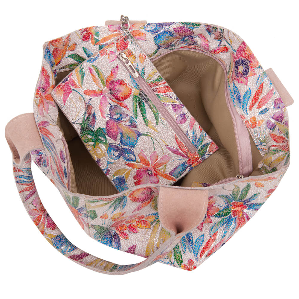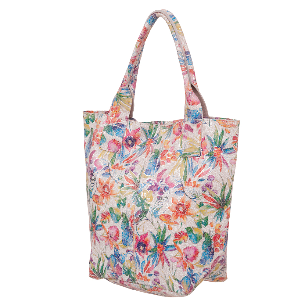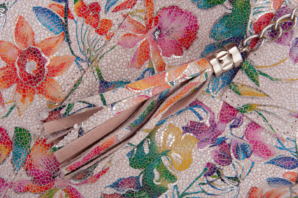VERA PELLE Włoska skórzana torebka worek wykonana z wysokogatunkowej naturalnej skóry z motywem kwiatów. Bardzo oryginalny i praktyczny model. Zamykana z góry na zamek na całej szerokości. W środku mocna, materiałowa podszewka. Kieszonka na suwak + saszetka na suwak w środku + miejsce na telefon. Elementy wykończenia w kolorze srebrnym. Modny pęk frędzli z przodu torebki. Swobodnie można nosić ją w dłoni, przedramieniu jak i na ramieniu.