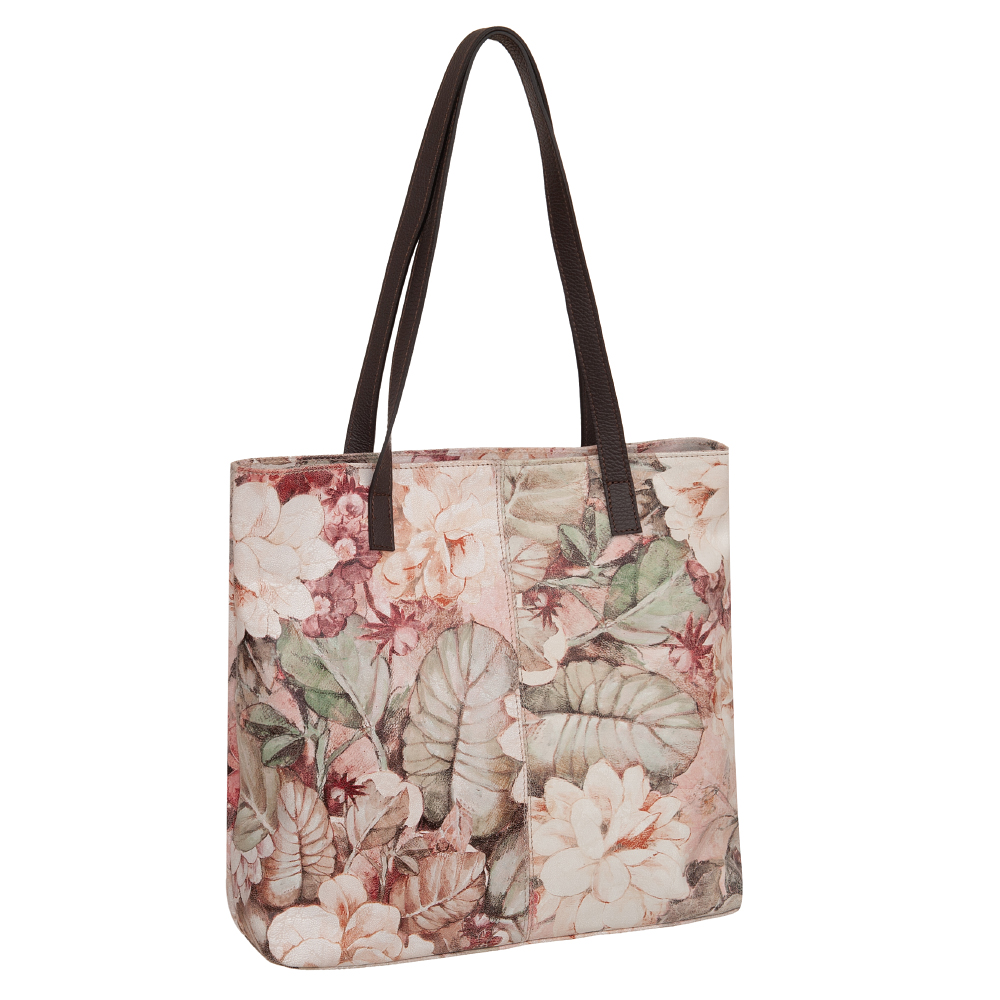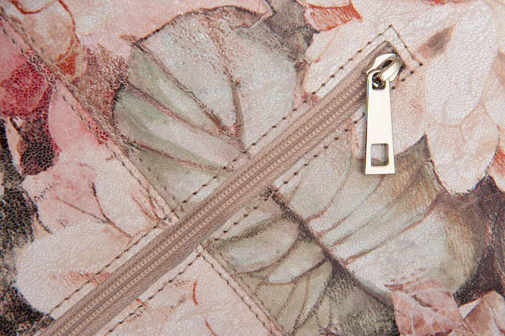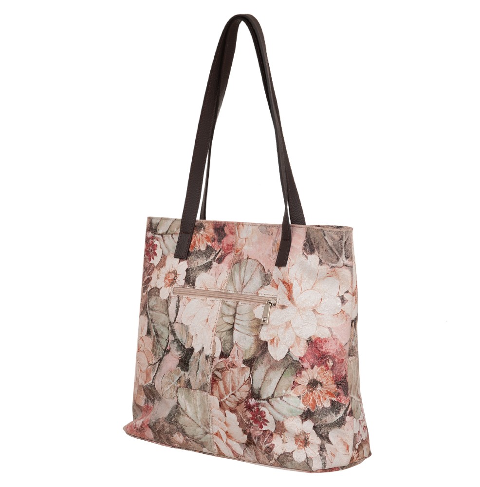VERA PELLE Włoska skórzana torebka wykonana z wysokogatunkowej naturalnej skóry z motywem kwiatów / liści. Bardzo oryginalny i praktyczny model. Zamykana z góry na zamek na całej szerokości. W środku mocna, materiałowa podszewka. W środku 2 x kieszeń wsuwna + kieszonka na zamek. Dno lekko usztywnione. Uszy w kolorze ciemnobrązowym.