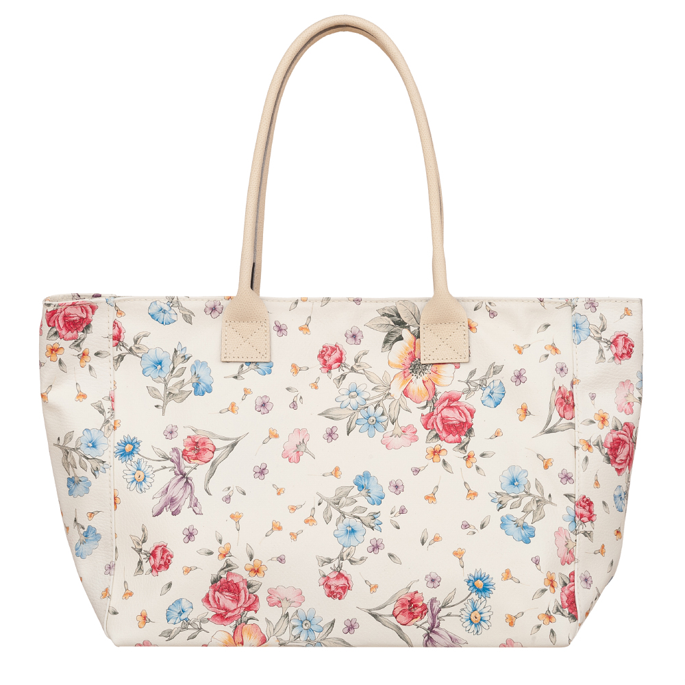 Włoska ecru modna i poręczna torebka. Wykonana perfekcyjnie ze skóry naturalnej licowej, torebka z motywem kolorowych kwiatów. Torebka jednokomorowa, wykończona materiałową mocną podszewką, zamykana na całej szerokości na zamek. Możliwość noszenia torebki w dwóch formach - rozłożona jak i złożona w trapez po spięciu klipsem w środku torebki. Torebkę swobodnie można nosić na ramieniu. W środku kieszonka na zamek + miejsce na telefon. Torebka usztywniona od spodu. Metalowe elementy w kolorze srebrnym dodają torebce elegacji. Idealna torebka w miejskim stylu na co dzień.