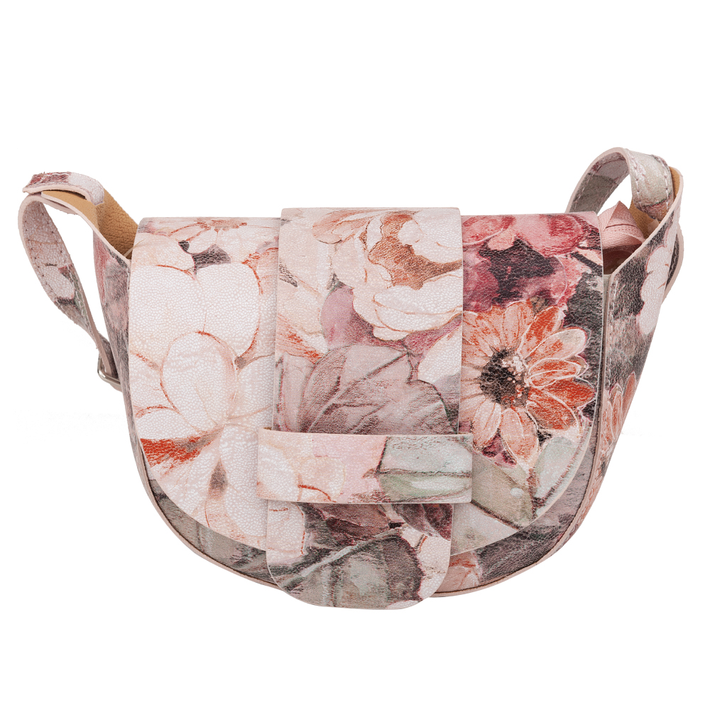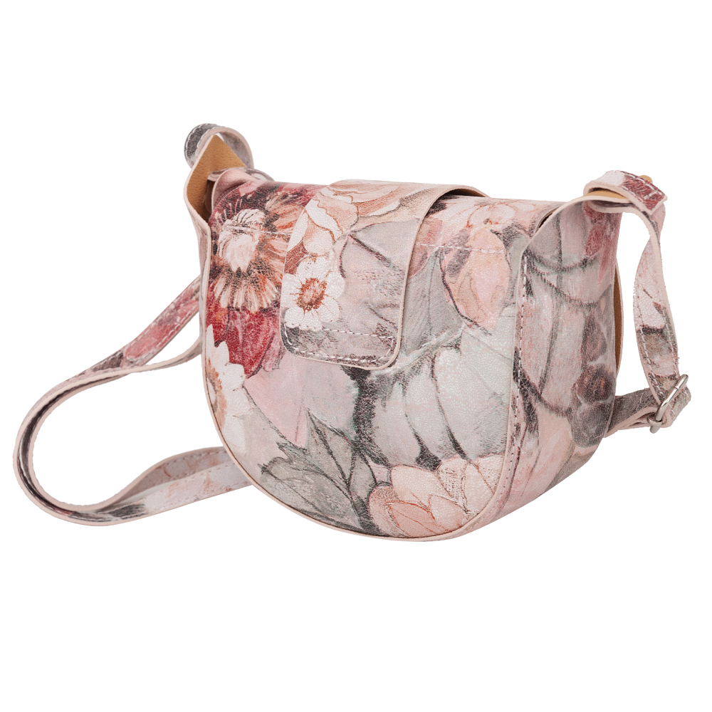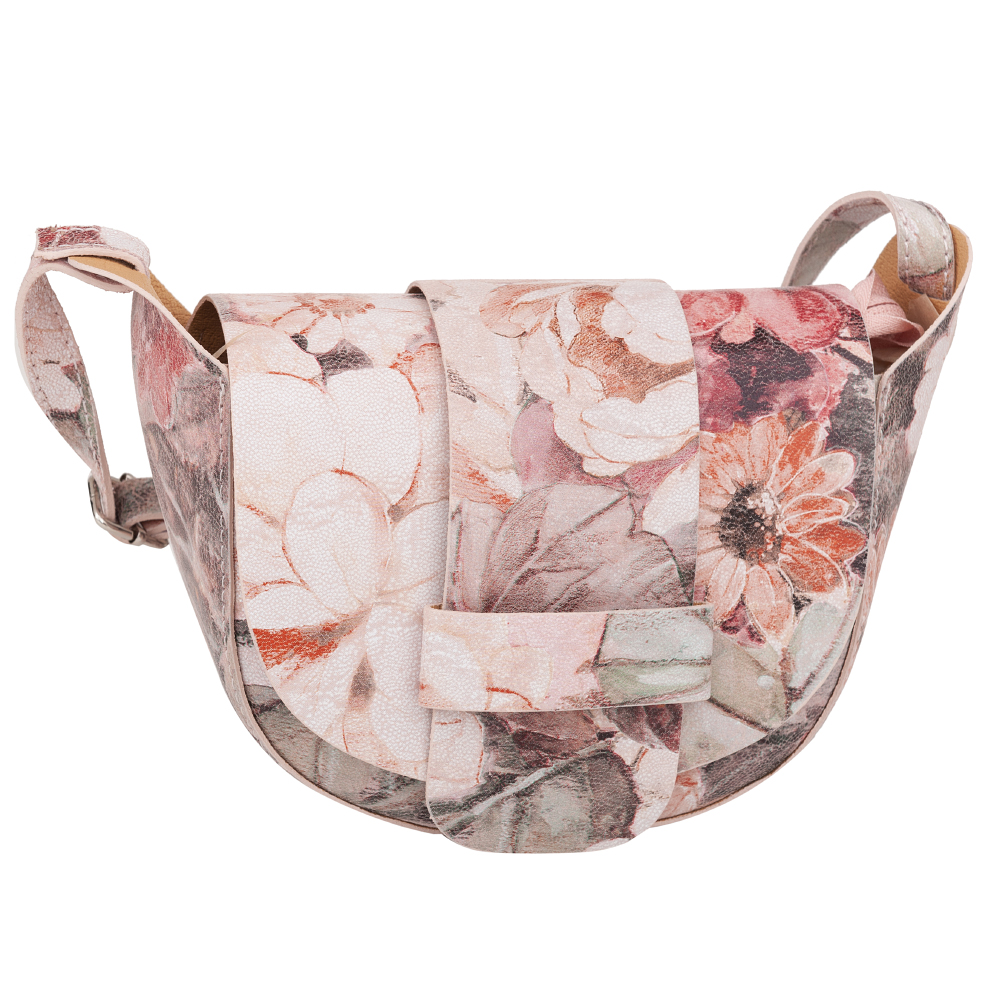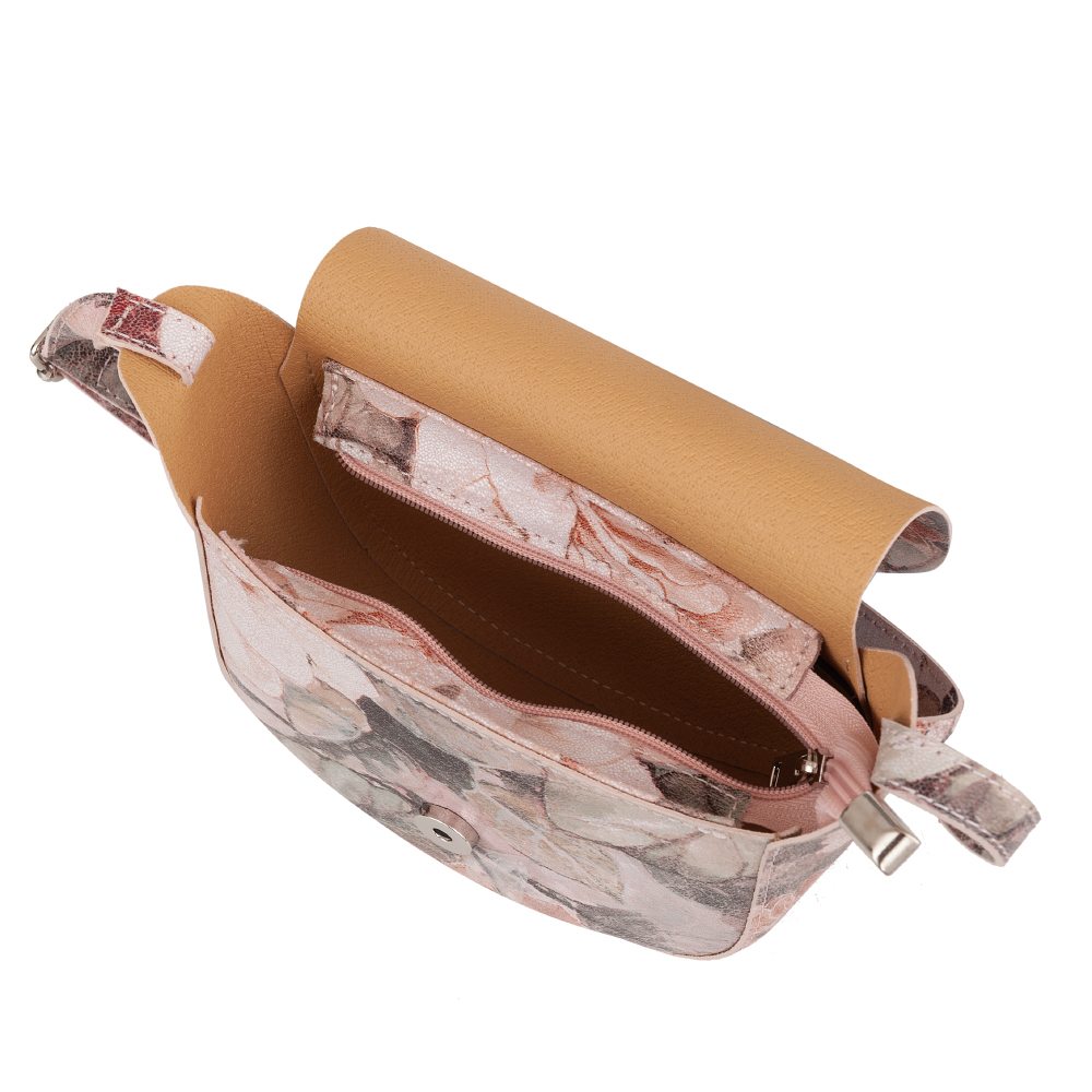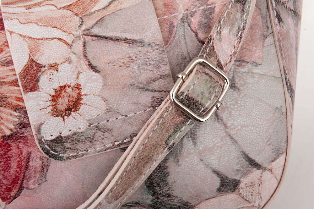 Włoska kolorowa skórzana torebka listonoszka wykonana z wysokogatunkowej naturalnej skóry firmy VERA PELLE. Torebka w stylu miejskim, modny wzór kwiatowy. Zamykana z góry na klapę na magnes + zamek pod klapą. Torebka jednokomorowa. Elementy wykończenia w kolorze srebrnym. Skórzany pasek z możliwością regulacji długości do 135 cm.