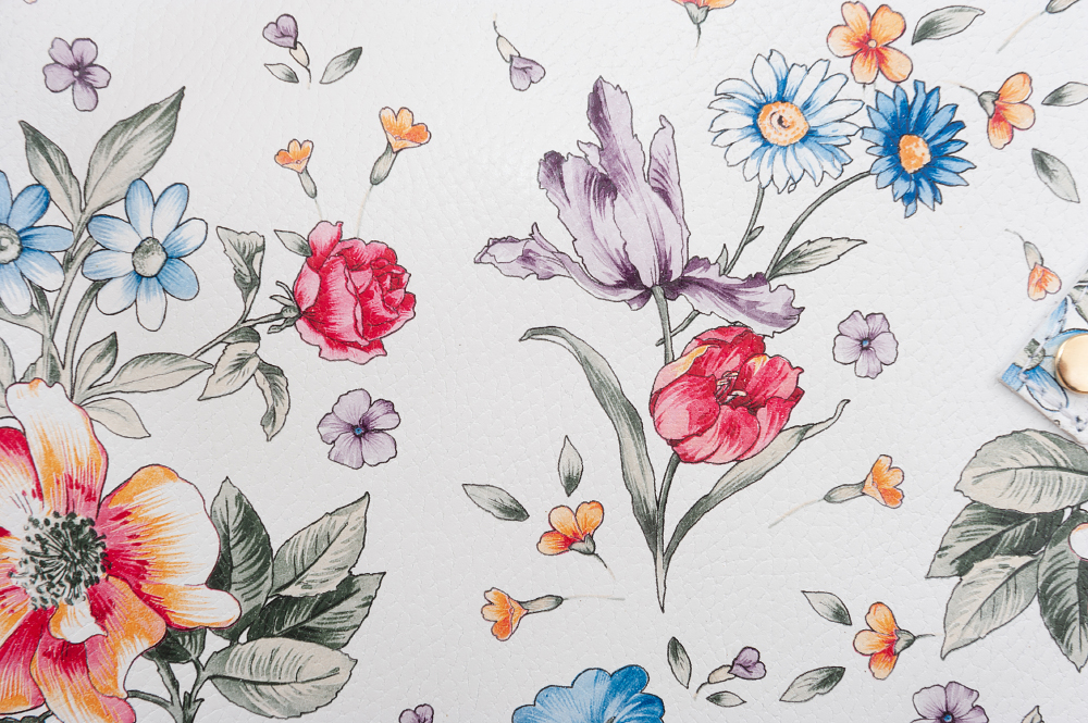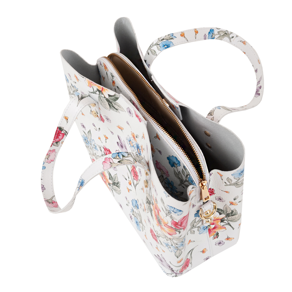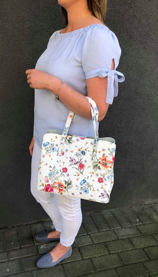 Włoska modna i poręczna torebka kuferek. Wykonana perfekcyjnie ze skóry naturalnej licowej, biała torebka z motywem kolorowych kwaitów. Na przodzie torebki wytłoczenie L'ARTIGINO Made in Italy. Torebka trzykomorowa, środkowa komora zamykana na zamek, wykończona materiałową mocną podszewką. Boczne komory zamykane na magnes. W komplecie długi regulowany pasek do noszenia torebki na ramieniu, Od spodu metalowe nóżki chroniące przed uszkodzeniami. Torebka usztywniona od spodu. Metalowe elementy w kolorze złotym dodają torebce elegacji. Idealna torebka w miejskim stylu na codzień.