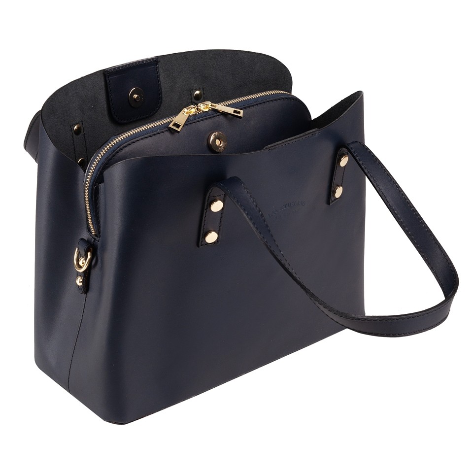 Włoska modna i poręczna torebka kuferek. Wykonana perfekcyjnie ze skóry naturalnej licowej, Na przodzie torebki wytłoczenie L'ARTIGINO Made in Italy. Torebka trzykomorowa, środkowa komora zamykana na zamek, wykończona materiałową mocną podszewką. Boczne komory zamykane na magnes. W komplecie długi regulowany pasek do noszenia torebki na ramieniu, Od spodu metalowe nóżki chroniące przed uszkodzeniami. Torebka usztywniona od spodu. Metalowe elementy w kolorze złotym dodają torebce elegacji. Idealna torebka w miejskim stylu na codzień.
