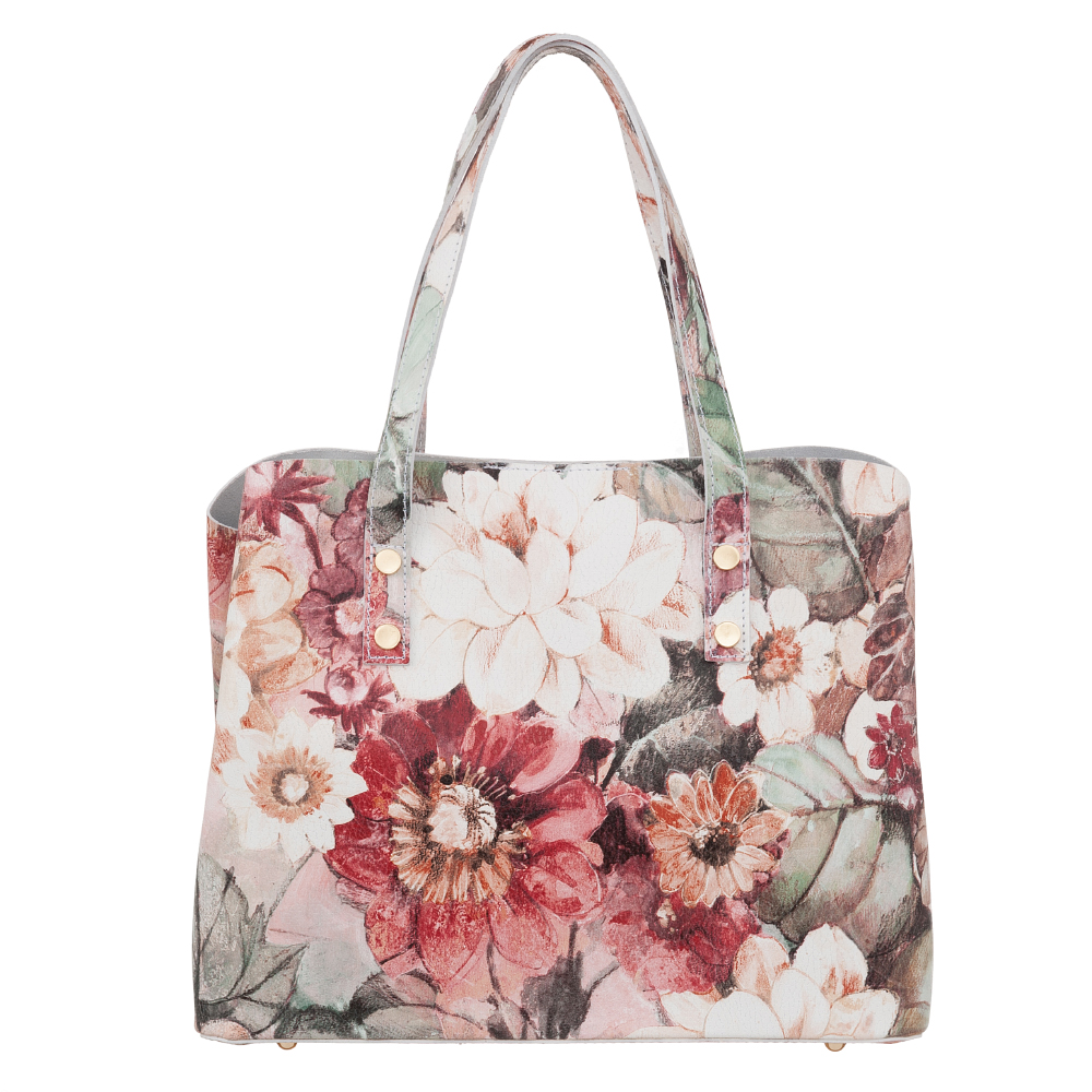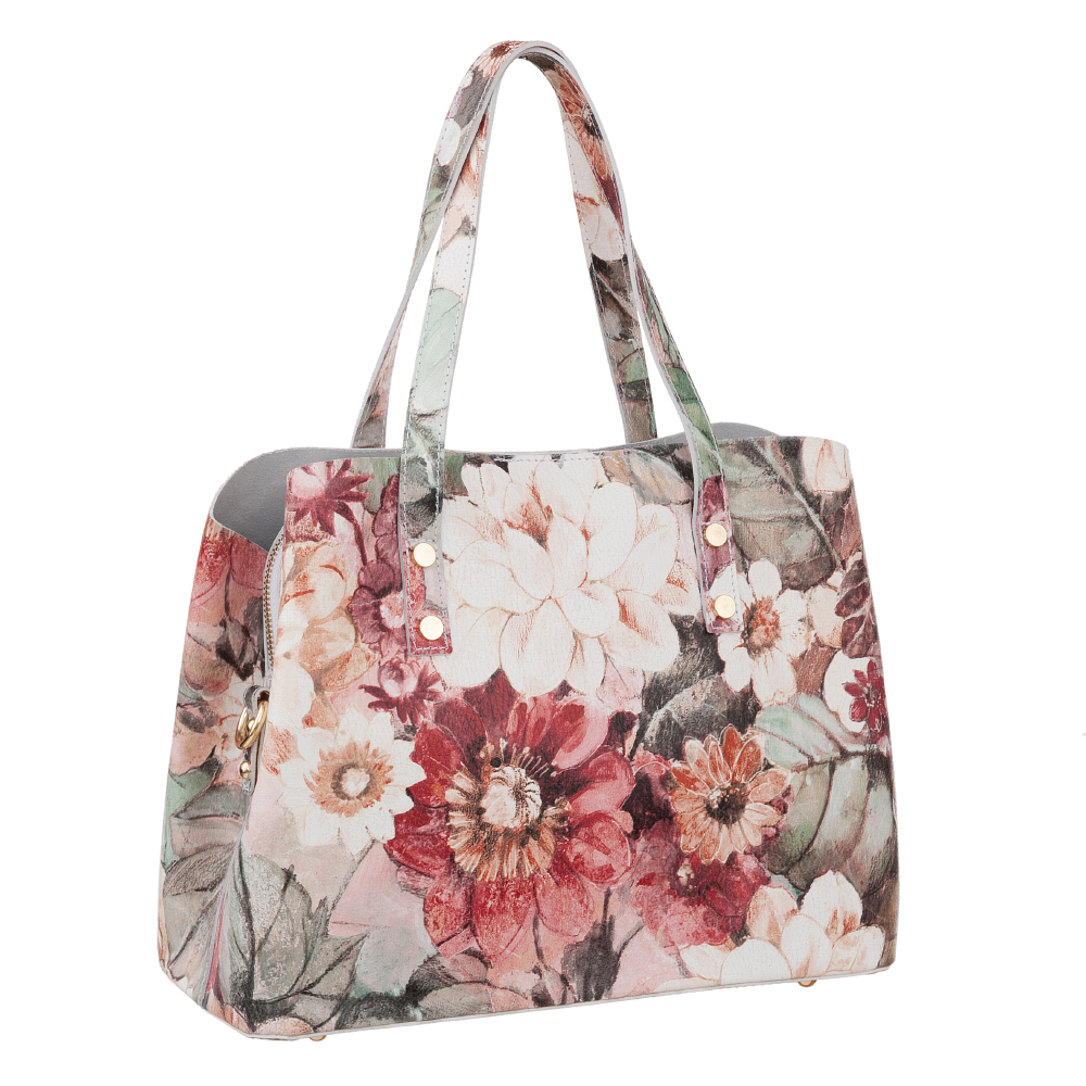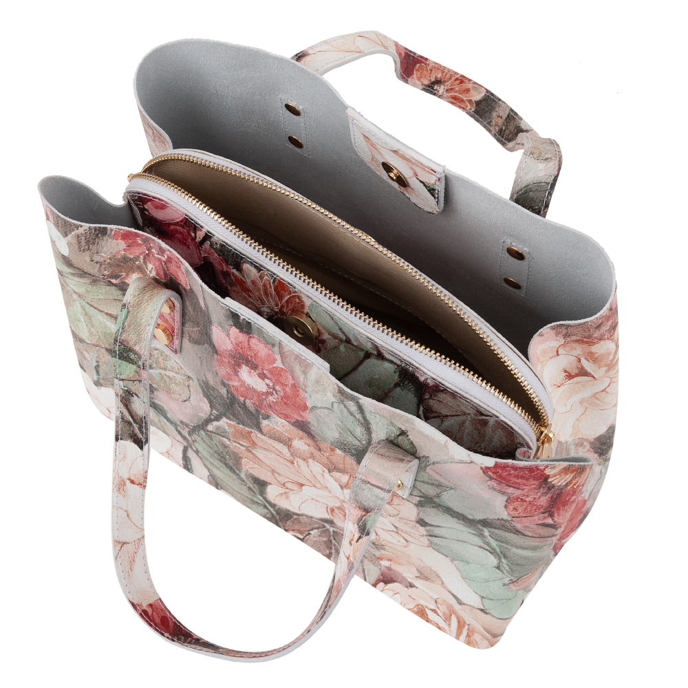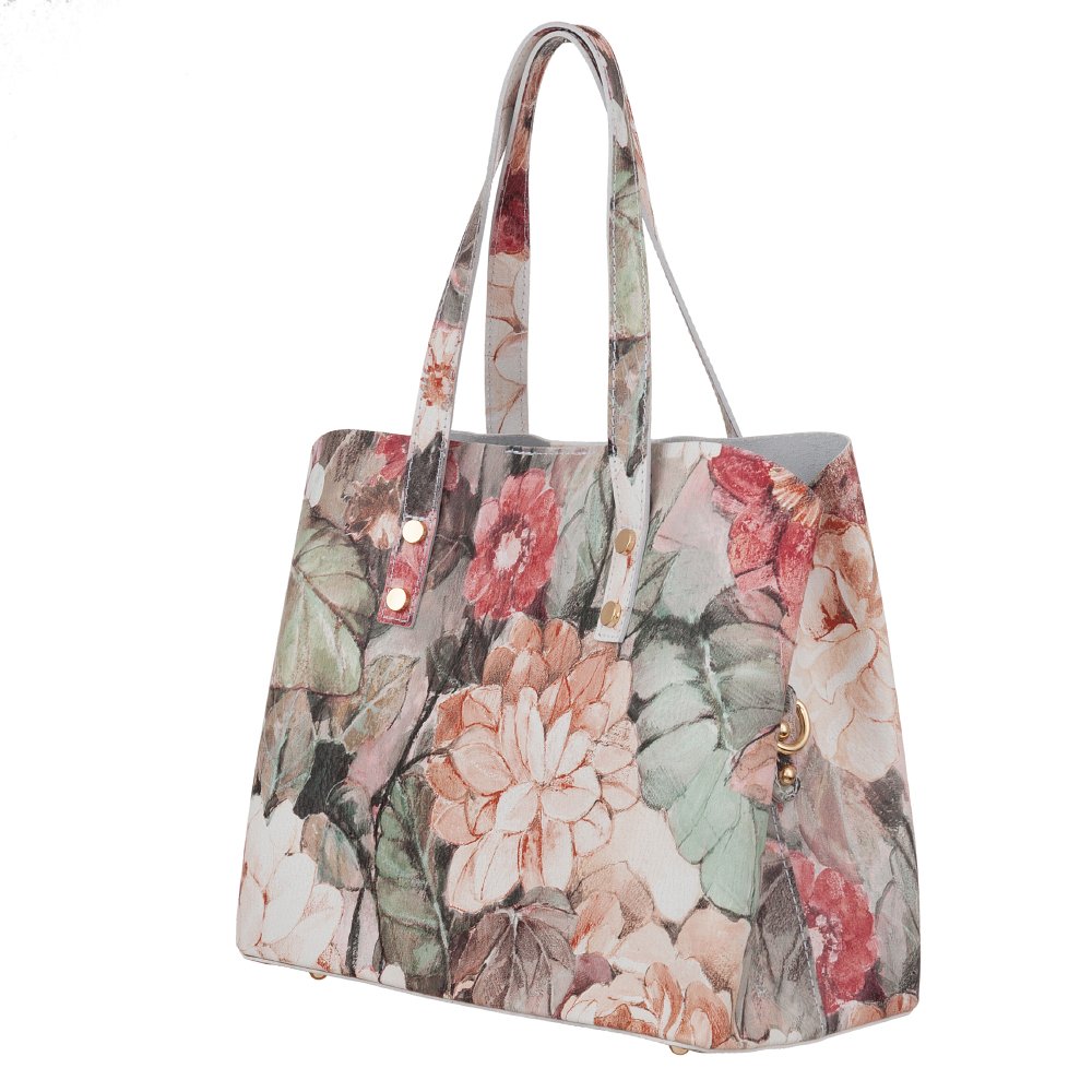 Włoska modna i poręczna torebka wykonana perfekcyjnie ze skóry naturalnej licowej z motywem kolorowych kwiatów. Torebka trzykomorowa, środkowa komora zamykana na zamek, wykończona materiałową mocną podszewką. Boczne komory zamykane na magnes. W komplecie długi regulowany pasek do noszenia torebki na ramieniu, Od spodu metalowe nóżki chroniące przed uszkodzeniami. Torebka usztywniona od spodu. Metalowe elementy w kolorze złotym dodają torebce elegancji. Idealna torebka w miejskim stylu na co dzień.