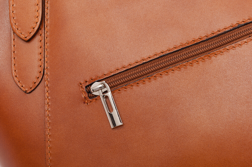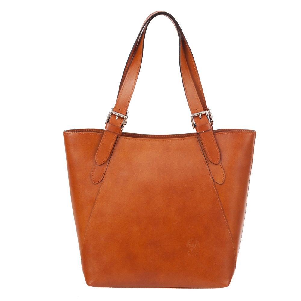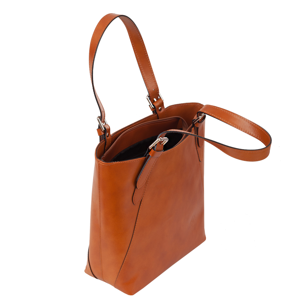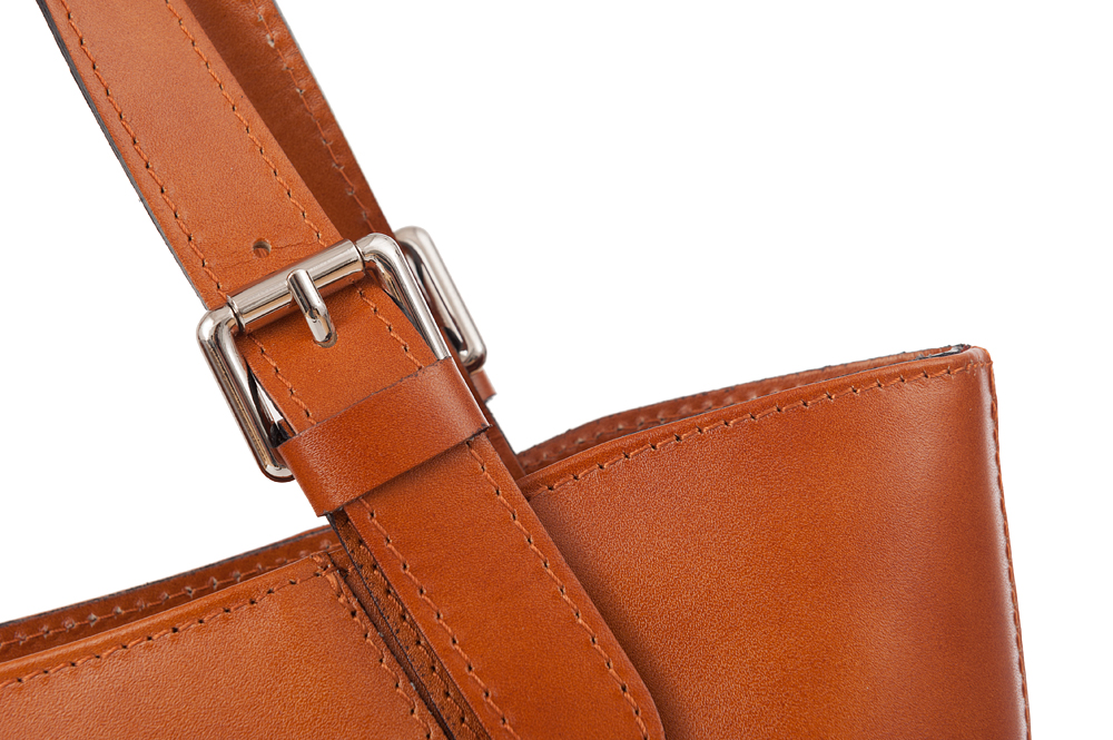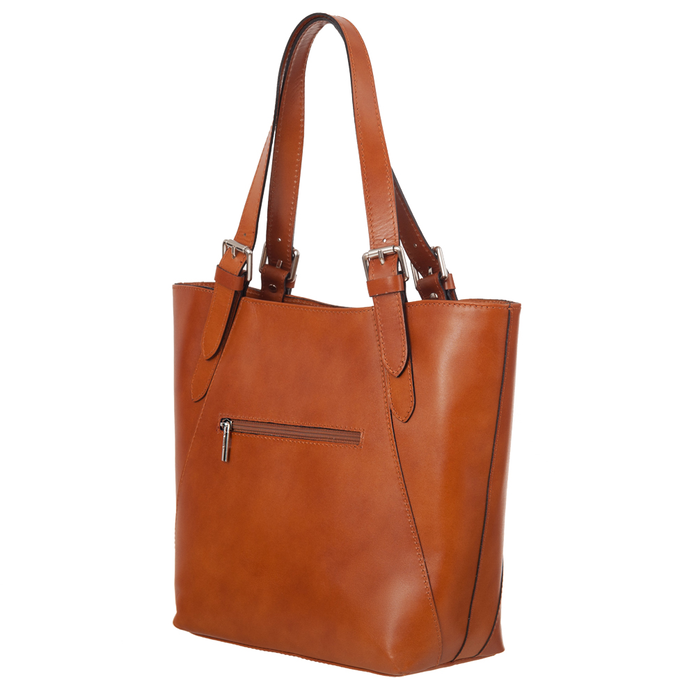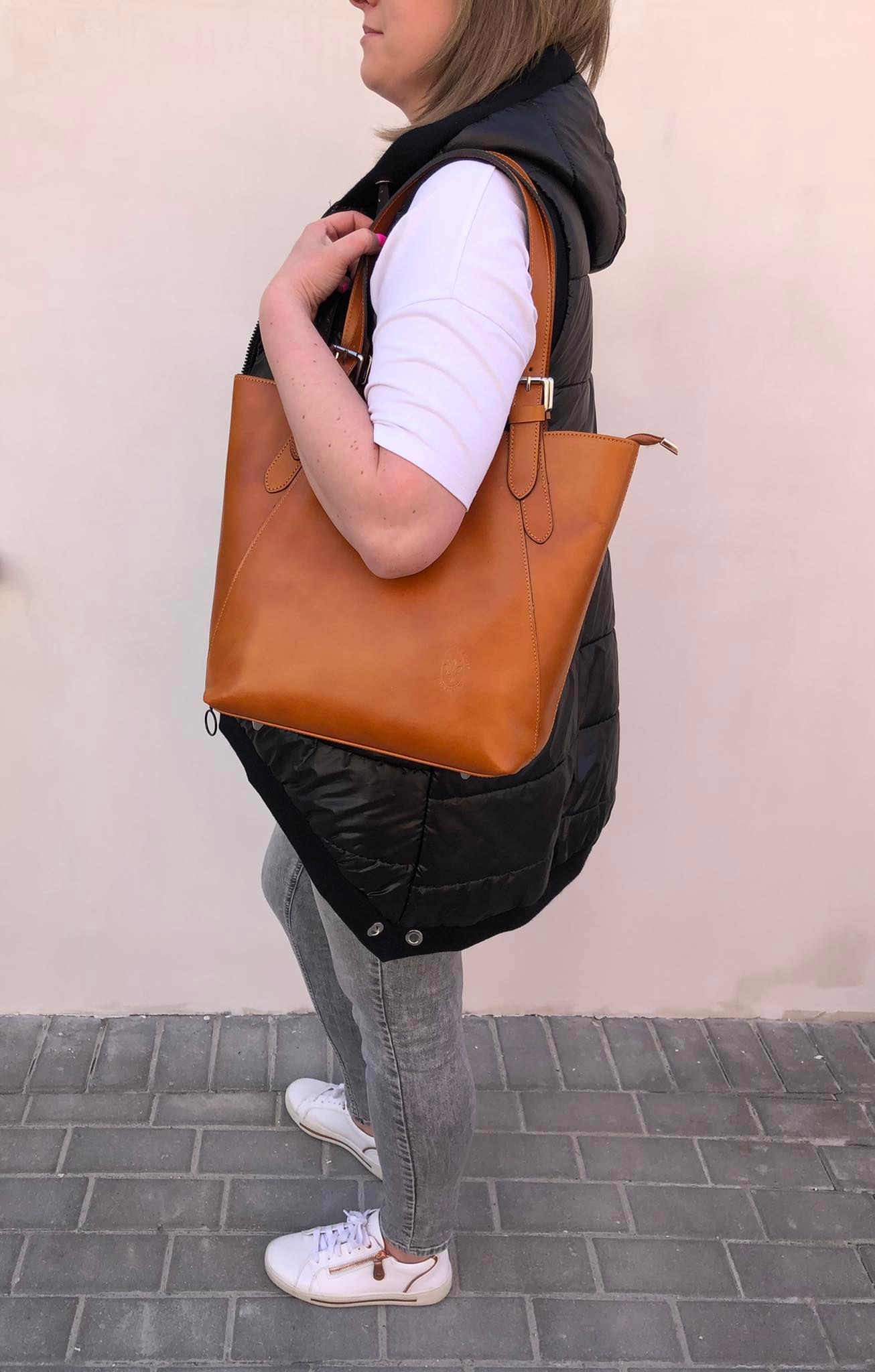 Włoska klasyczna skórzana torebka wykonana z wysokogatunkowej naturalnej gładkiej skóry licowej firmy Vera Pelle. Zamykana z góry na suwak. Torebka jednokomorowa przedzieloną dużą kieszenią na suwak. Wewnątrz jedna kieszonka na zamek oraz jedna na telefon. Wnętrze wykończone trwałą, ciemną podszewką. Dodatkowo z tyłu torebki kieszonka na suwak. Torebka od spodu usztywniona oraz podbita ćwiekami, co chroni ją przeciw uszkodzeniom. Uszy w torebce można regulować na długość 45-55 cm. Dodatkowy doczepiany pasek o długości 85 cm. Elementy wykończenia w kolorze srebrnym.