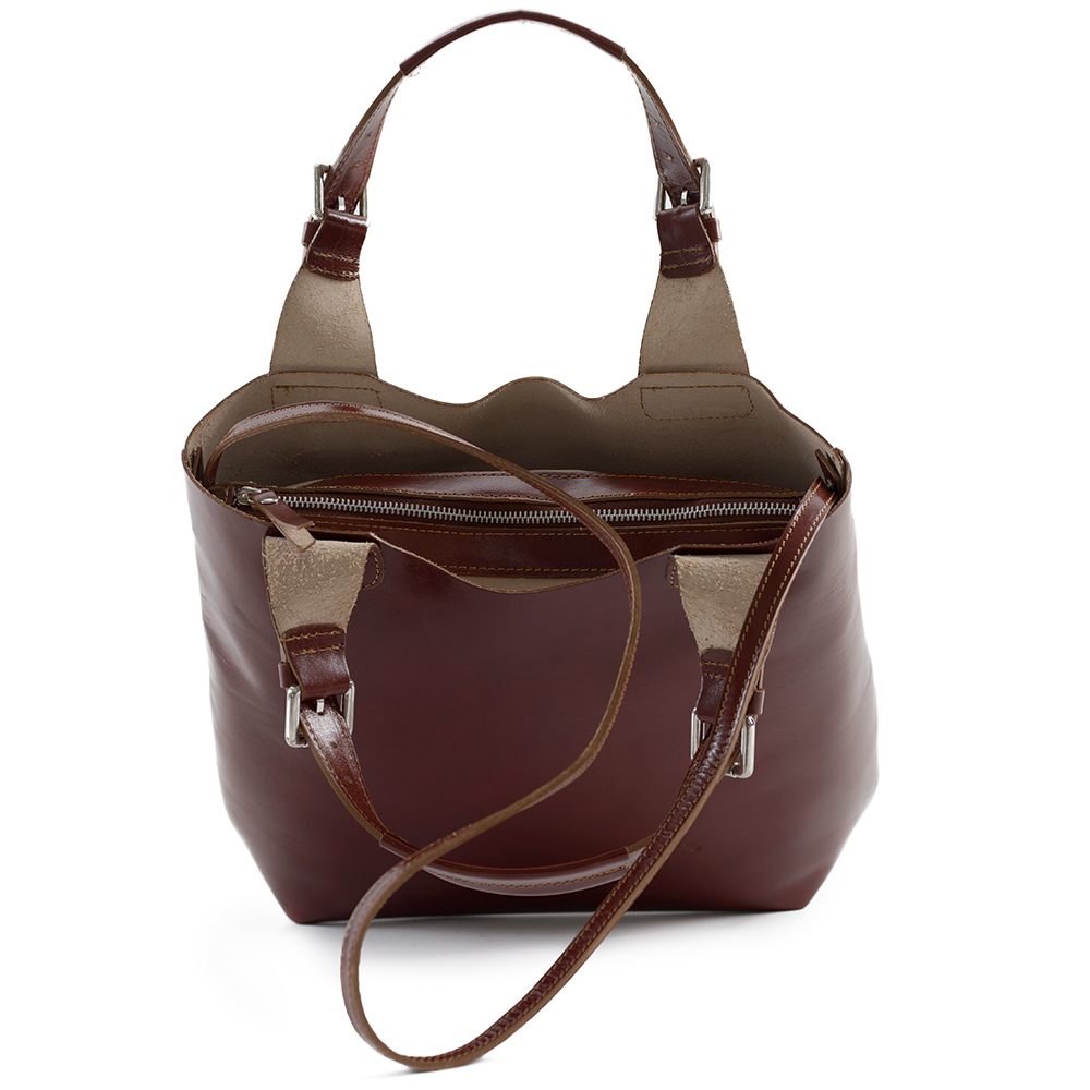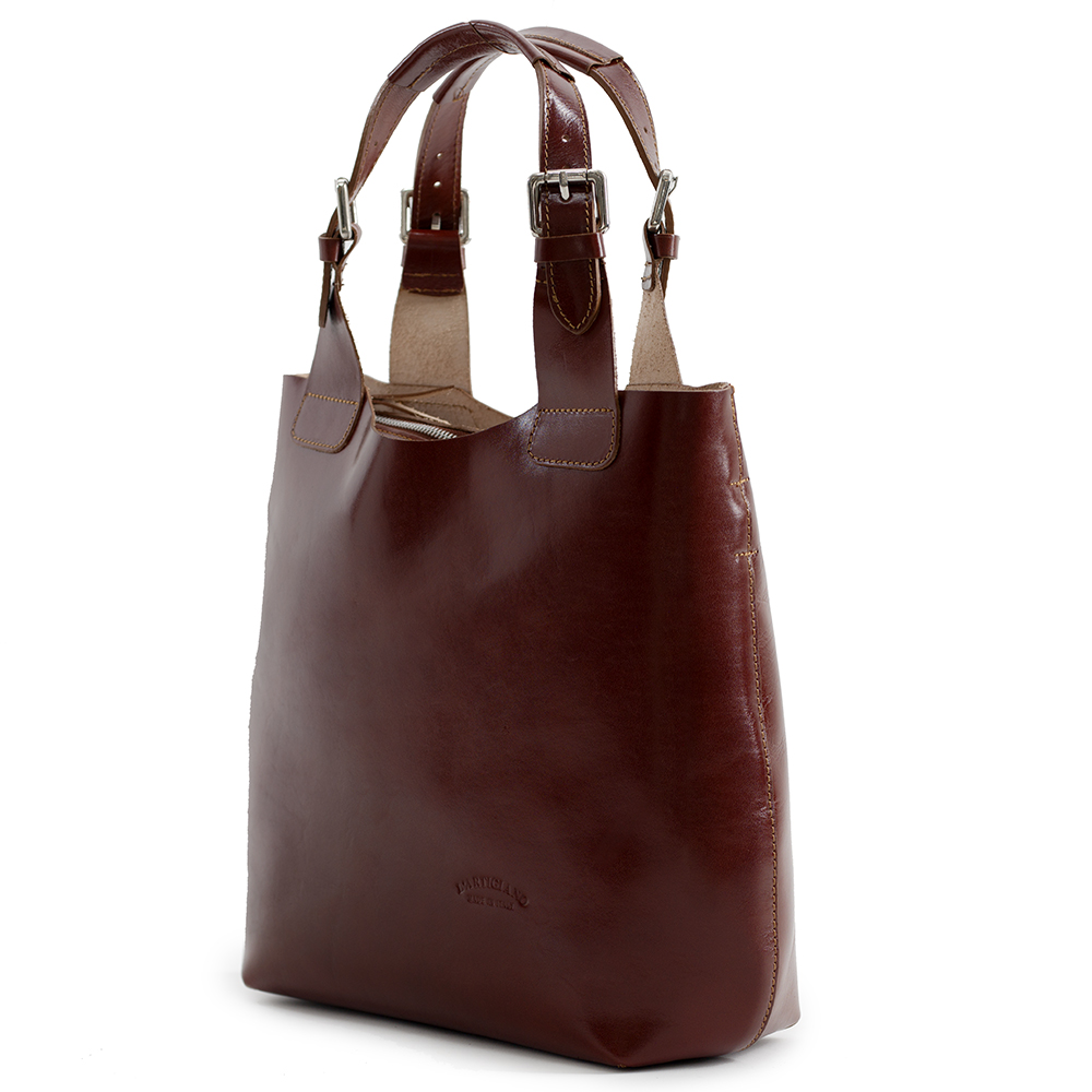 L'ARTIGIANO Włoska skórzana torebka shopper bag wykonana z wysokogatunkowej naturalnej gładkiej skóry licowej. Wygodny dostęp do środka. Torebka jednokomorowa przedzielena dużą kieszenią na suwak na całej szerokości torebki. Wkład w torebce wyciągany, dzięki czemu torebka robi się bardzo pojemna. Wewnątrz kieszonka na telefon. Torebka od środka wykończona surową skórą. Wkład wykonany z trwałej podszewki wykończonej skórą naturalną. Elementy wykończenia w kolorze srebrnym. Dodatkowy pasek o długości 100 cm.