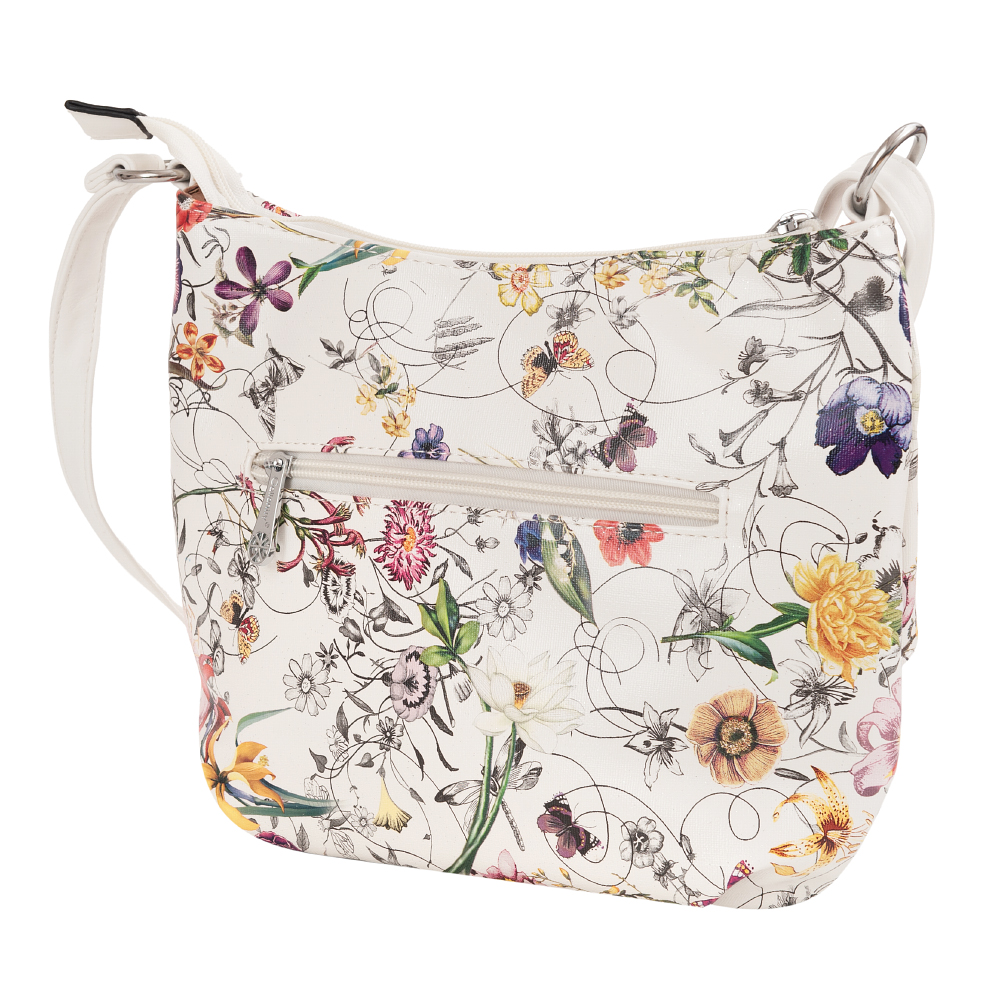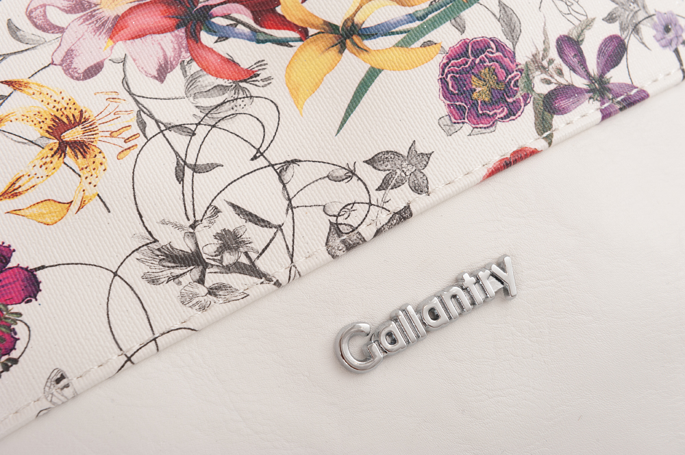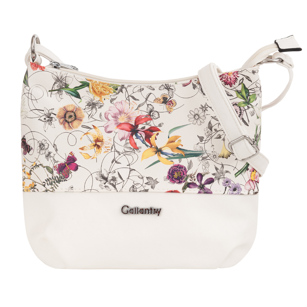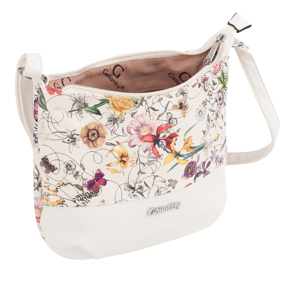 GALLANTRY pojemna torebka / listonoszka wykonana z wysokogatunkowej skóry ekologicznej z motywem kolorowych kwiatów / motyli. Zamykana na suwak na całej szerokości torebki. Torebka jednokomorowa, wewnątrz jedna kieszonka na zamek + 2 x kieszonka na telefon i drobiazgi. Wnętrze wykończone trwałą, materiałową podszewką. Długi, regulowany pasek umożliwia wygodne noszenie na ramieniu lub przez ramię jako listonoszka. Dodatkowa kieszeń z tyłu torebki na suwak.