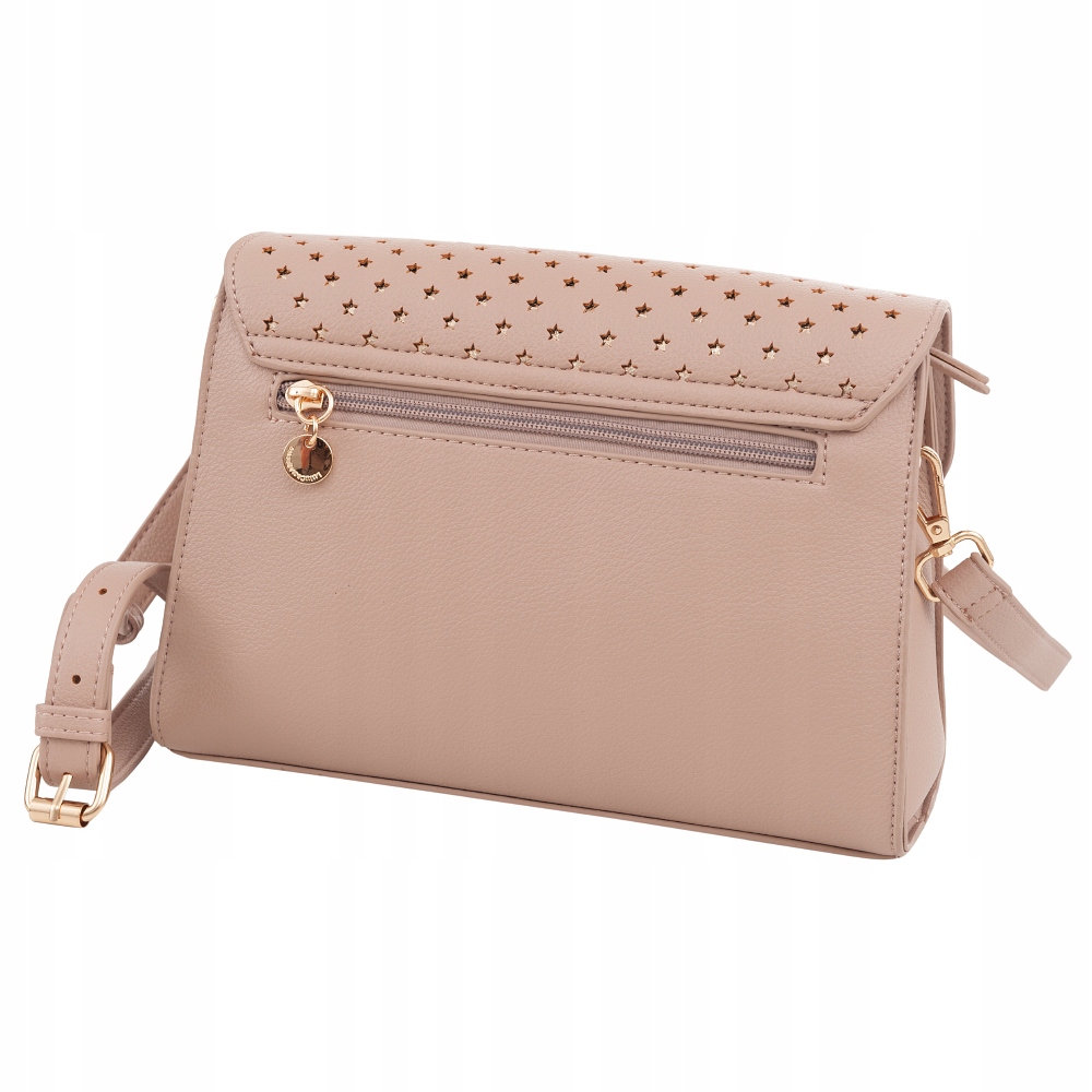 Długi, regulowany pasek umożliwia wygodne noszenie na ramieniu lub przez ramię jak listonoszkę. Metalowe elementy w kolorze złotym.