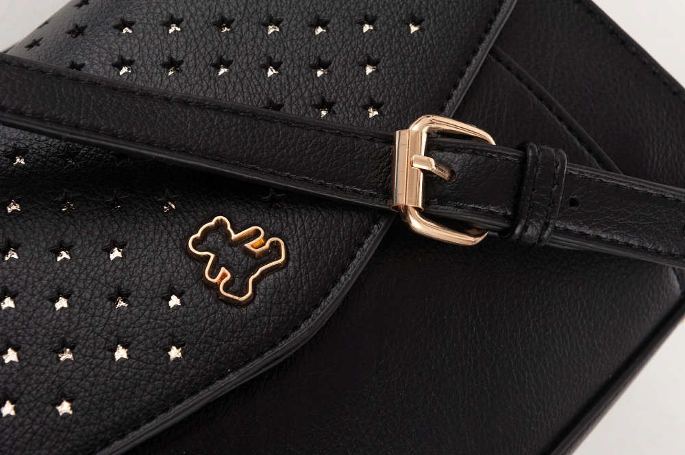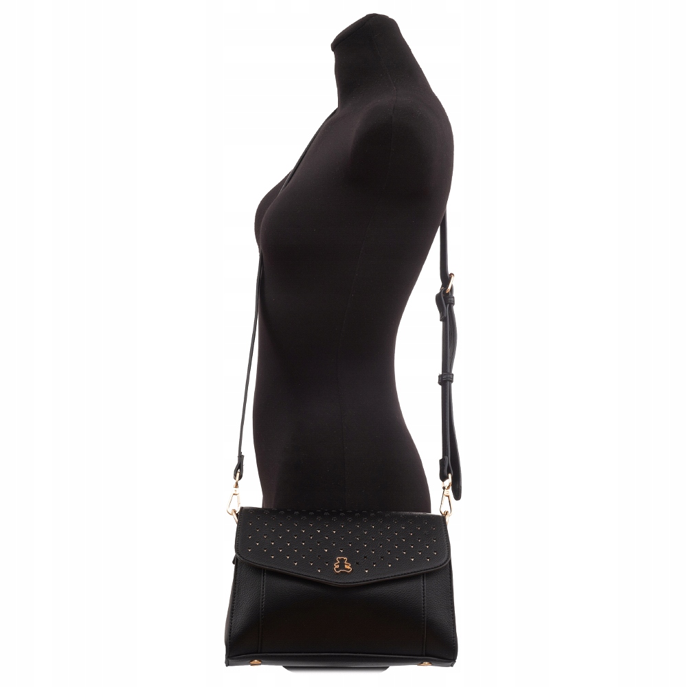 Modna torebka z misiem wykonana z wysokogatunkowej skóry ekologicznej. Zamykana na suwak + klapa na magnes. Torebka jednokomorowa. W środku 2 x kieszonka na zamek oraz jedna na telefon + kieszonka na klucze + wsuwna kieszonka pod klapką.