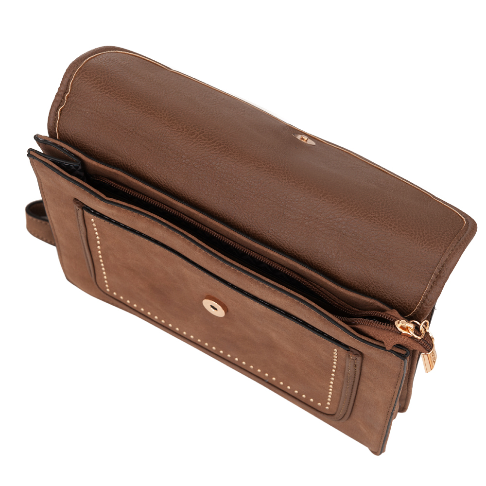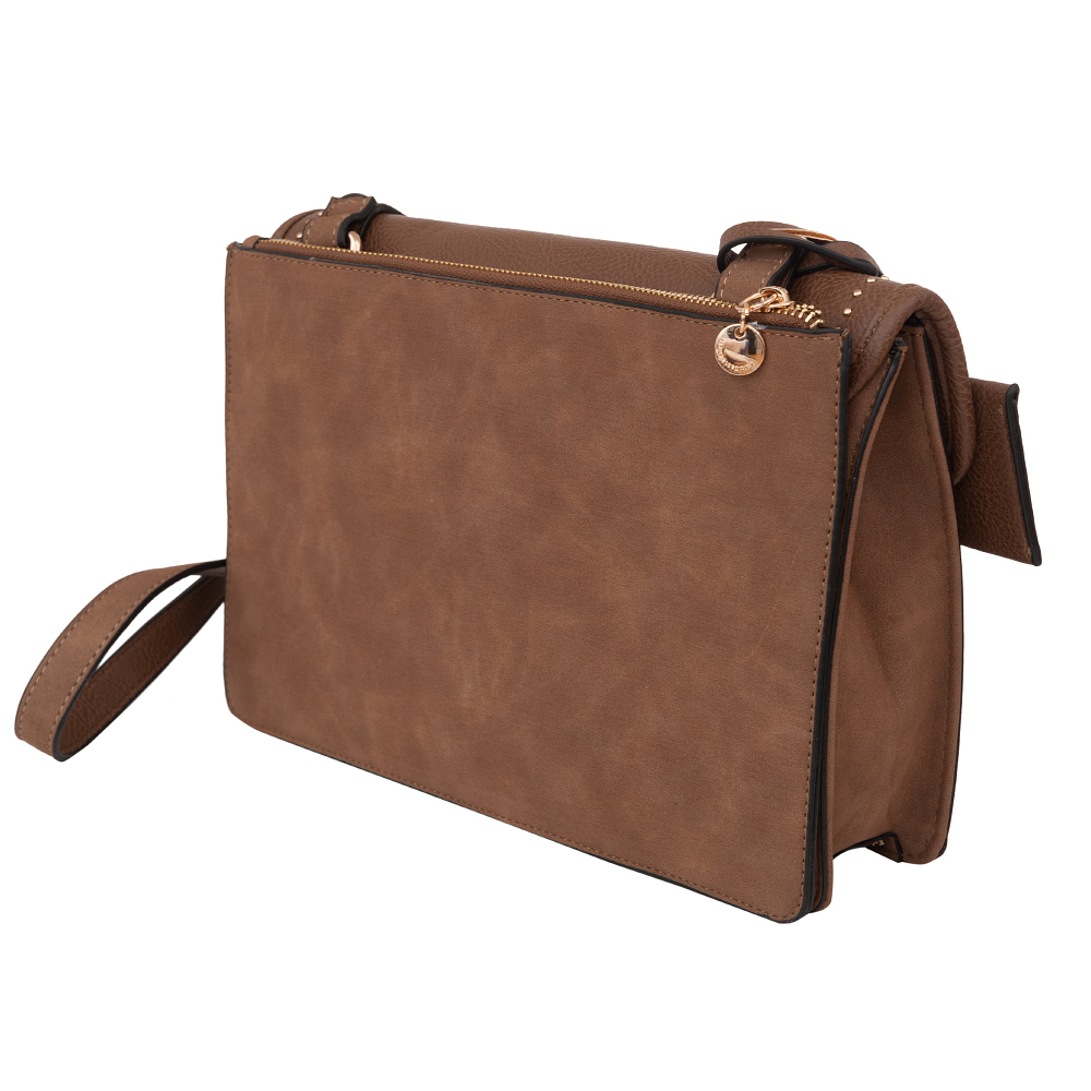 Modna torebka z misiem wykonana z wysokogatunkowej miękkiej skóry ekologicznej. Zamykana na zamek + klapa na magnes. Torebka jednokomorowa + w środku jedna kieszonka na zamek oraz jedna na telefon + kieszonka na klucze. Zewnątrz z przodu kieszonka wsuwna pod klapą + z tyłu duża kieszeń na zamek. Wnętrze wykończone trwałą, materiałową podszewką kolorystycznie dopasowaną do skóry. Długi, regulowany pasek umożliwia wygodne noszenie na ramieniu lub przez ramię jak listonoszkę. Metalowe elementy w kolorze złotym. Przy pasku dodatkowa saszetka na zatrzask.