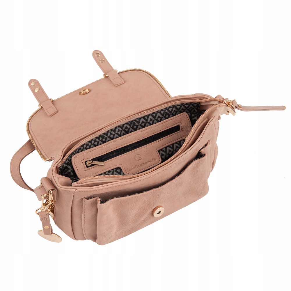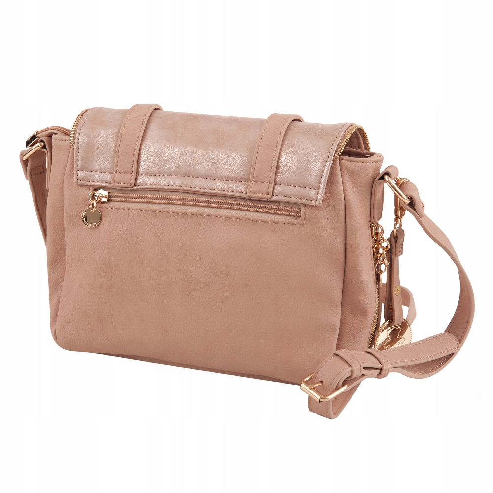 Długi, regulowany pasek umożliwia wygodne noszenie na ramieniu lub przez ramię jak listonoszkę. Metalowe elementy w kolorze złotym.