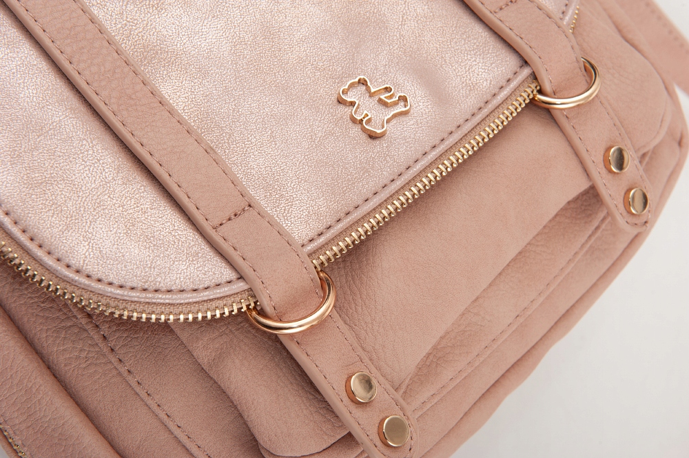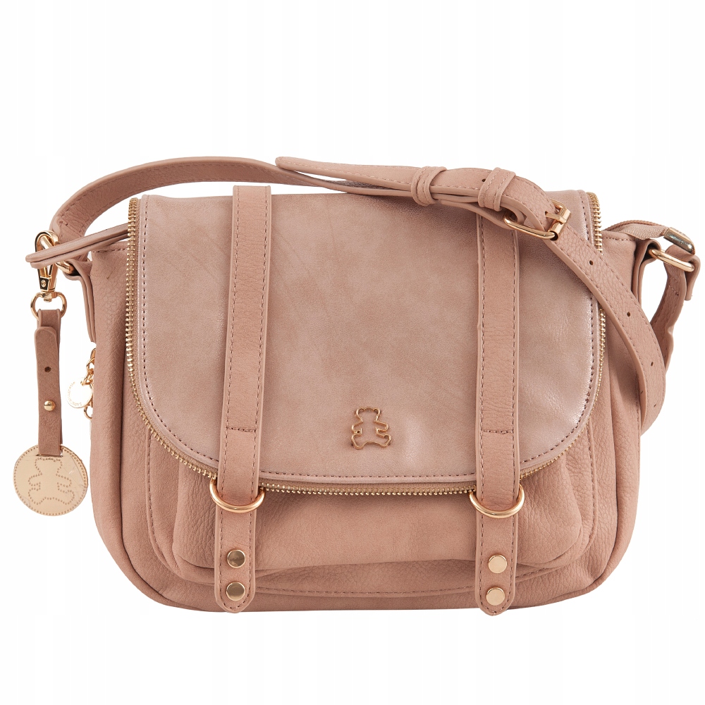 Modna torebka z misiem wykonana z wysokogatunkowej miękkiej skóry ekologicznej. Zamykana na suwak + klapa. Torebka jednokomorowa. W środku 2 x kieszonka na zamek oraz jedna na telefon + kieszonka na klucze + wsuwna kieszonka pod klapką.