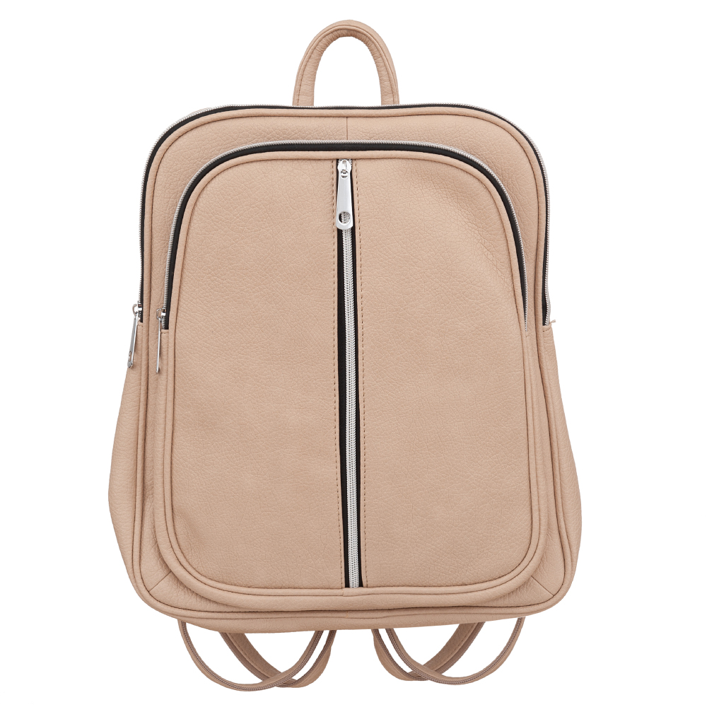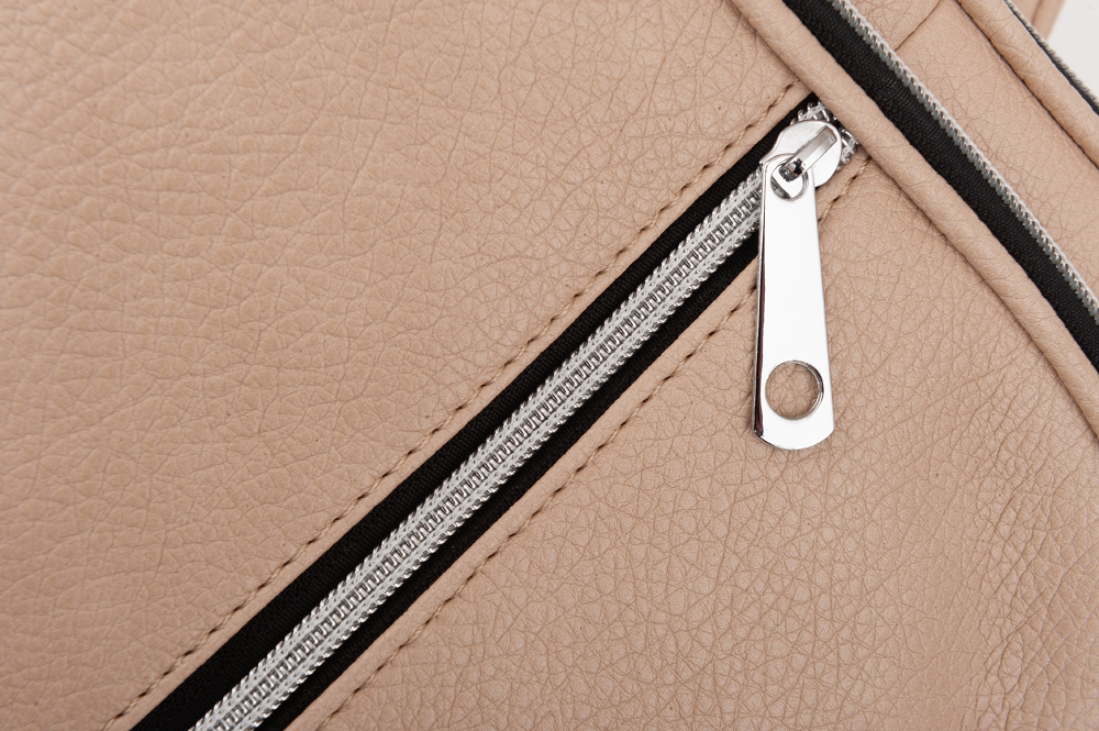 Modny A4 plecak wykonany z wysokogatunkowej skóry ekologicznej wysokiej jakości. Zamykany dookoła na zamek. Metalowe elementy w kolorze srebrnym. Plecak dwukomorowy, osobno zamykane przegrody, zorganizowany w środku + wewnątrz kieszonka na zamek, jedna wsuwna np. na telefon + kieszonka pionowa na przodzie. Wnętrze wykończone trwałą, bawełnianą podszewką. Dodatkowo z tyłu pozioma kieszonka na zamek. Możliwość noszenia w dłoni lub jako plecak.