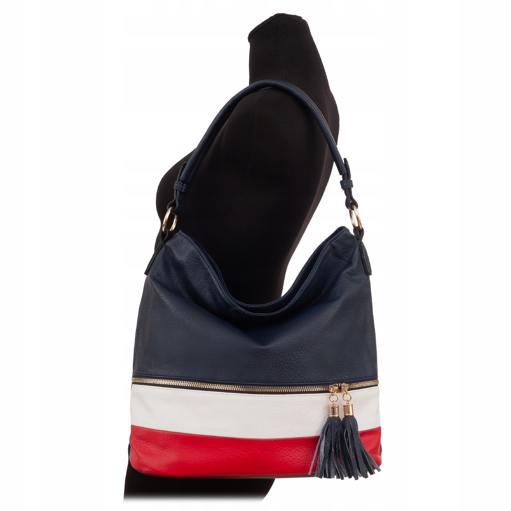 Torebka jednokomorowa, przedzielona na środku dużą kieszenią na zamek, zorganizowana + wewnątrz kieszonka na zamek, jedna na telefon + duża kieszeń na zamek + wsuwna kieszonka na drobiazgi.