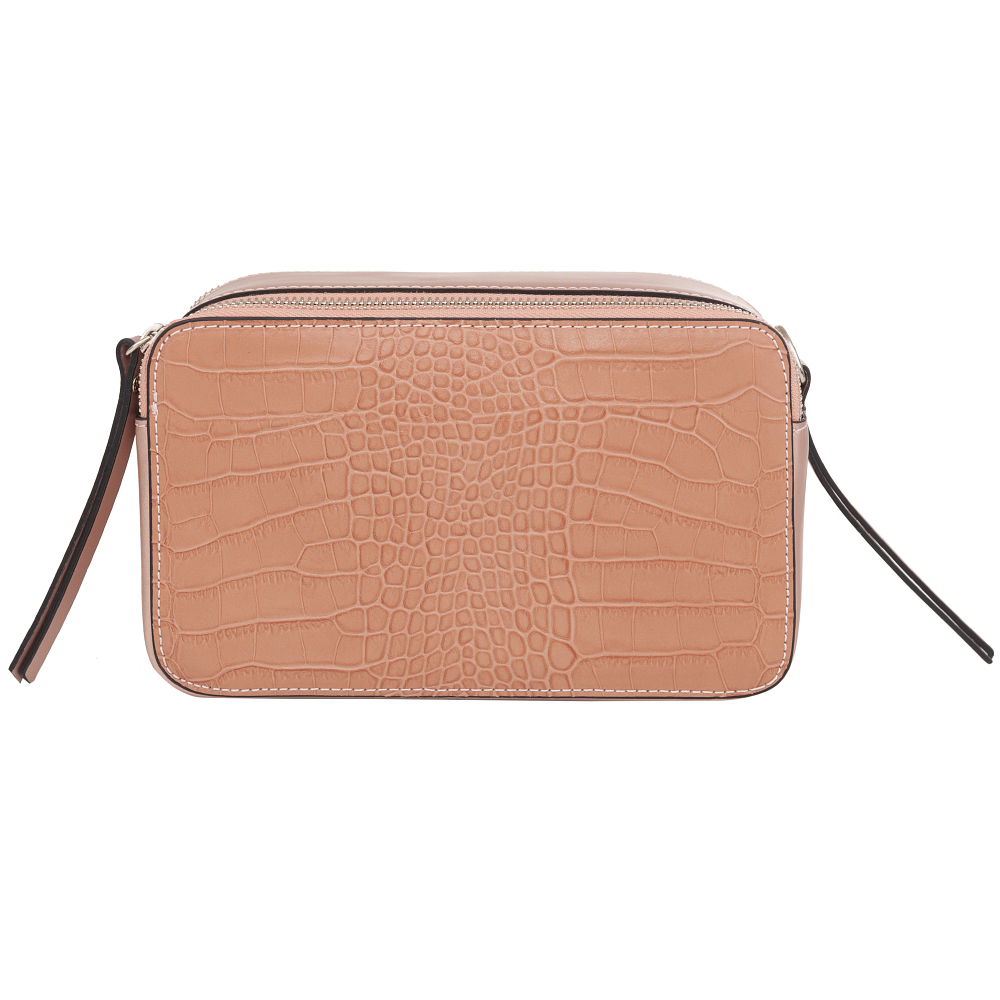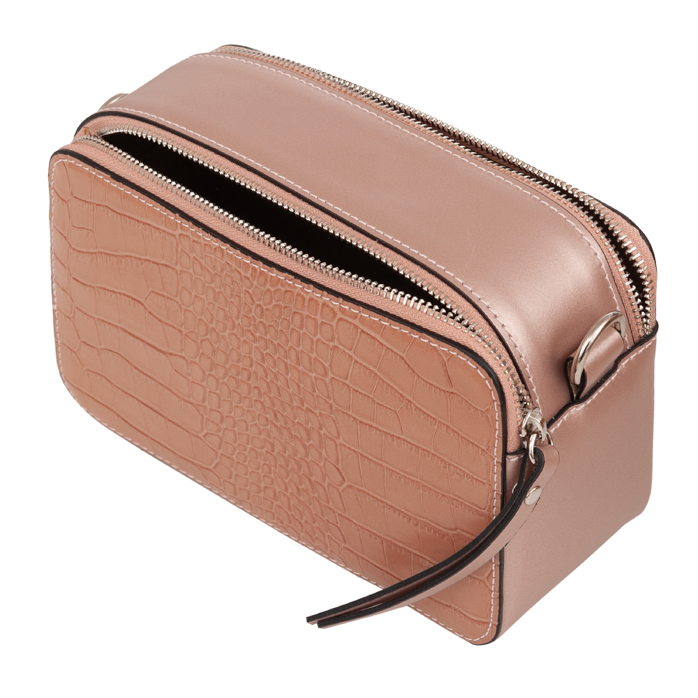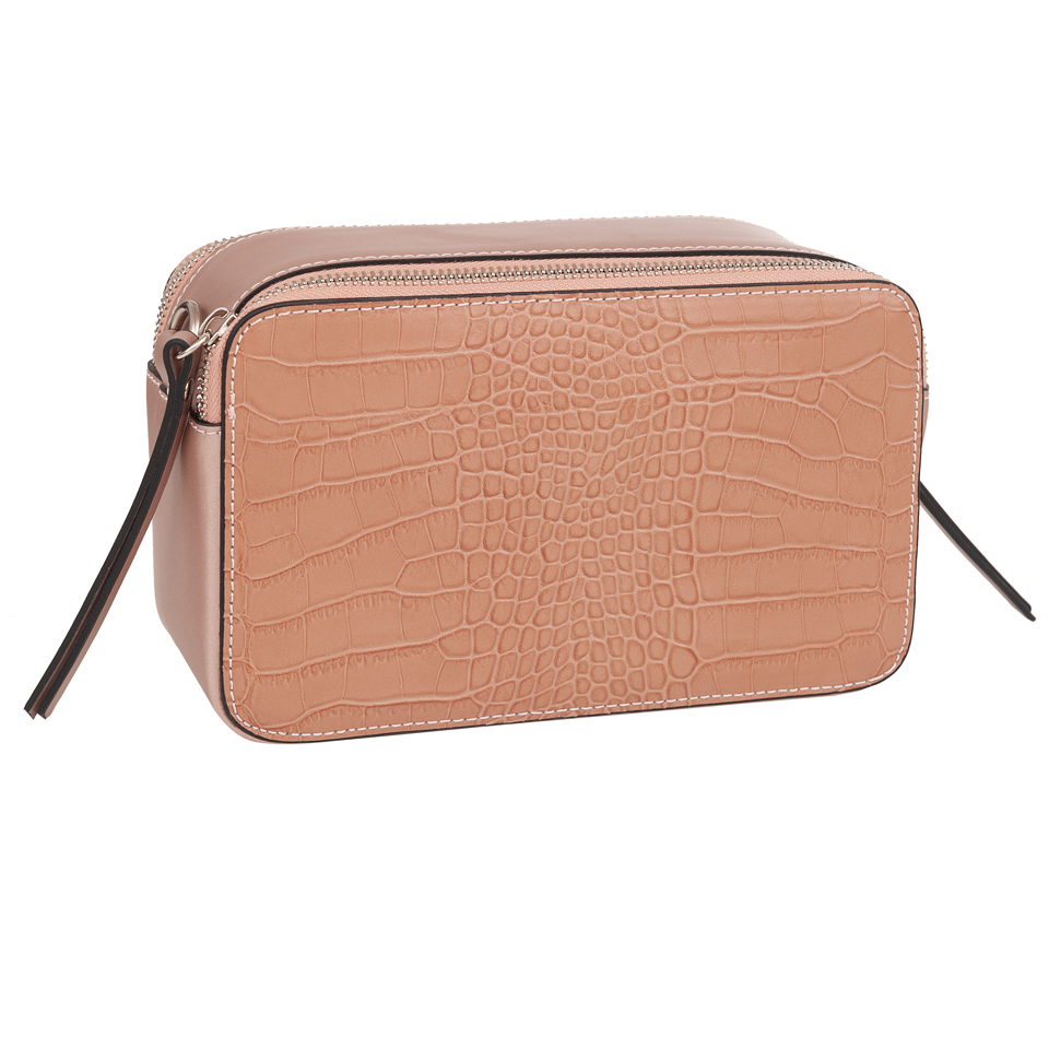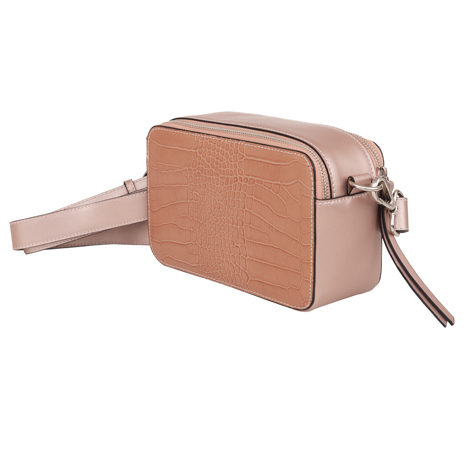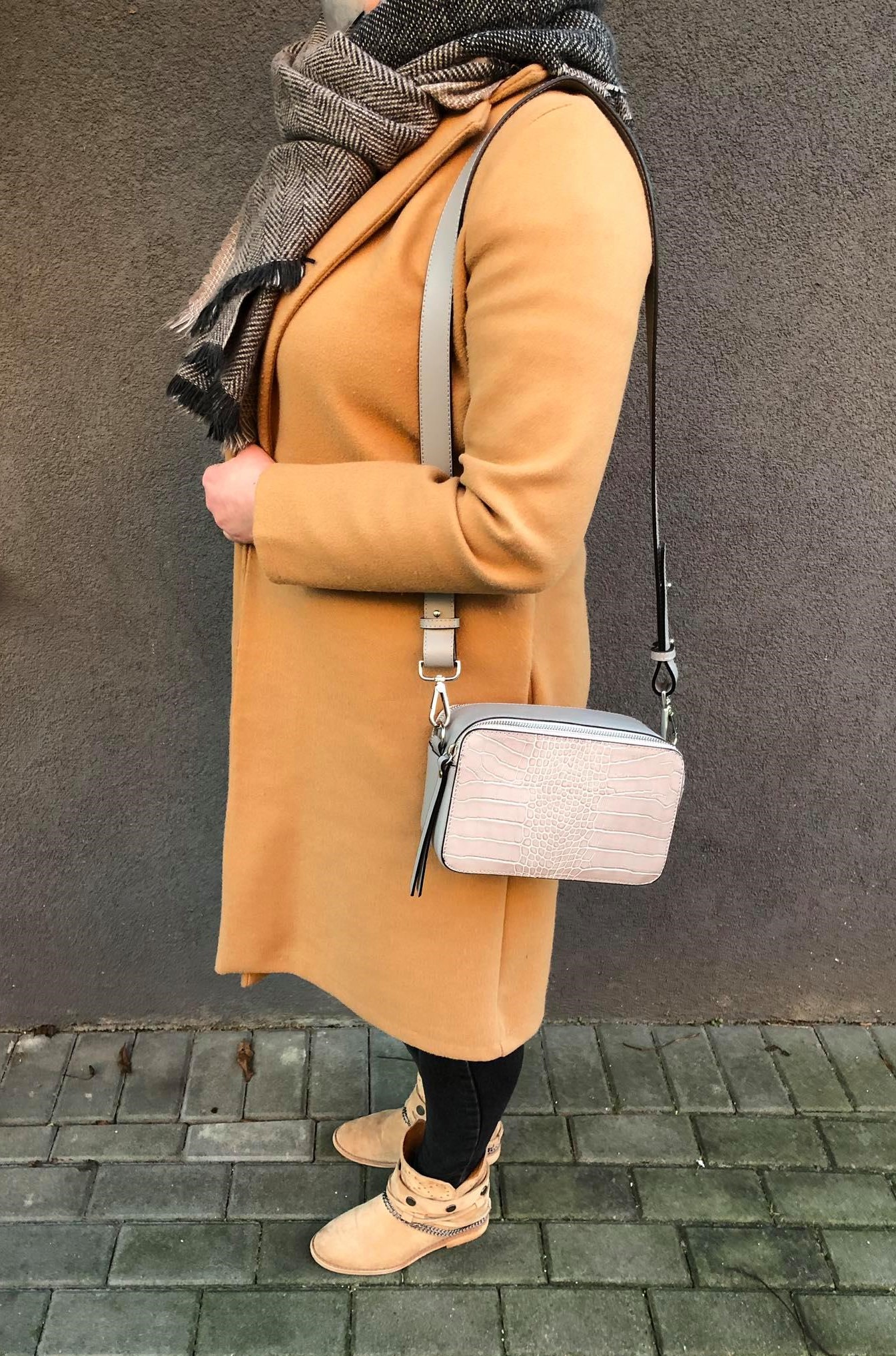 Włoska skórzana torebka listonoszka wykonana z wysokogatunkowej naturalnej skóry firmy VERA PELLE. Zamykana z góry na zamek. Torebka jednokomorowa, dwa wejścia do jednej przegrody. Elementy wykończenia w kolorze srebrnym. Skórzany szeroki pasek (3cm) z możliwością całkowitego odpięcia, dzięki czemu torebkę można nosić jako elegancką kopertówkę. Z przodu i z tyłu wstawka ze skóry z fakturą łuski krokodyla.