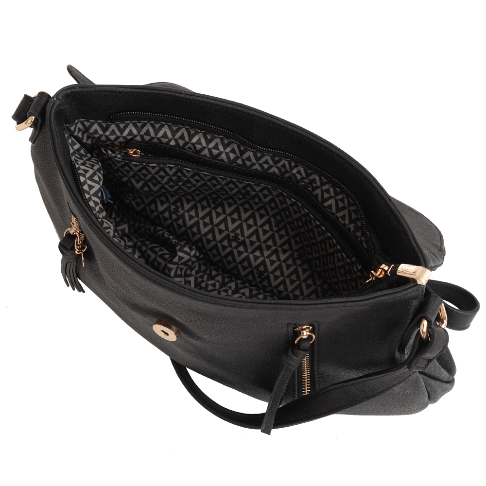 Modna torebka z misiem wykonana z wysokogatunkowej miękkiej skóry ekologicznej. Zamykana na zamek na całej szerokości + klapa z magnesem. Torebka jednokomorowa + w środku 2 x kieszonka na zamek oraz jedna na telefon + kieszonka na klucze. Zewnątrz z przodu 2 x kieszonka na zamek + z tyłu kieszonka na zamek. Wnętrze wykończone trwałą, materiałową podszewką kolorystycznie dopasowaną do skóry. Długi, regulowany pasek umożliwia wygodne noszenie na ramieniu lub przez ramię jak listonoszkę. Metalowe elementy w kolorze złotym.