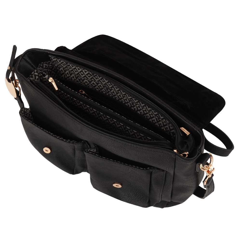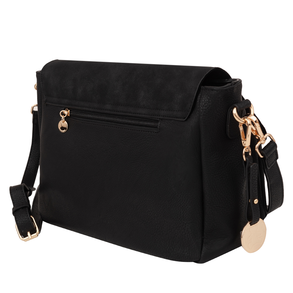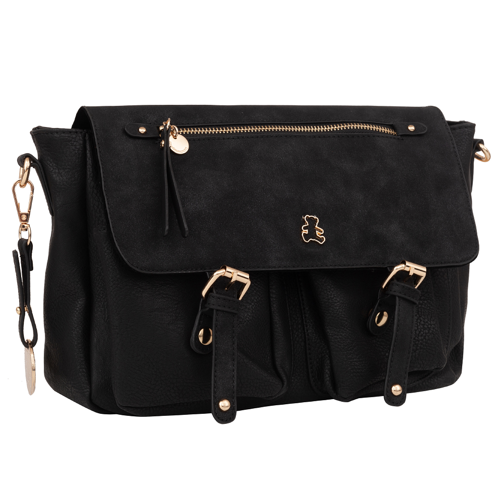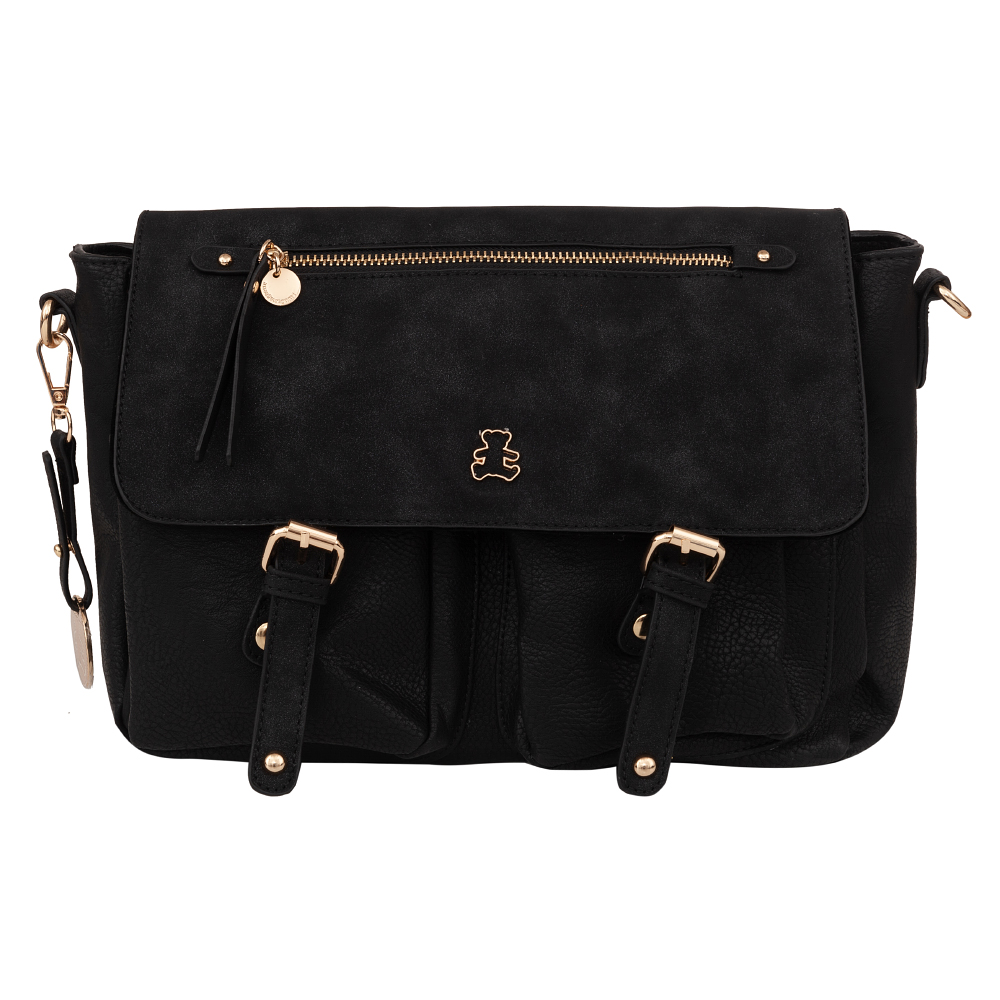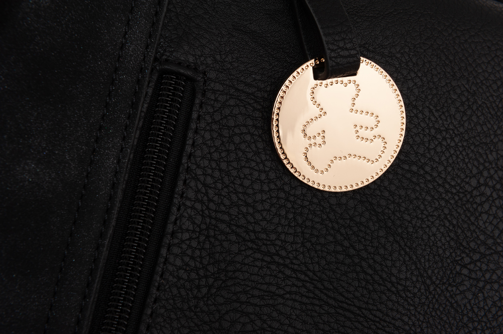 Modna torebka z misiem wykonana z wysokogatunkowej miękkiej skóry ekologicznej. Zamykana na suwak + klapa. Torebka dwukomorowa przedzielona dużą kieszenią na suwak na całą szerokość torebki + w środku 2 x kieszonka na zamek oraz jedna na telefon + kieszonka na klucze. Zewnątrz z przodu 2 x kieszonka wsuwna + z tyłu kieszonka na zamek. Wnętrze wykończone trwałą, materiałową podszewką kolorystycznie dopasowaną do skóry. Długi, regulowany pasek umożliwia wygodne noszenie na ramieniu lub przez ramię jak listonoszkę. Metalowe elementy w kolorze złotym. Z boku torebki modny pęk z frędzlem i misiem.