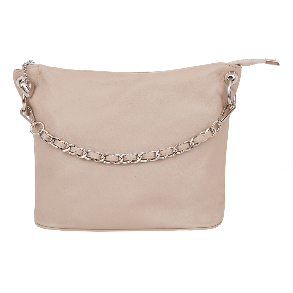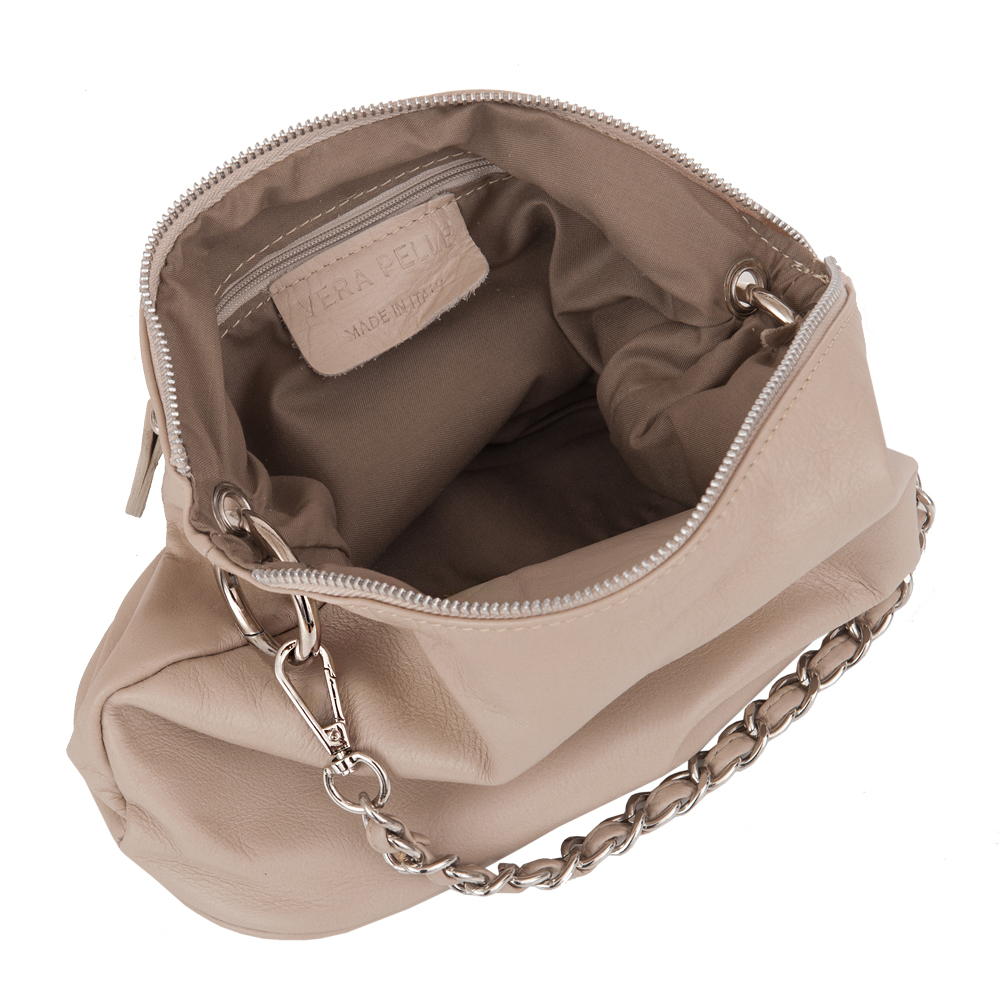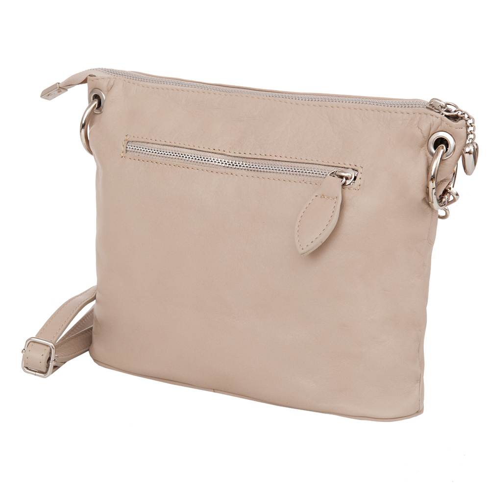 Włoska pojemna miękka skórzana torebka / listonoszka wykonana z naturalnej gładkiej skóry cielęcej. Zamykana od góry na zamek na całej szerokości torebki. Torebka jednokomorowa, wewnątrz jedna kieszonka na zamek + dwie dodatkowe kieszonki. Wnętrze wykończone trwałą, ciemną podszewką. Długi, regulowany pasek umożliwia wygodne noszenie na ramieniu lub przez ramię. Dodatkowa pojemna kieszeń z tyłu na zamek. Elementy wykończenia w kolorze srebrnym. Możliwość noszenia w ręce na łańcuszku ( łańcuszek jest również całkowicie wypinany ). Długi skórzany pasek w komplecie.