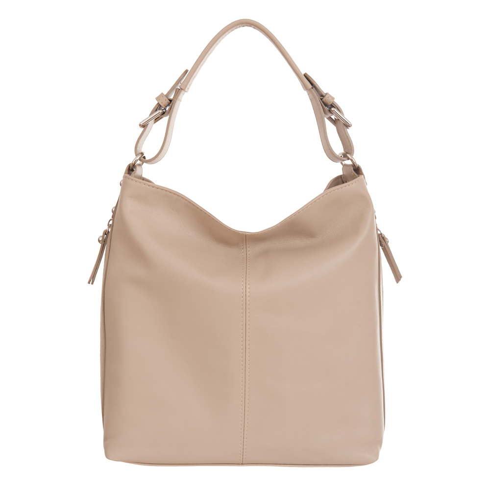 Włoska pojemna miękka skórzana torebka / worek wykonana z wysokogatunkowej naturalnej gładkiej skóry cielęcej. Zamykana od góry na zamek na całej szerokości torebki. Torebka jednokomorowa przedzielona na środku dużą kieszenią na zamek + wewnątrz dodatkowo jedna kieszonka na zamek, oraz dwie kieszonki w tym jedna na telefon. Z tyłu pojemna kieszeń na zamek. Wnętrze wykończone trwałą podszewką. Szerokie ucho (3cm) umożliwia wygodne noszenie na ramieniu. W komplecie długi, regulowany pasek (max. długość 102 cm). Elementy wykończenia w kolorze srebrnym. Po bokach torebki dodatkowo pionowe kieszenie na zamek.