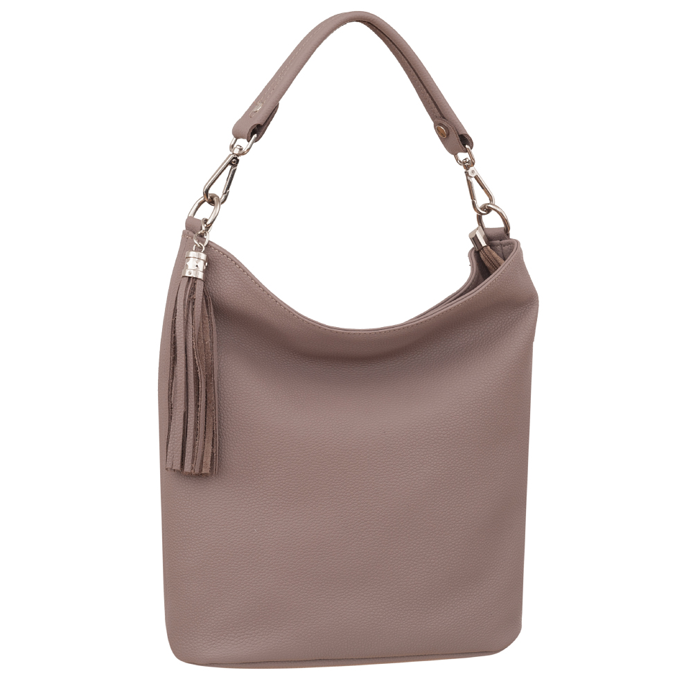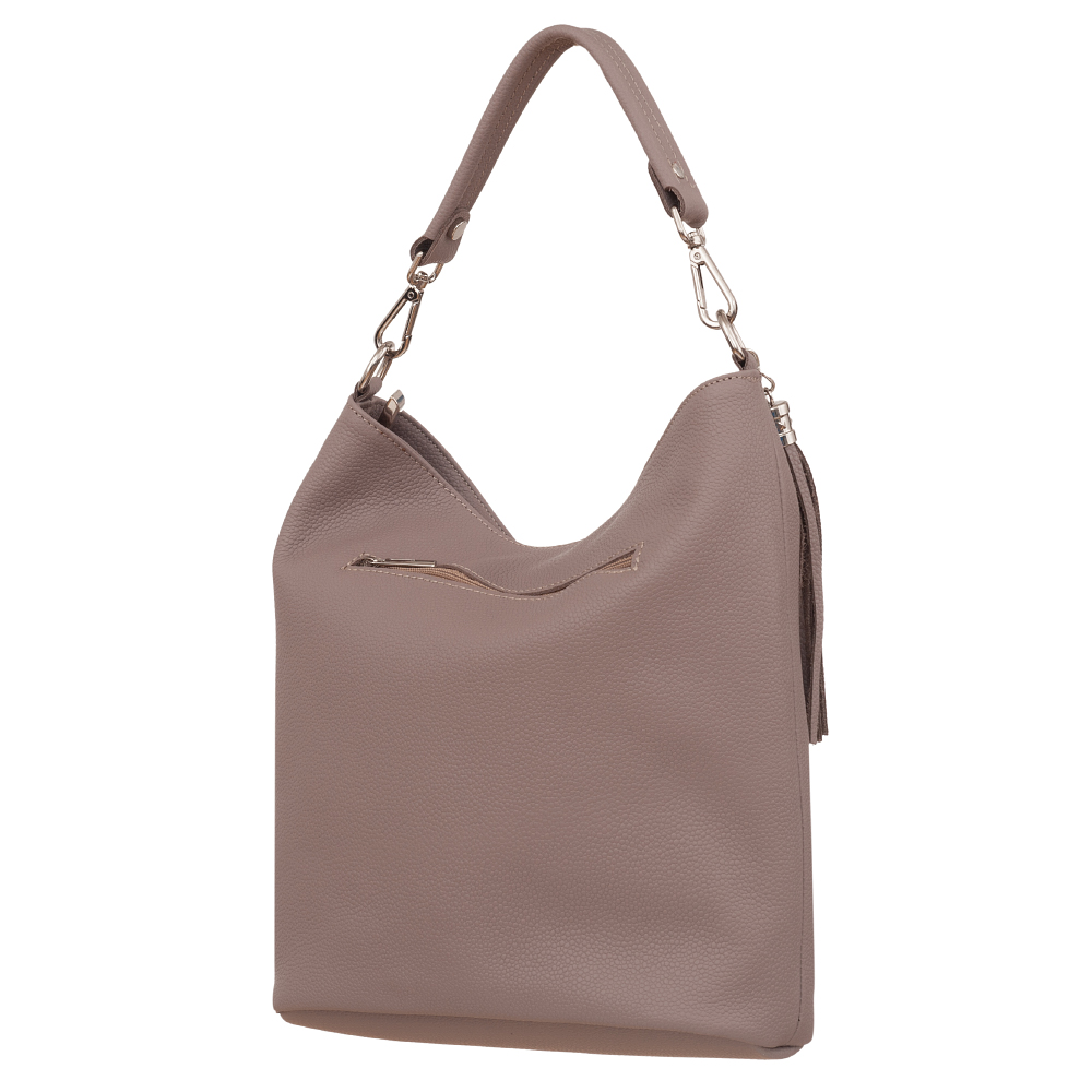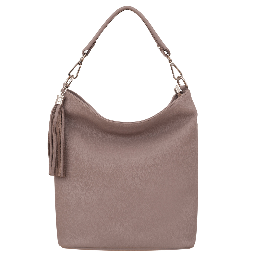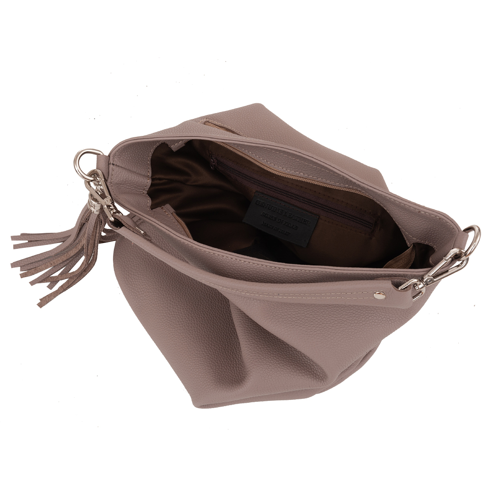 Vera Pelle - Włoska pojemna miękka skórzana torebka worek wykonana z wysokogatunkowej naturalnej skóry licowej. Zamykana od góry na zamek na całej szerokości. Torebka jednokomorowa + wewnątrz dodatkowo jedna kieszonka na zamek, z tyłu pojemna kieszeń na zamek. Wnętrze wykończone trwałą, materiałową podszewką. Miękkie ucho umożliwia wygodne noszenie na ramieniu. W komplecie długi, regulowany pasek . Elementy wykończenia w kolorze srebrnym. Dno lekko usztywnione. Modnym elementem jest pęk frędzli.