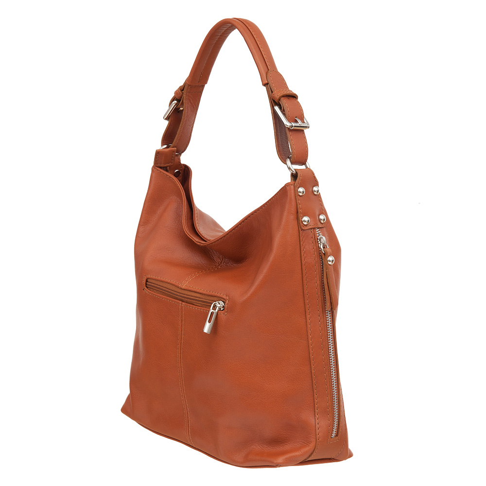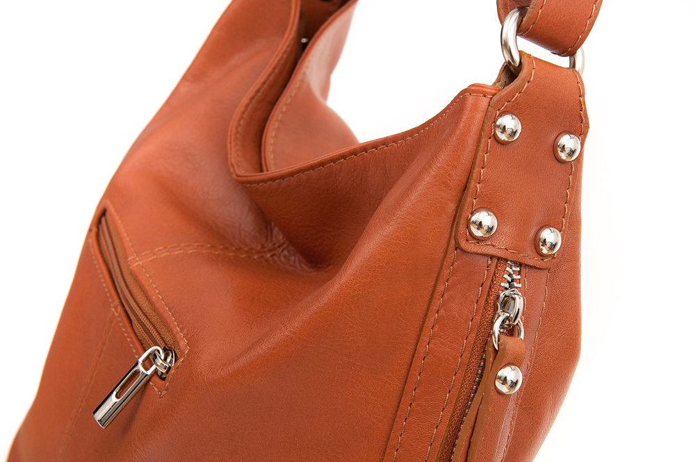 Włoska pojemna miękka skórzana torebka / worek wykonana z wysokogatunkowej naturalnej gładkiej skóry cielęcej. Zamykana od góry na zamek na całej szerokości torebki. Torebka jednokomorowa przedzielona na środku dużą kieszenią na zamek + wewnątrz dodatkowo jedna kieszonka na zamek, oraz dwie kieszonki w tym jedna na telefon. Z tyłu pojemna kieszeń na zamek. Wnętrze wykończone trwałą podszewką. Szerokie ucho (3cm) umożliwia wygodne noszenie na ramieniu. W komplecie długi, regulowany pasek (max. długość 102 cm). Elementy wykończenia w kolorze srebrnym. Po bokach torebki dodatkowo pionowe kieszenie na zamek.