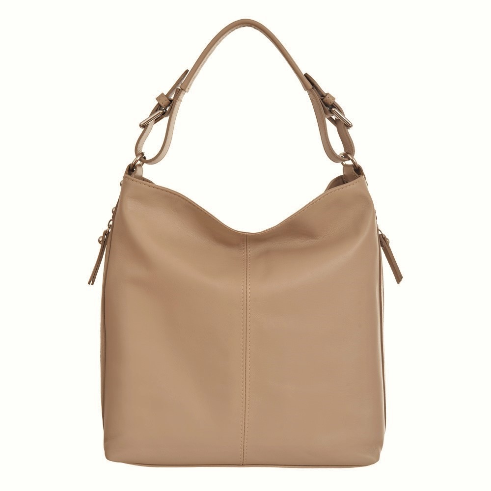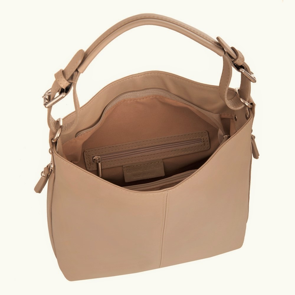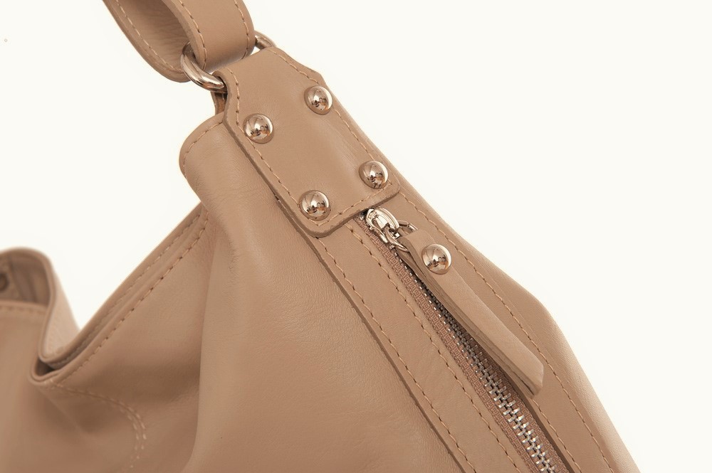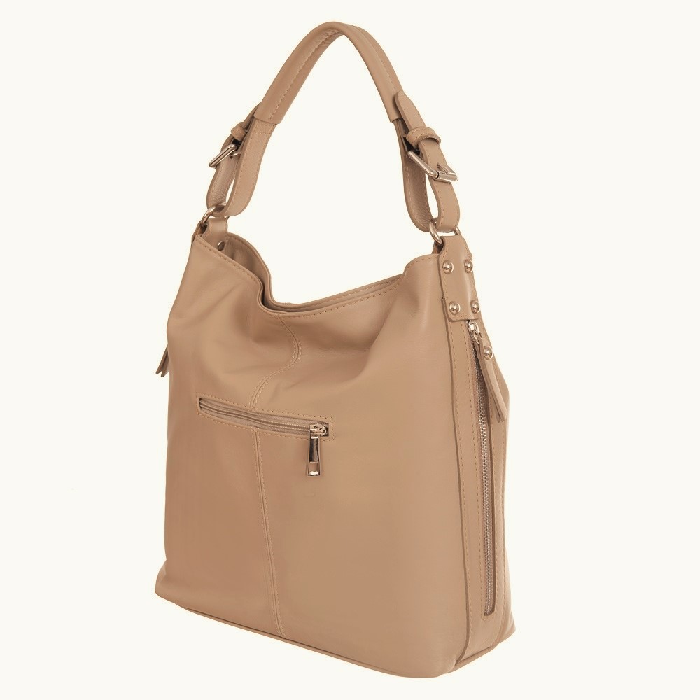 Włoska pojemna miękka skórzana torebka / worek wykonana z wysokogatunkowej naturalnej gładkiej skóry cielęcej. Zamykana od góry na zamek na całej szerokości torebki. Torebka jednokomorowa przedzielona na środku dużą kieszenią na zamek + wewnątrz dodatkowo jedna kieszonka na zamek, oraz dwie kieszonki w tym jedna na telefon. Z tyłu pojemna kieszeń na zamek. Wnętrze wykończone trwałą podszewką. Szerokie ucho (3cm) umożliwia wygodne noszenie na ramieniu. W komplecie długi, regulowany pasek (max. długość 102 cm). Elementy wykończenia w kolorze srebrnym. Po bokach torebki dodatkowo pionowe kieszenie na zamek.