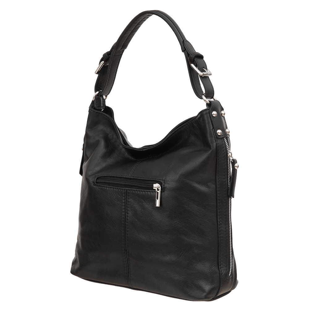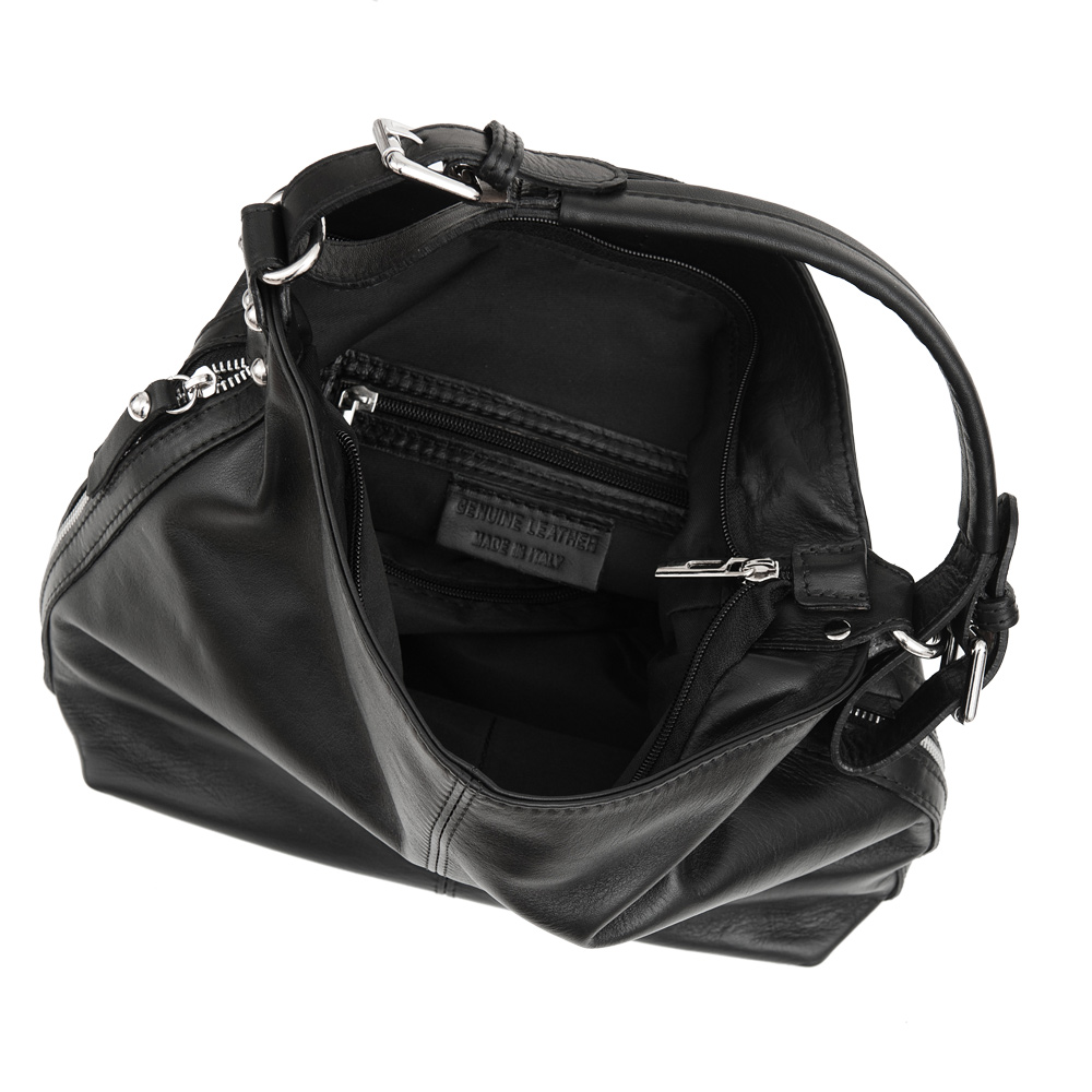 Włoska pojemna miękka skórzana torebka / worek wykonana z wysokogatunkowej naturalnej gładkiej skóry cielęcej. Zamykana od góry na zamek na całej szerokości torebki. Torebka jednokomorowa przedzielona na środku dużą kieszenią na zamek + wewnątrz dodatkowo jedna kieszonka na zamek, oraz dwie kieszonki w tym jedna na telefon. Z tyłu pojemna kieszeń na zamek. Wnętrze wykończone trwałą podszewką. Szerokie ucho (3cm) umożliwia wygodne noszenie na ramieniu. W komplecie długi, regulowany pasek (max. długość 102 cm). Elementy wykończenia w kolorze srebrnym. Po bokach torebki dodatkowo pionowe kieszenie na zamek.