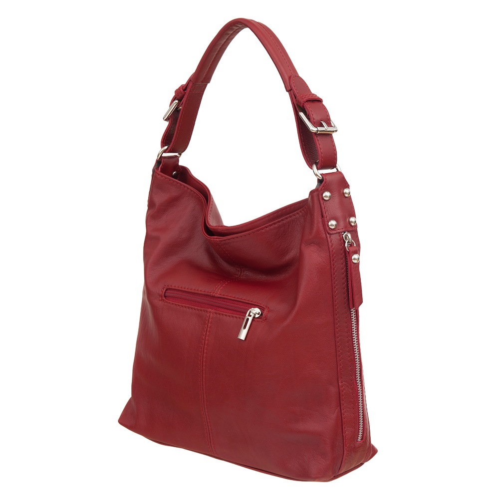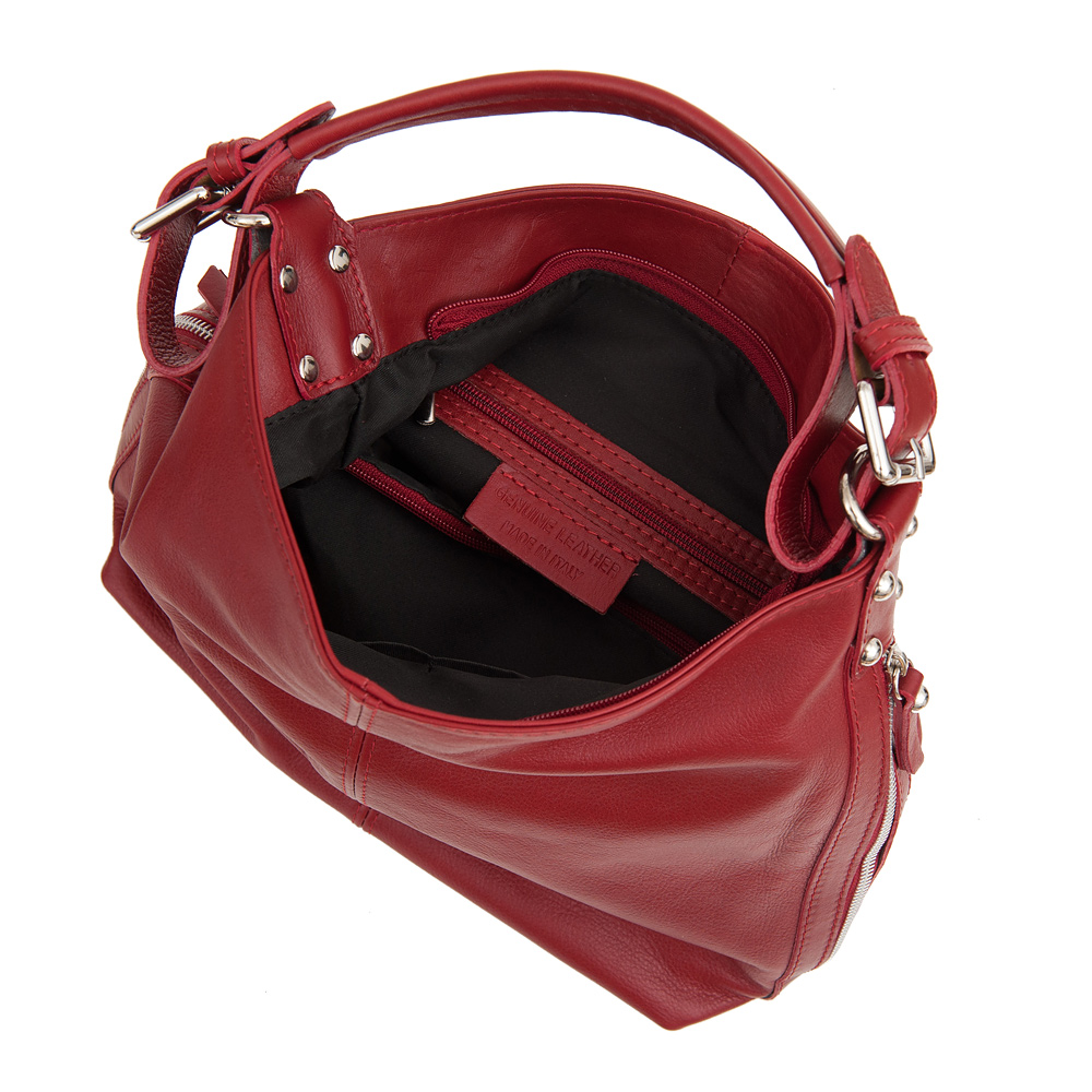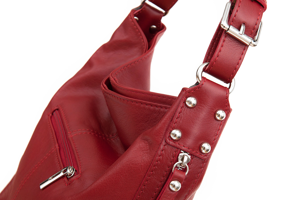 Włoska pojemna miękka skórzana torebka / worek wykonana z wysokogatunkowej naturalnej gładkiej skóry cielęcej. Zamykana od góry na zamek na całej szerokości torebki. Torebka jednokomorowa przedzielona na środku dużą kieszenią na zamek + wewnątrz dodatkowo jedna kieszonka na zamek, oraz dwie kieszonki w tym jedna na telefon. Z tyłu pojemna kieszeń na zamek. Wnętrze wykończone trwałą podszewką. Szerokie ucho (3cm) umożliwia wygodne noszenie na ramieniu. W komplecie długi, regulowany pasek (max. długość 102 cm). Elementy wykończenia w kolorze srebrnym. Po bokach torebki dodatkowo pionowe kieszenie na zamek.