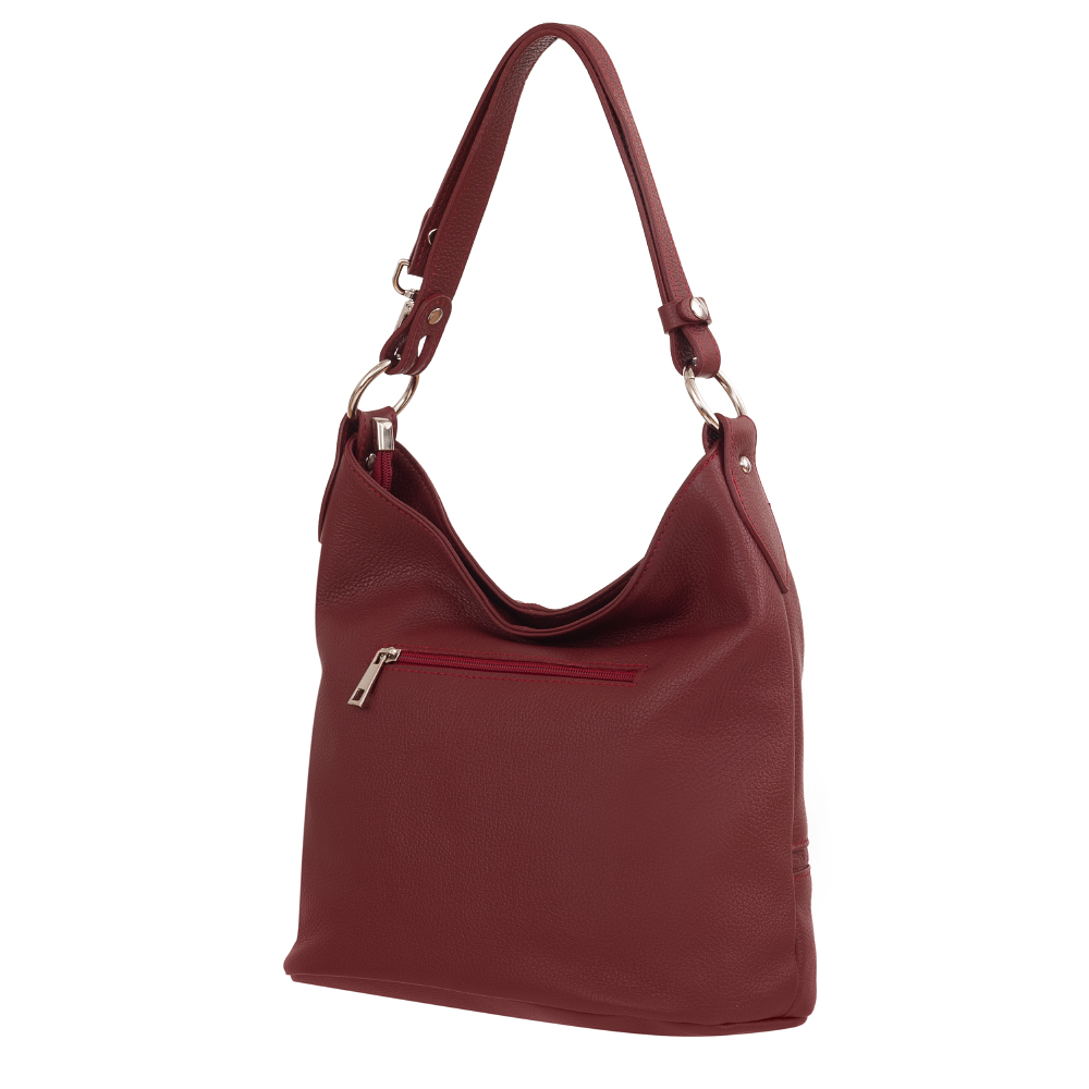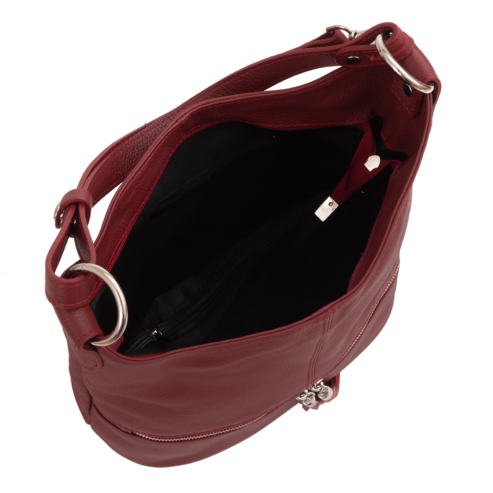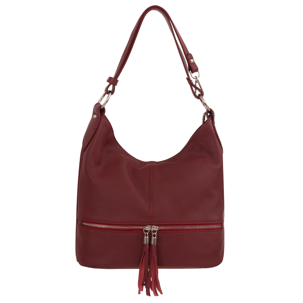 Vera Pelle - Włoska pojemna miękka skórzana torebka worek wykonana z wysokogatunkowej naturalnej skóry licowej. Zamykana od góry na zamek na całej szerokości. Torebka jednokomorowa. Wewnątrz jedna kieszonka na zamek + dwie kieszonki na telefon i drobiazgi, z tyłu pojemna kieszeń na zamek. Wnętrze wykończone trwałą, czarną materiałową podszewką. Miękkie ucho o długości 42-84 cm umożliwia wygodne noszenie na ramieniu. Metalowe wykończenia w kolorze srebrnym. Dno lekko usztywnione. Modnym elementem jest pęk frędzli.