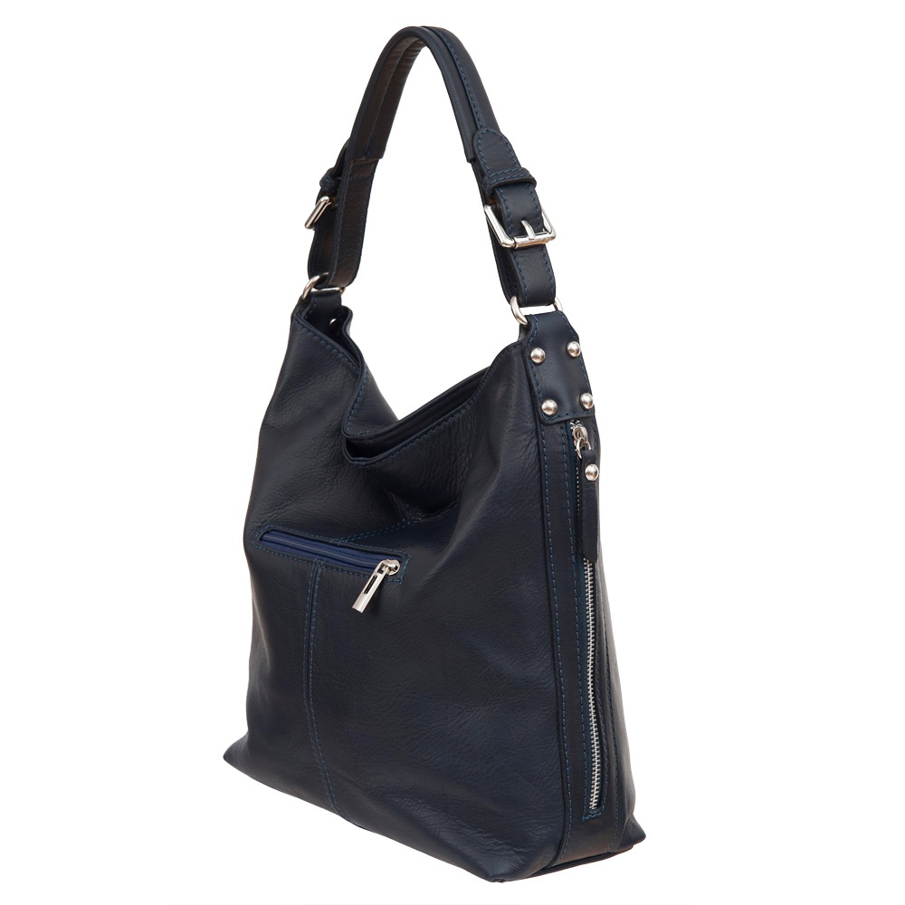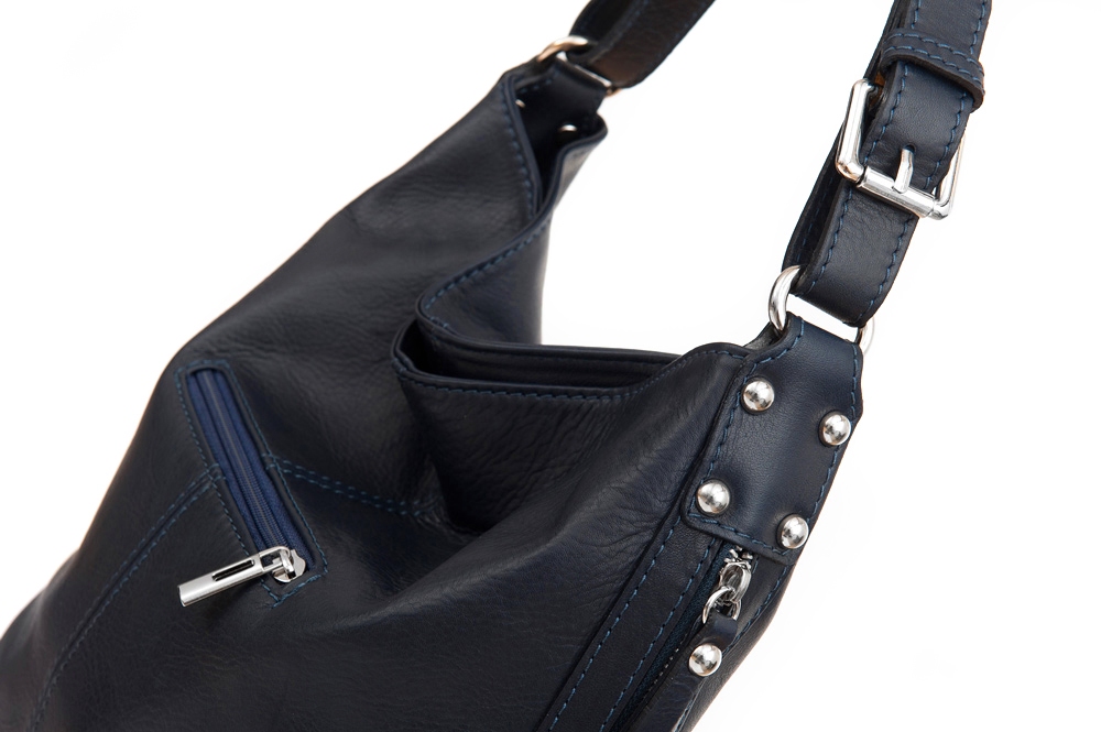 Włoska pojemna miękka skórzana torebka / worek wykonana z wysokogatunkowej naturalnej gładkiej skóry cielęcej. Zamykana od góry na zamek na całej szerokości torebki. Torebka jednokomorowa przedzielona na środku dużą kieszenią na zamek + wewnątrz dodatkowo jedna kieszonka na zamek, oraz dwie kieszonki w tym jedna na telefon. Z tyłu pojemna kieszeń na zamek. Wnętrze wykończone trwałą podszewką. Szerokie ucho (3cm) umożliwia wygodne noszenie na ramieniu. W komplecie długi, regulowany pasek (max. długość 102 cm). Elementy wykończenia w kolorze srebrnym. Po bokach torebki dodatkowo pionowe kieszenie na zamek.