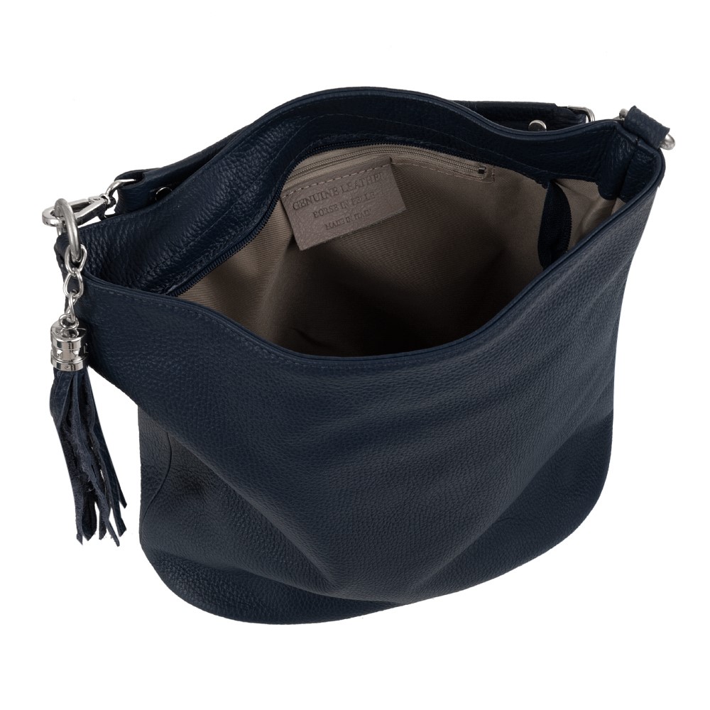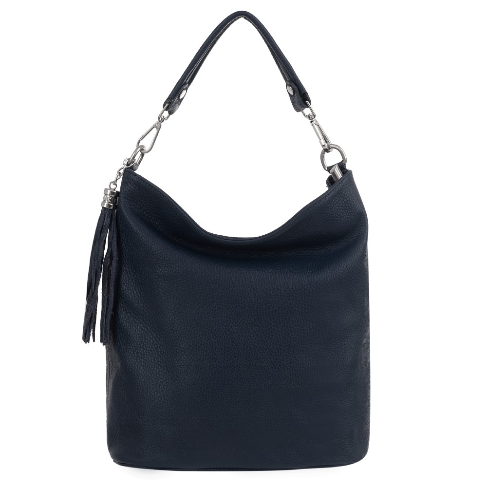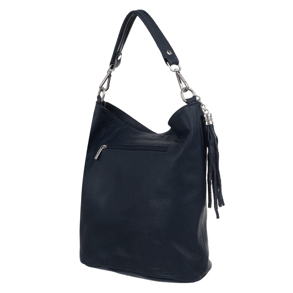 Vera Pelle - Włoska pojemna miękka skórzana torebka worek wykonana z wysokogatunkowej naturalnej skóry licowej. Zamykana od góry na zamek na całej szerokości. Torebka jednokomorowa + wewnątrz dodatkowo jedna kieszonka na zamek, z tyłu pojemna kieszeń na zamek. Wnętrze wykończone trwałą, materiałową podszewką. Miękkie ucho umożliwia wygodne noszenie na ramieniu. W komplecie długi, regulowany pasek . Elementy wykończenia w kolorze srebrnym. Dno lekko usztywnione. Modnym elementem jest pęk frędzli.