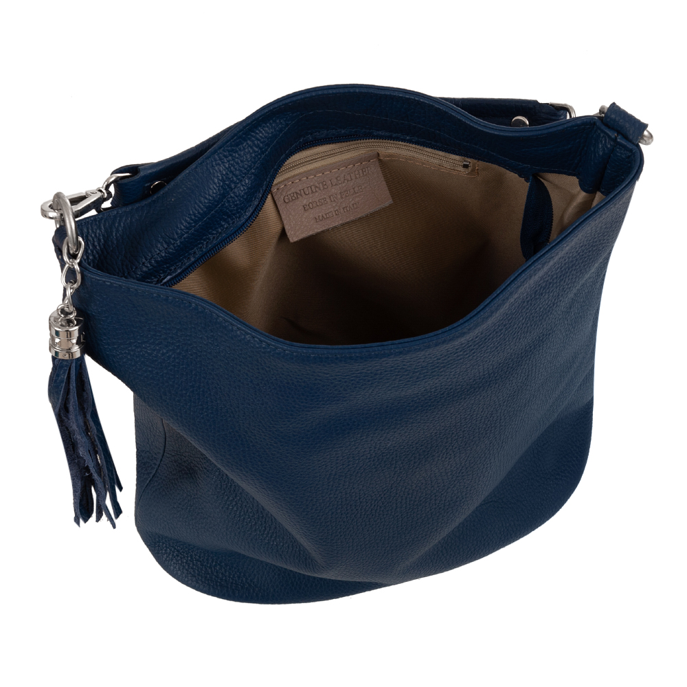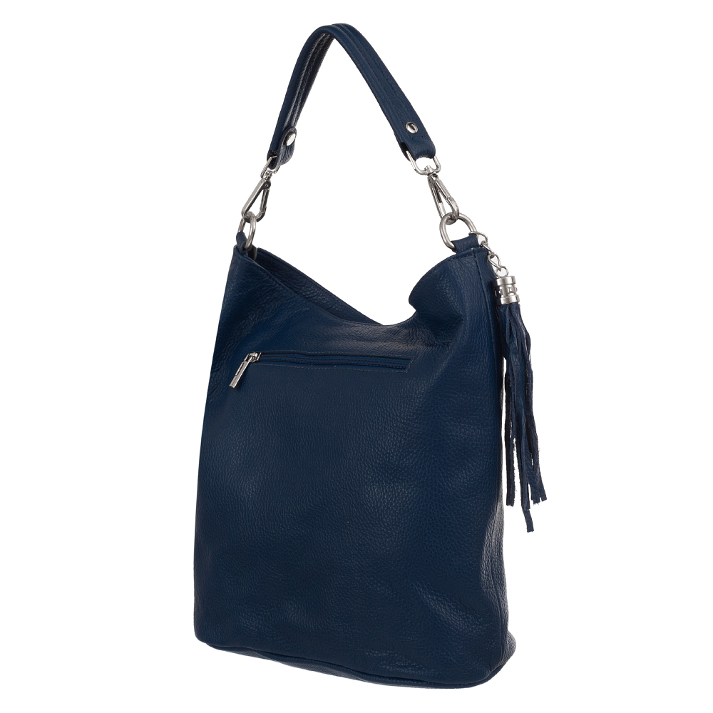 Vera Pelle - Włoska pojemna miękka skórzana torebka worek wykonana z wysokogatunkowej naturalnej skóry licowej. Zamykana od góry na zamek na całej szerokości. Torebka jednokomorowa + wewnątrz dodatkowo jedna kieszonka na zamek, z tyłu pojemna kieszeń na zamek. Wnętrze wykończone trwałą, materiałową podszewką. Miękkie ucho umożliwia wygodne noszenie na ramieniu. W komplecie długi, regulowany pasek . Elementy wykończenia w kolorze srebrnym. Dno lekko usztywnione. Modnym elementem jest pęk frędzli.
