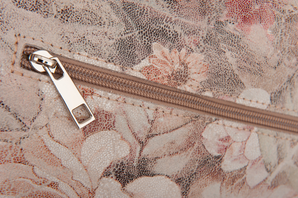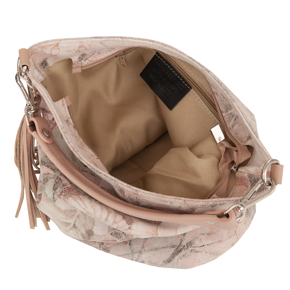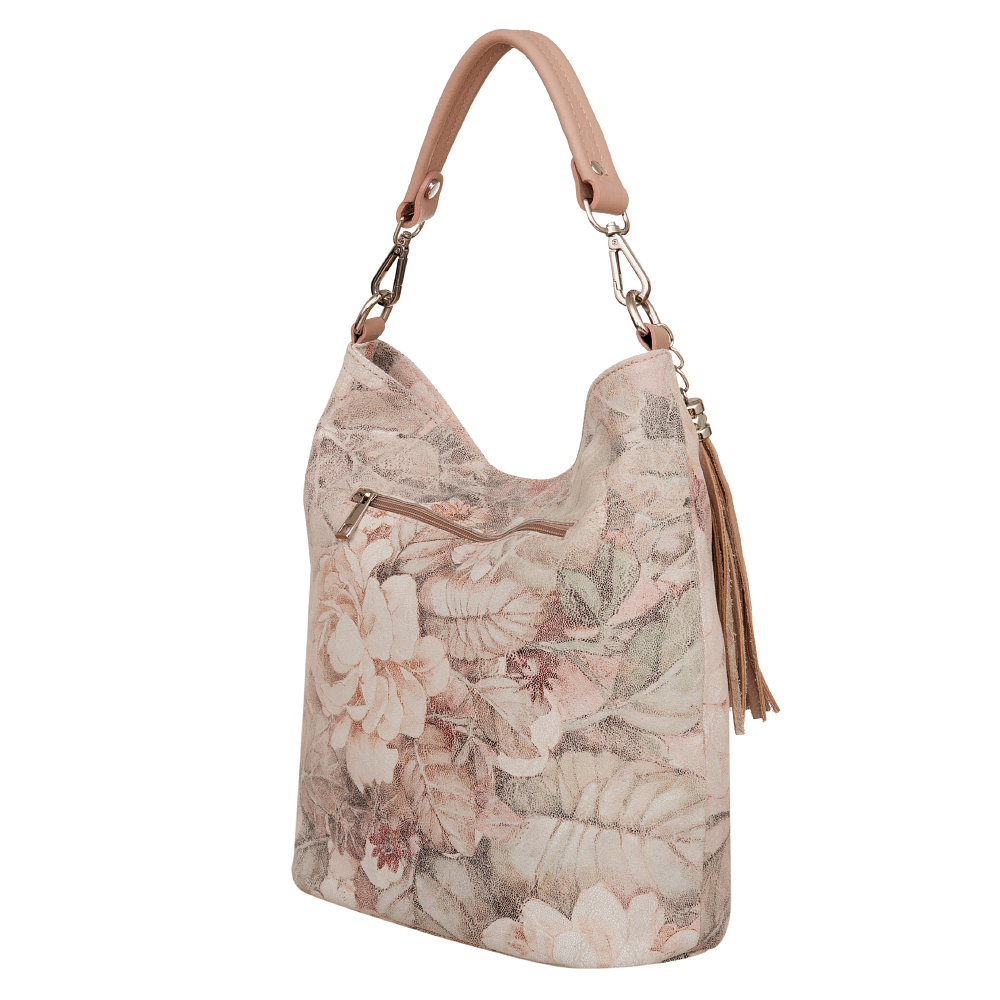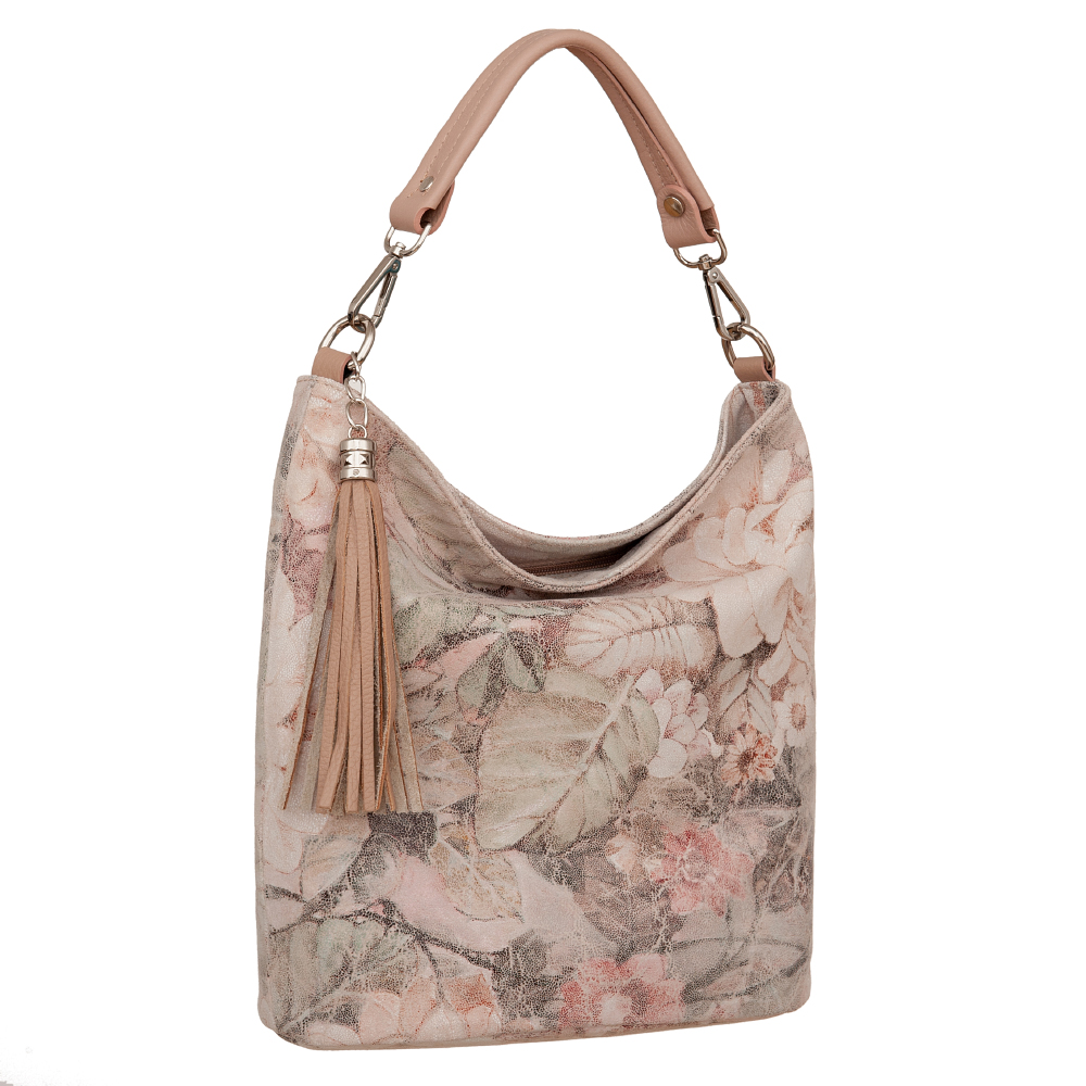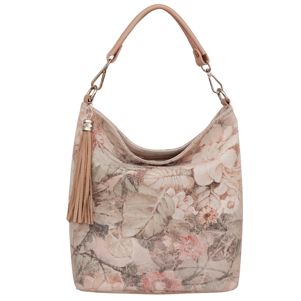 Vera Pelle - Włoska pojemna miękka skórzana torebka z motywem kwiatów wykonana z wysokogatunkowej naturalnej gładkiej skóry. Zamykana od góry na zamek na całej szerokości. Torebka jednokomorowa + wewnątrz dodatkowo jedna kieszonka na zamek, z tyłu pojemna kieszeń na zamek. Wnętrze wykończone trwałą, materiałową podszewką. Miękkie ucho umożliwia wygodne noszenie na ramieniu. W komplecie długi, regulowany pasek . Elementy wykończenia w kolorze srebrnym. Dno lekko usztywnione. Modnym elementem jest pęk frędzli.