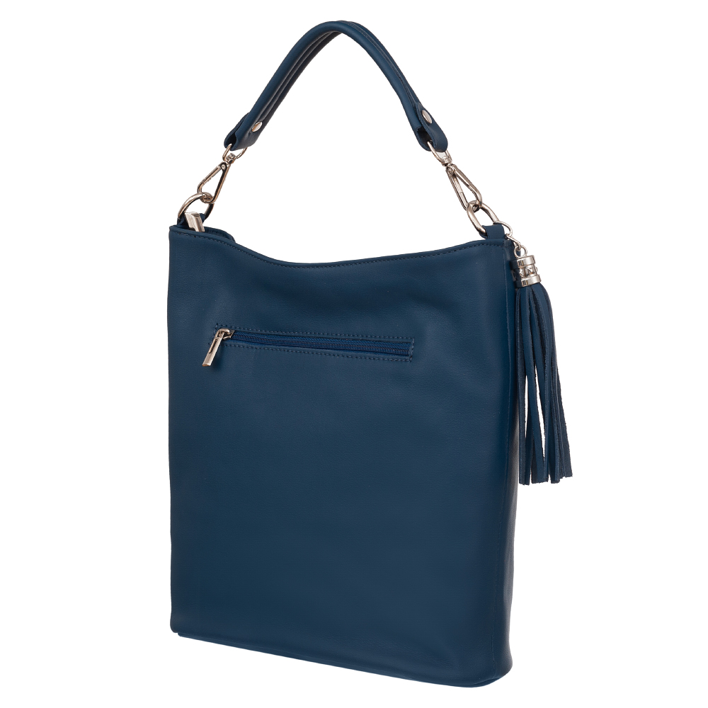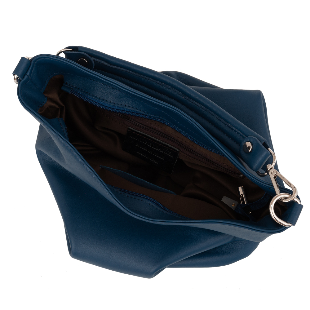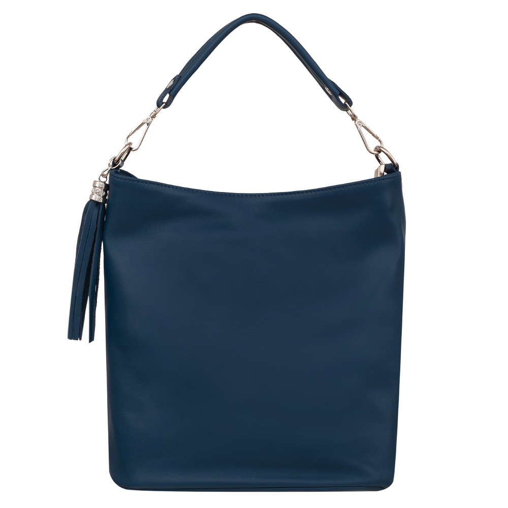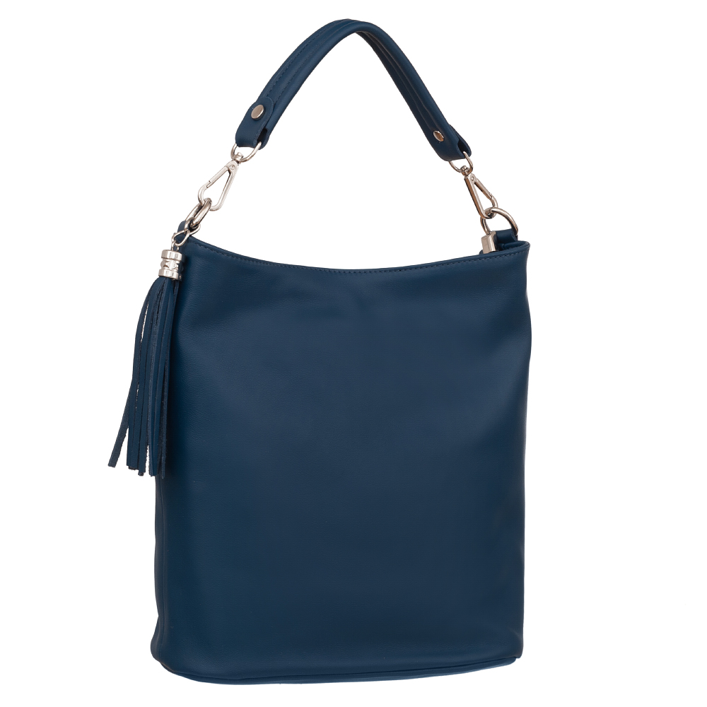 Vera Pelle - Włoska pojemna miękka skórzana torebka worek wykonana z wysokogatunkowej naturalnej skóry licowej. Zamykana od góry na zamek na całej szerokości. Torebka jednokomorowa + wewnątrz dodatkowo jedna kieszonka na zamek, z tyłu pojemna kieszeń na zamek. Wnętrze wykończone trwałą, materiałową podszewką. Miękkie ucho umożliwia wygodne noszenie na ramieniu. W komplecie długi, regulowany pasek . Elementy wykończenia w kolorze srebrnym. Dno lekko usztywnione. Modnym elementem jest pęk frędzli.